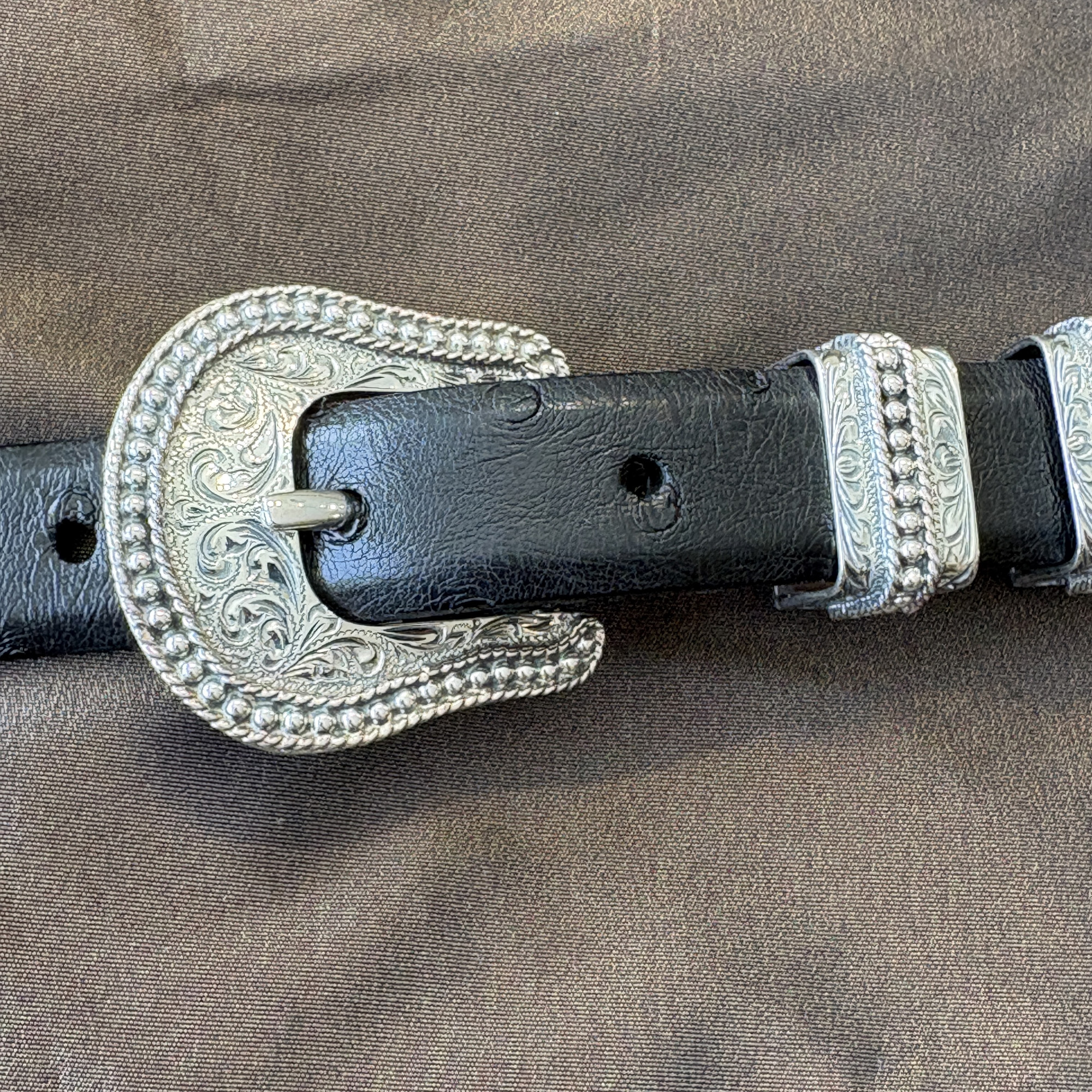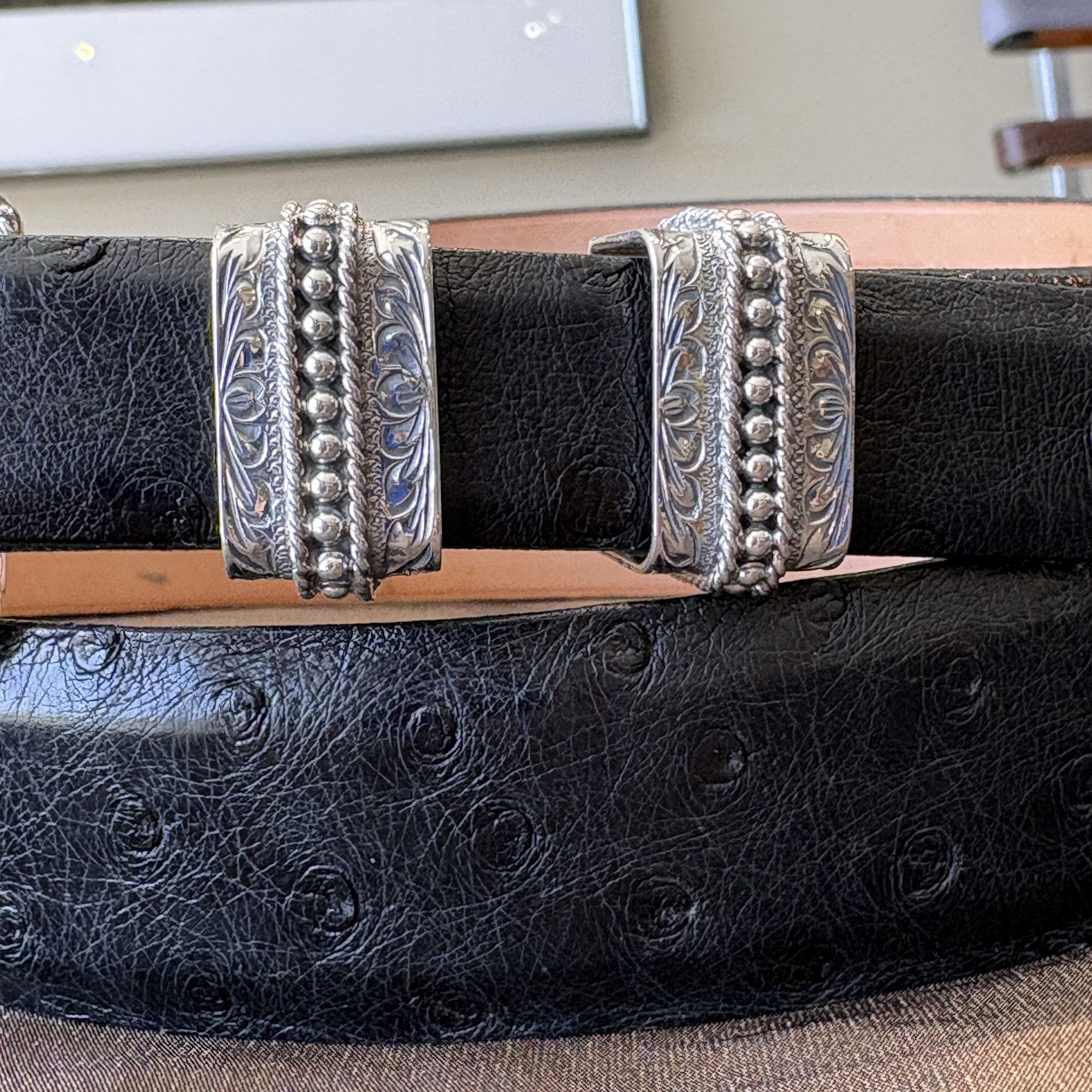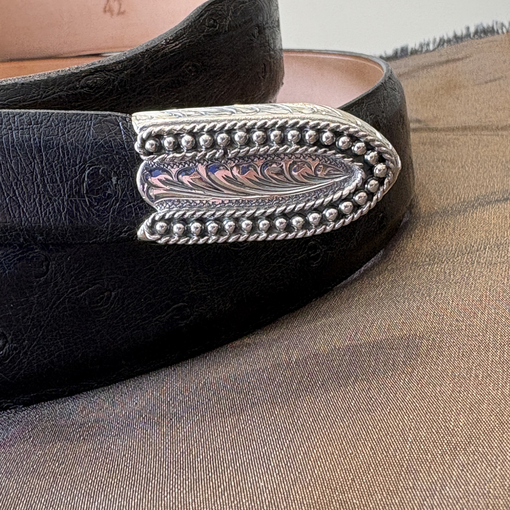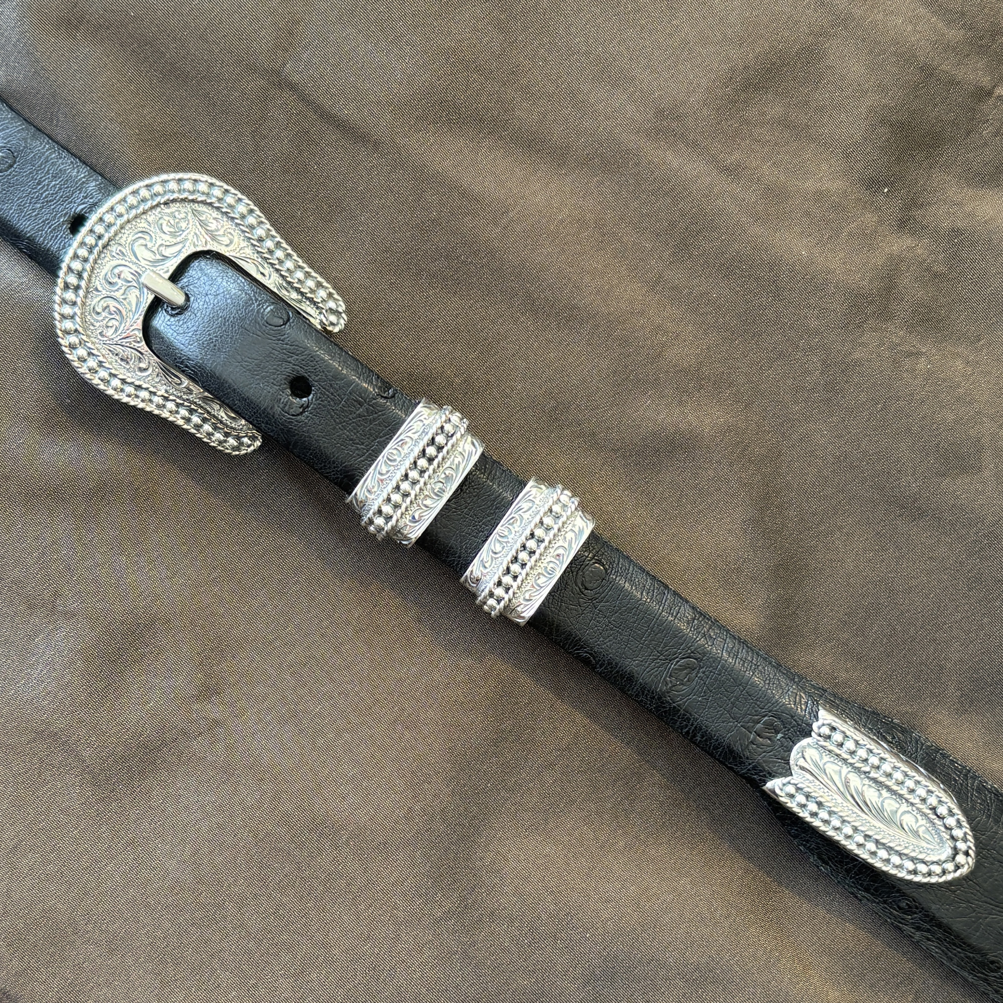 This 3/4″ four-piece buckle set showcases a distinctive Western design, combining an antiqued, hand-engraved sterling silver base with hand-twisted rope and beaded edges. The flat, hand-cut buckle silhouette adds a refined touch, balancing intricate craftsmanship with a classic profile. A timeless set that brings subtle texture and detail to any belt.