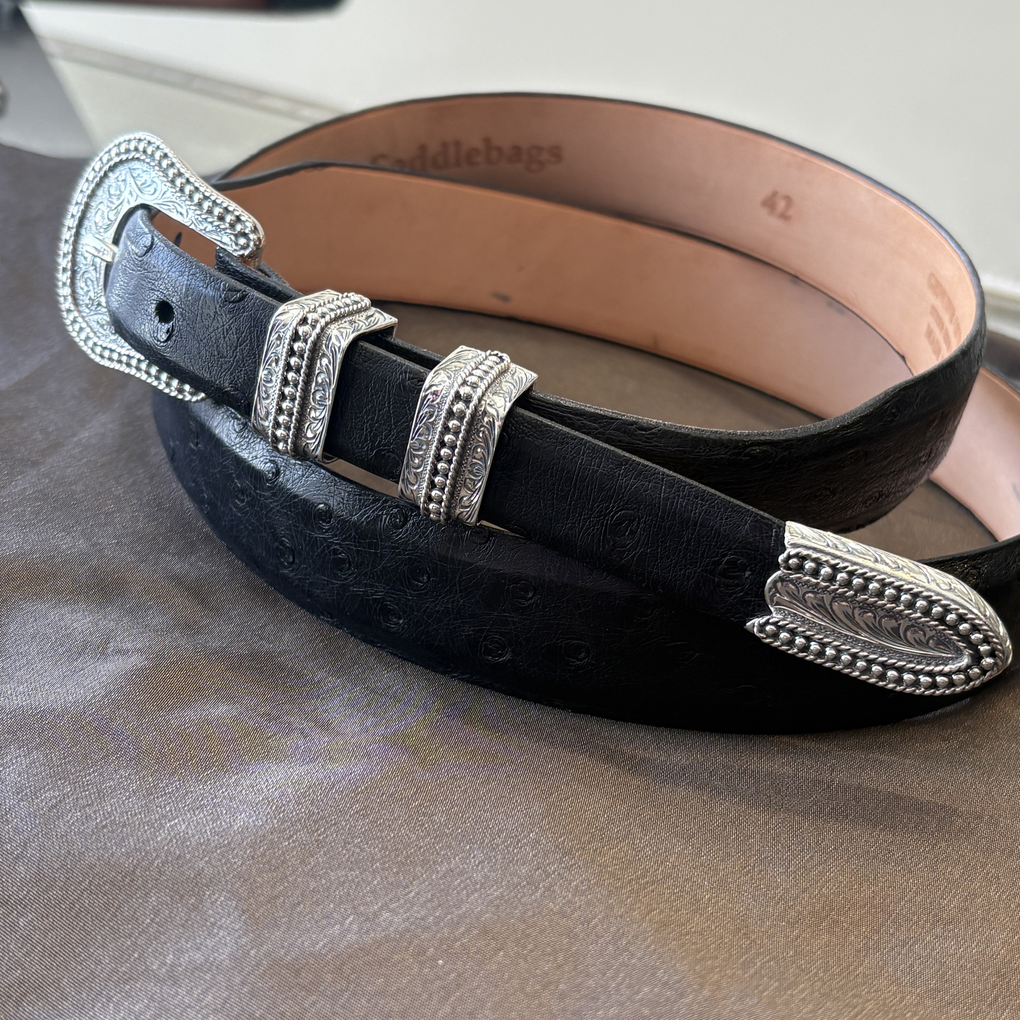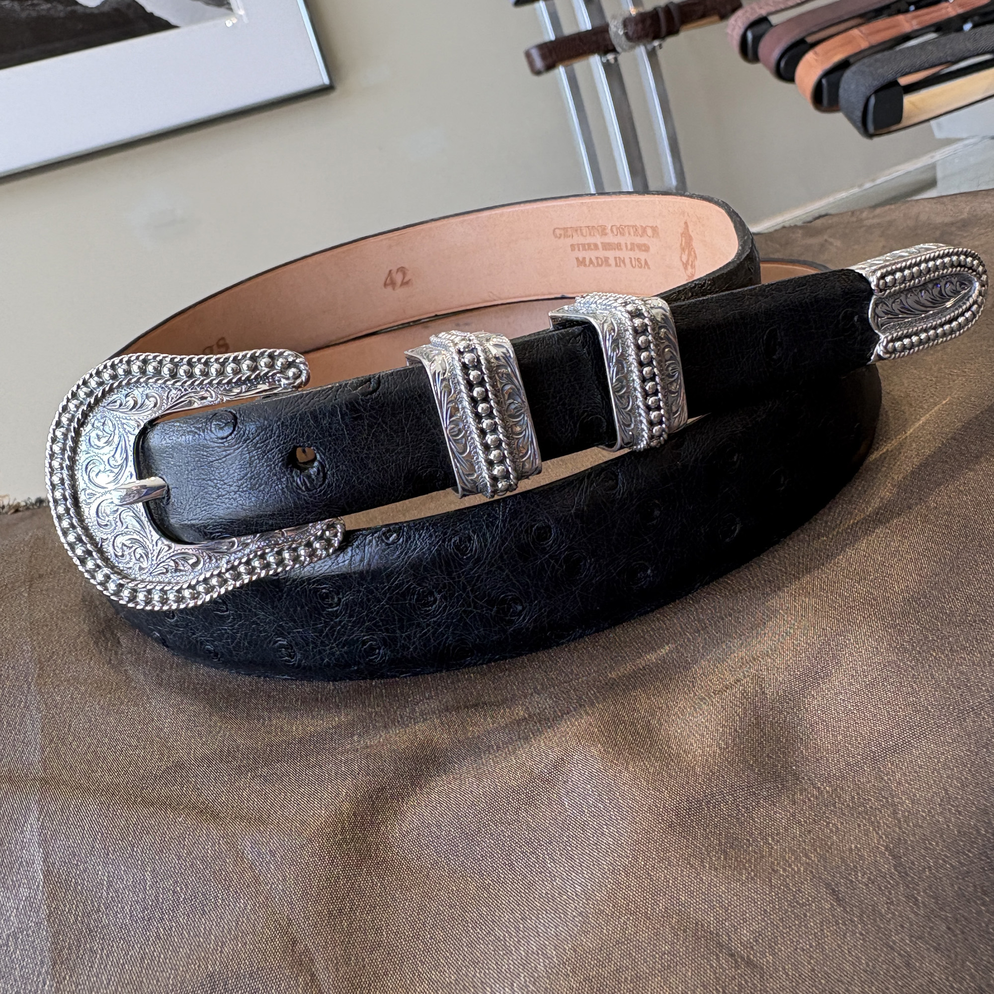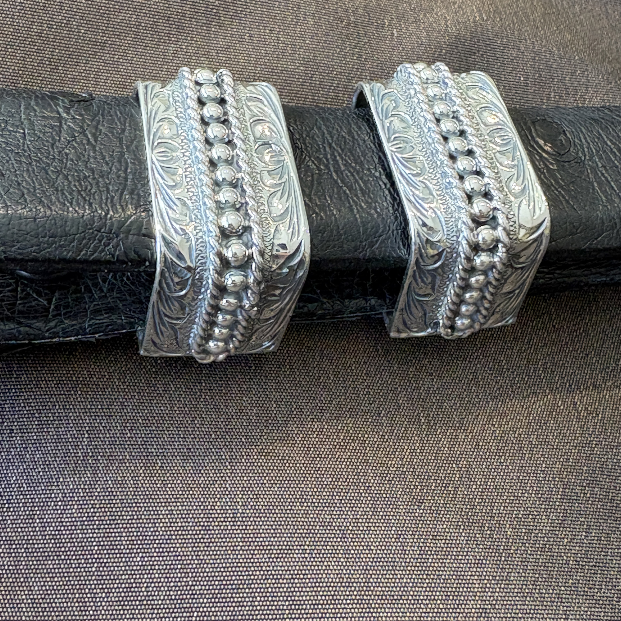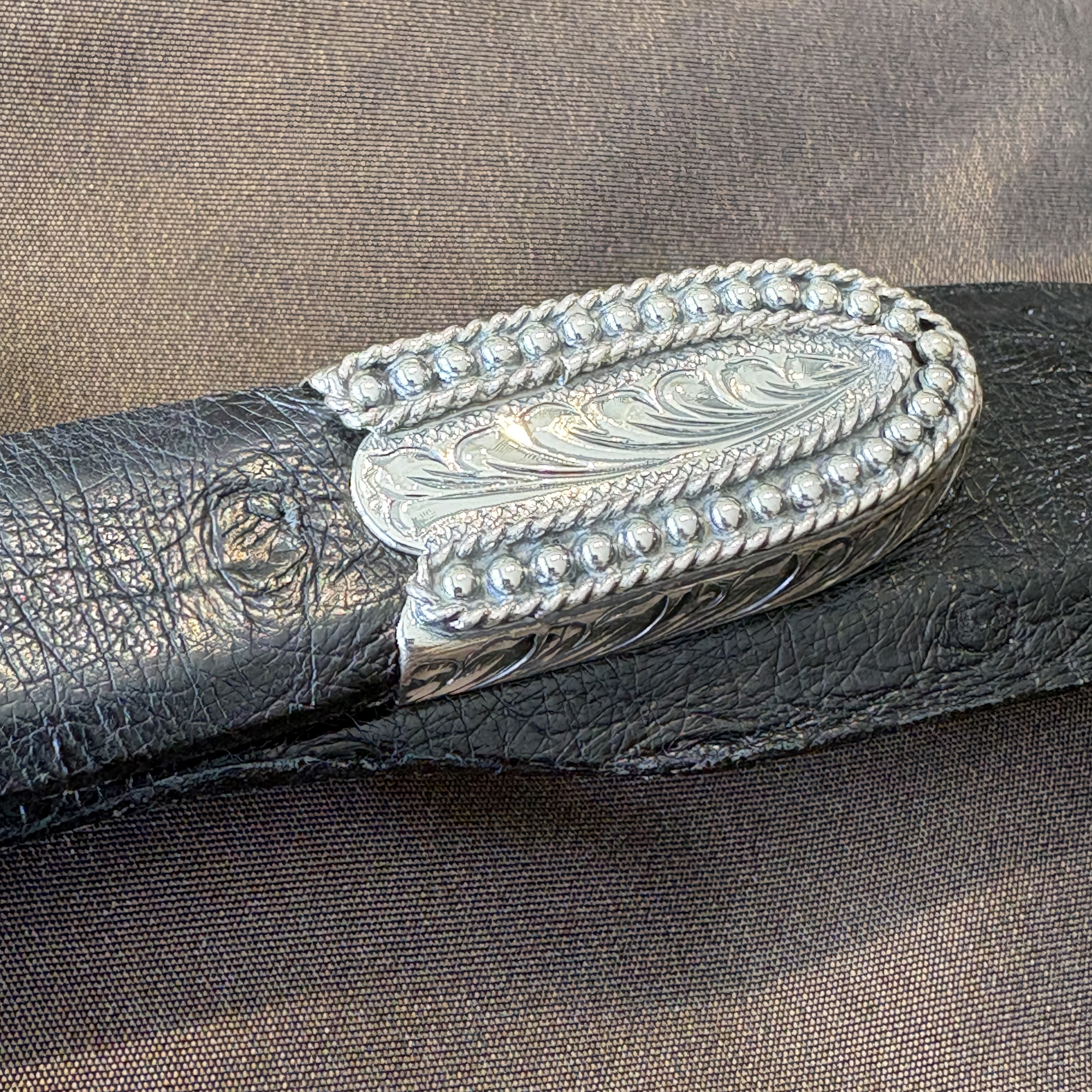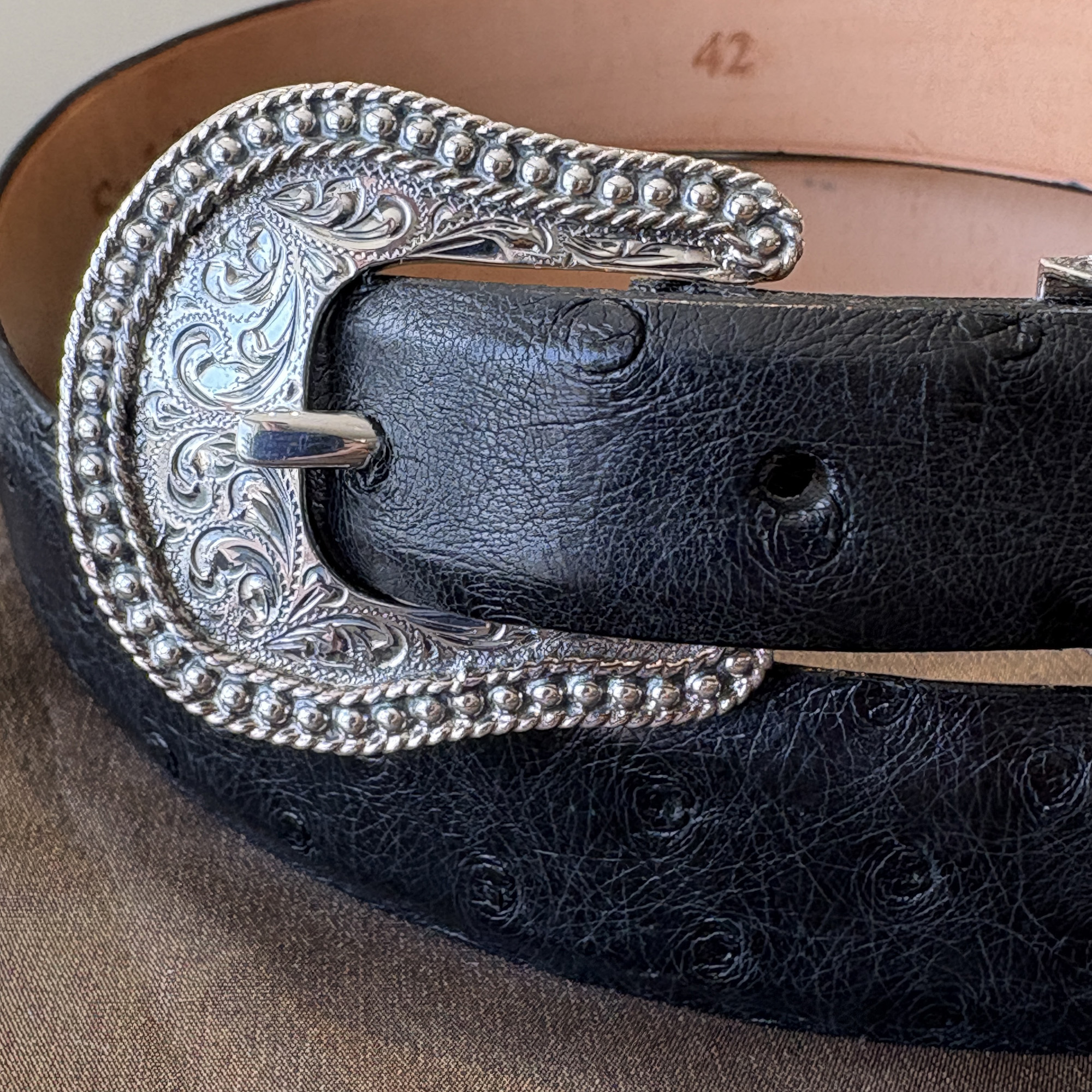 This 3/4″ four-piece buckle set showcases a distinctive Western design, combining an antiqued, hand-engraved sterling silver base with hand-twisted rope and beaded edges. The flat, hand-cut buckle silhouette adds a refined touch, balancing intricate craftsmanship with a classic profile. A timeless set that brings subtle texture and detail to any belt.