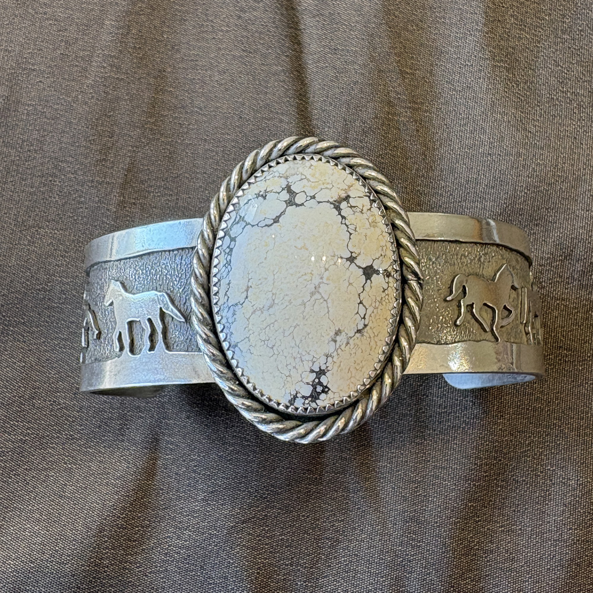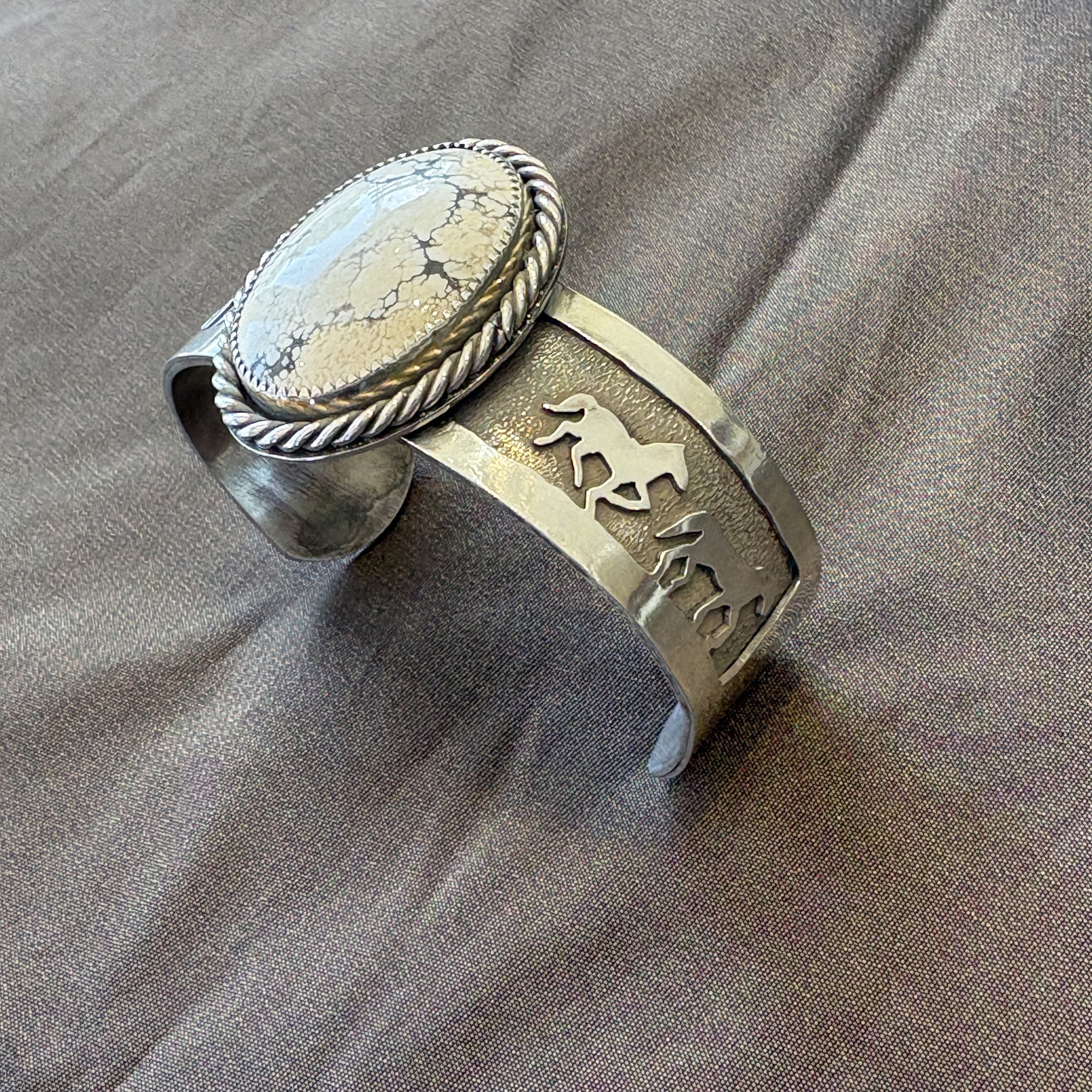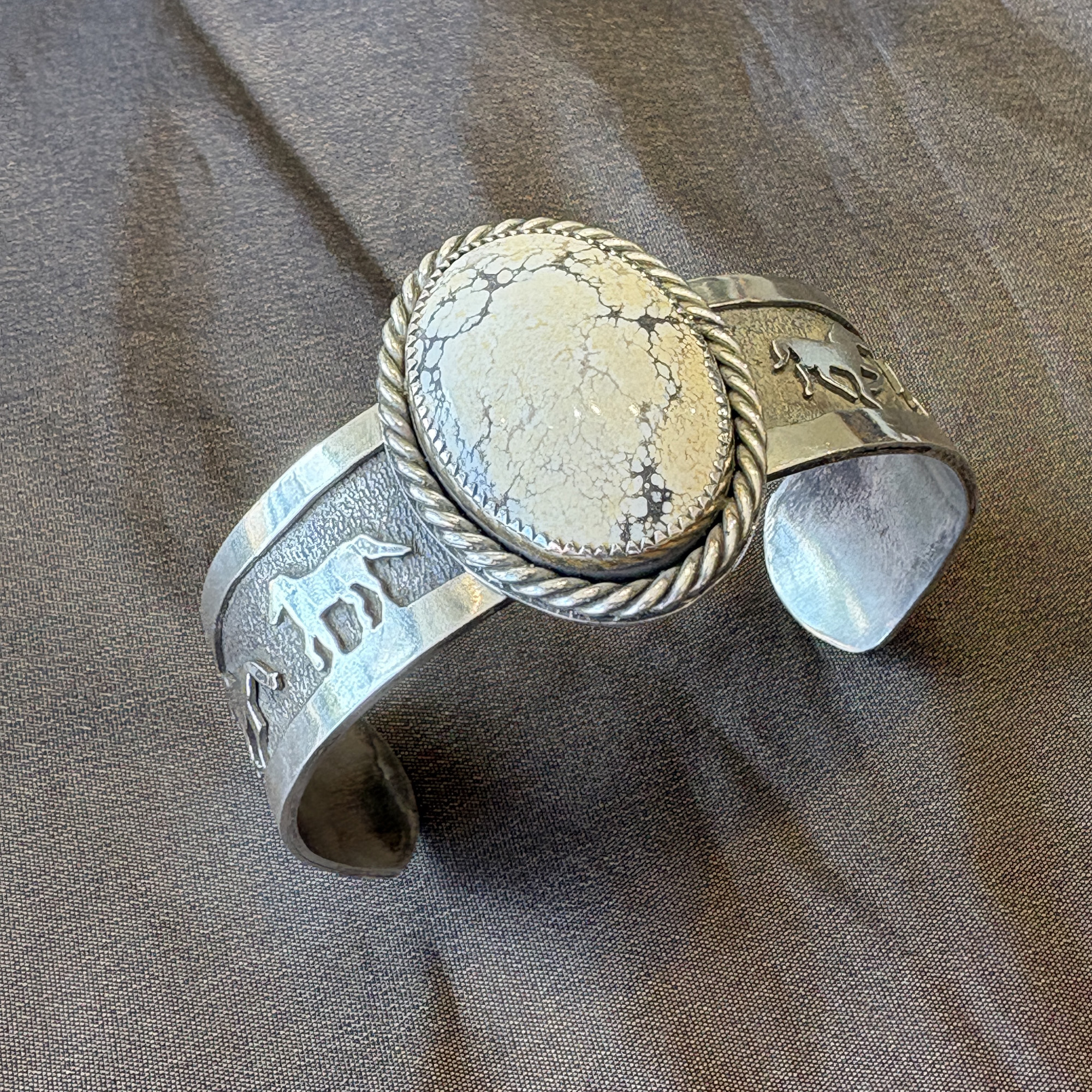 Sterling silver cuff bracelet with four horse scene combined with rare tan appaloosa stone with rope edge setting.