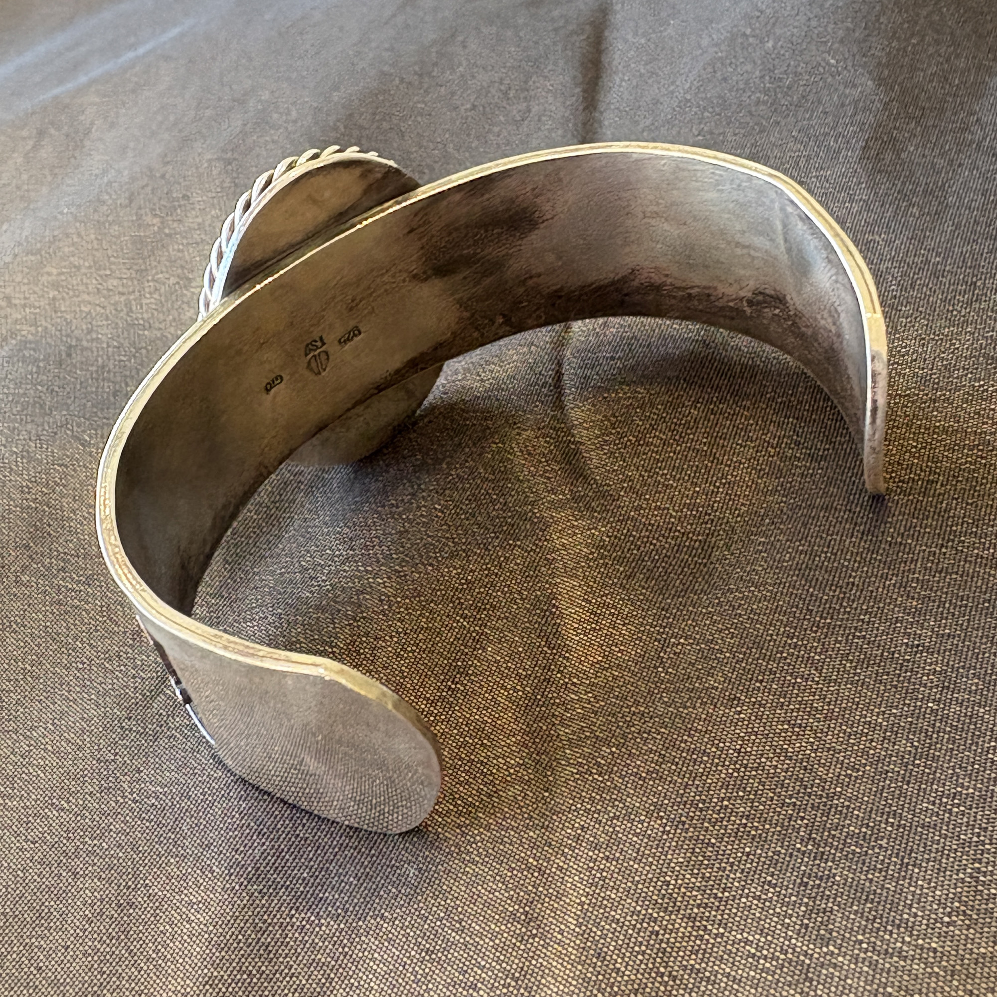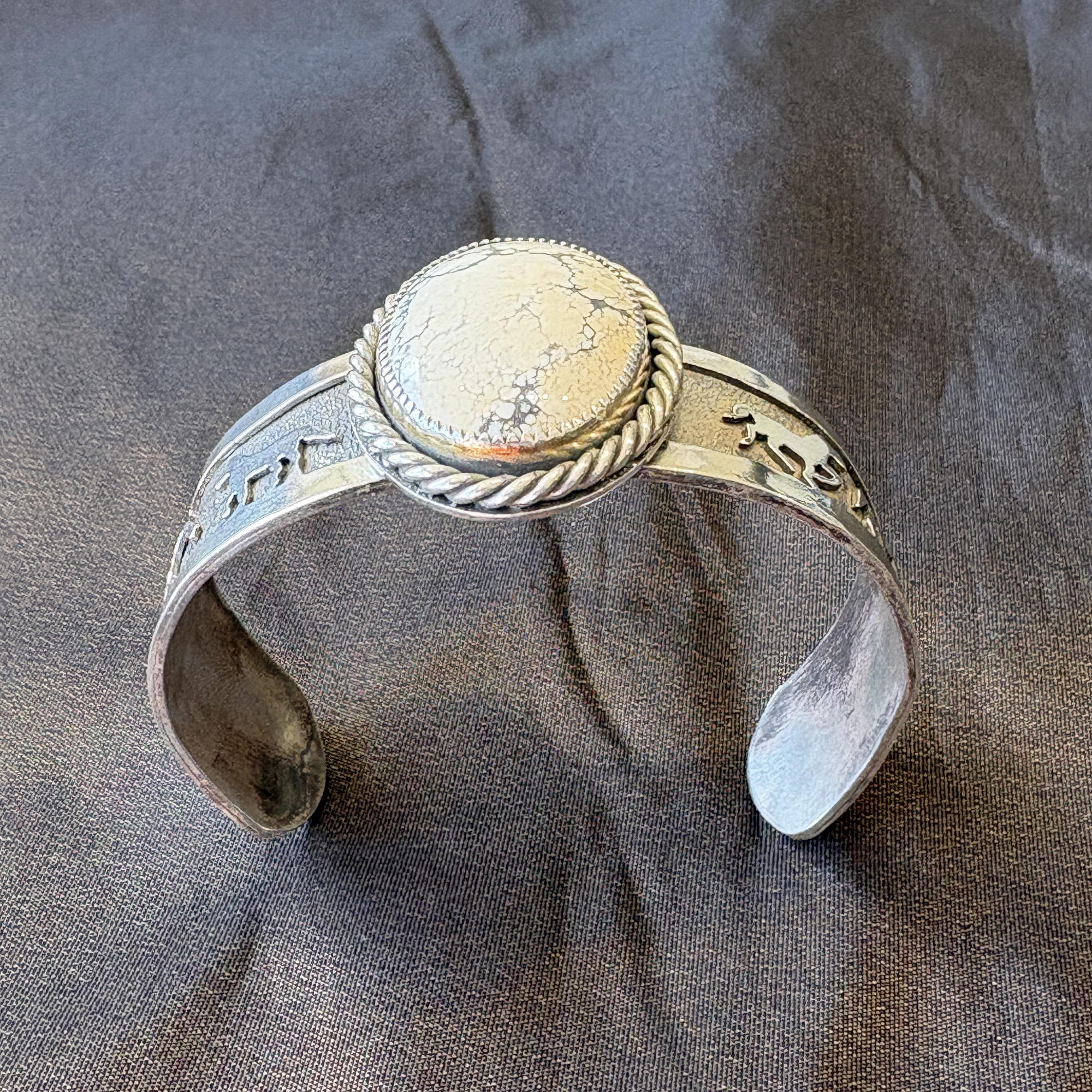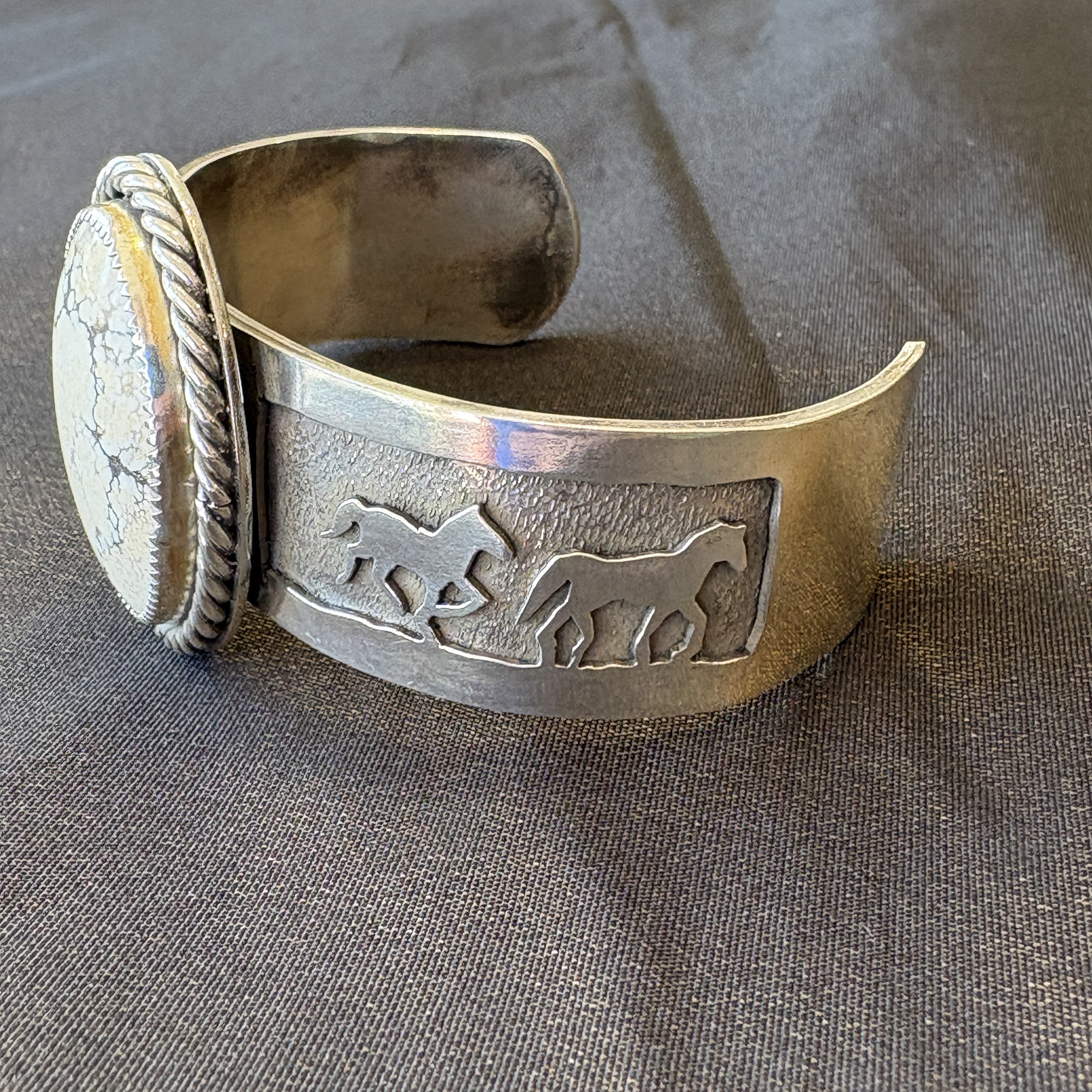 Sterling silver cuff bracelet with four horse scene combined with rare tan appaloosa stone with rope edge setting.