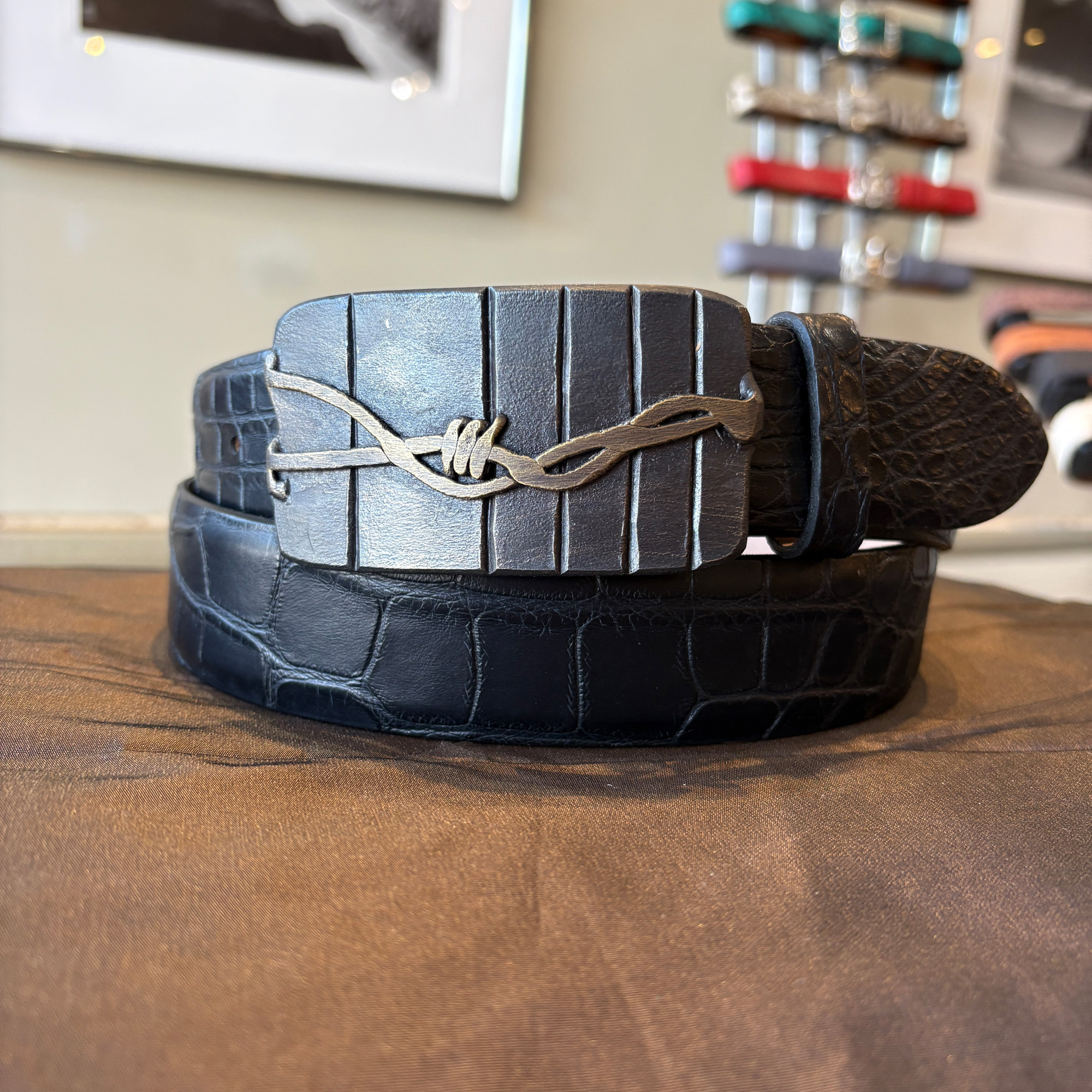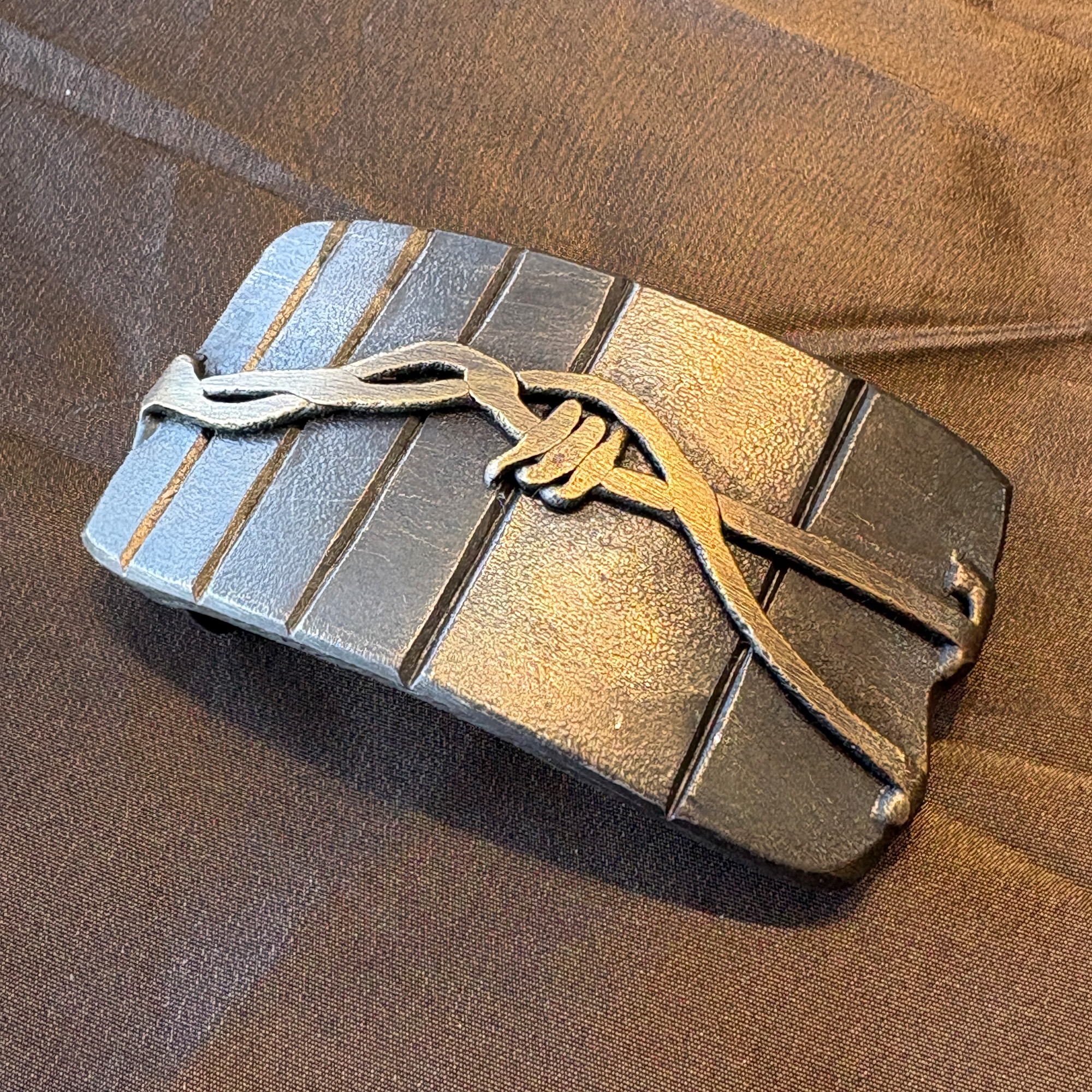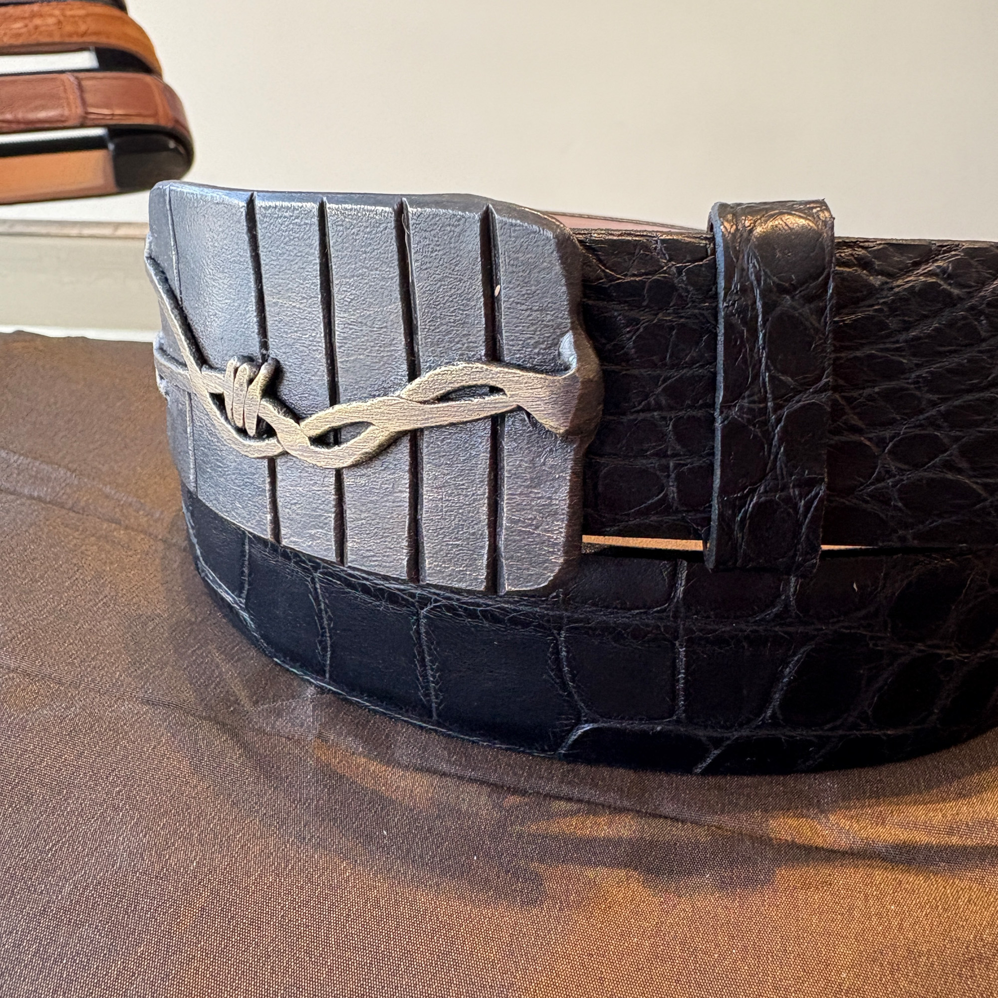 Each belt buckle is hand-crafted in small batches using traditional blacksmithing techniques. The result is a unique piece where not two buckles are identical. Our belt buckles are 100% designed and hand-forged in western Montana. Like all that things that endure, they are made with unrelenting care and attention to detail. This one fits an 1-1/2″ width belt, and is shown here on a matte black alligator.