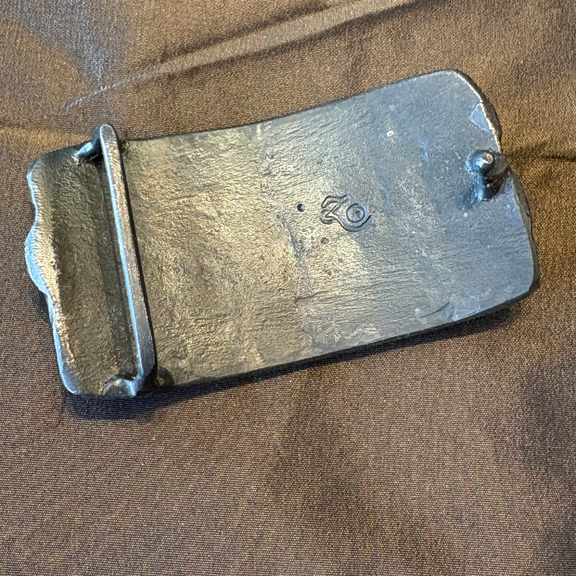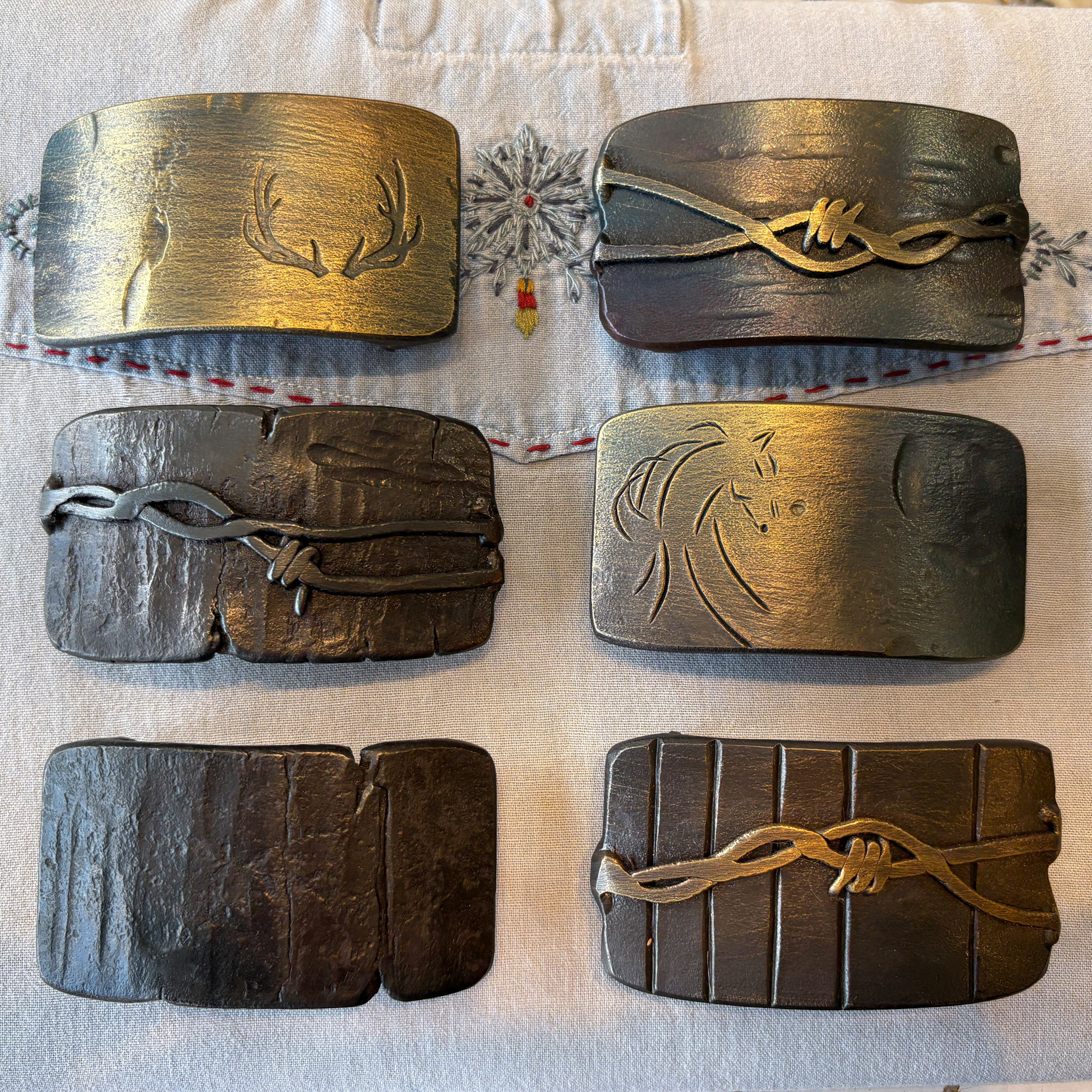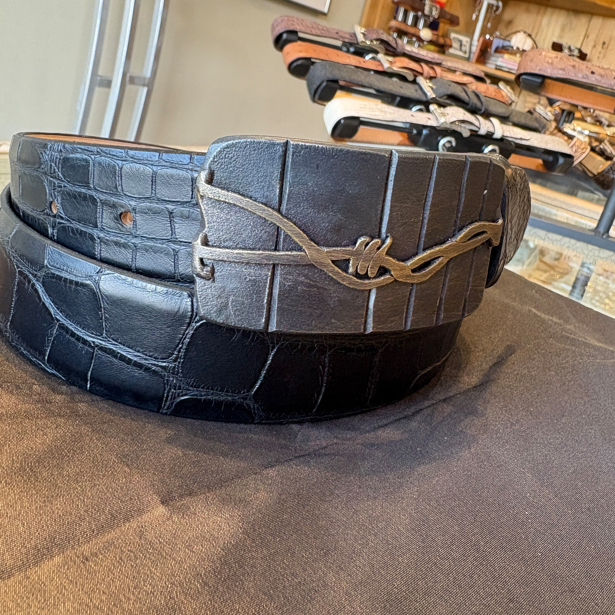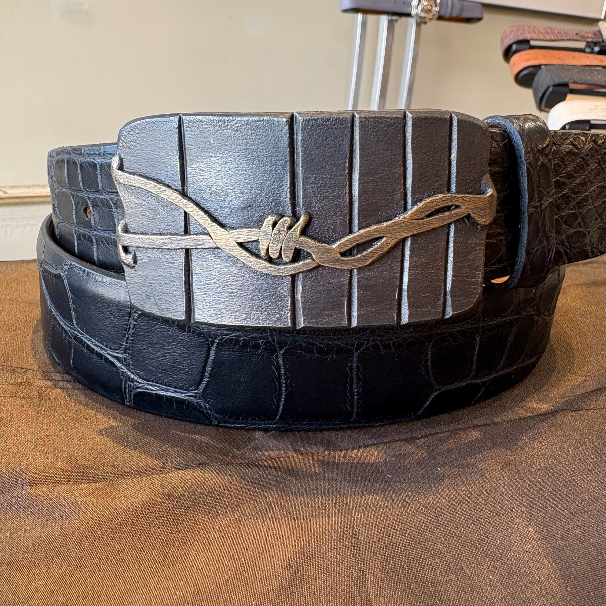 Each belt buckle is hand-crafted in small batches using traditional blacksmithing techniques. The result is a unique piece where not two buckles are identical. Our belt buckles are 100% designed and hand-forged in western Montana. Like all that things that endure, they are made with unrelenting care and attention to detail. This one fits an 1-1/2″ width belt, and is shown here on a matte black alligator.