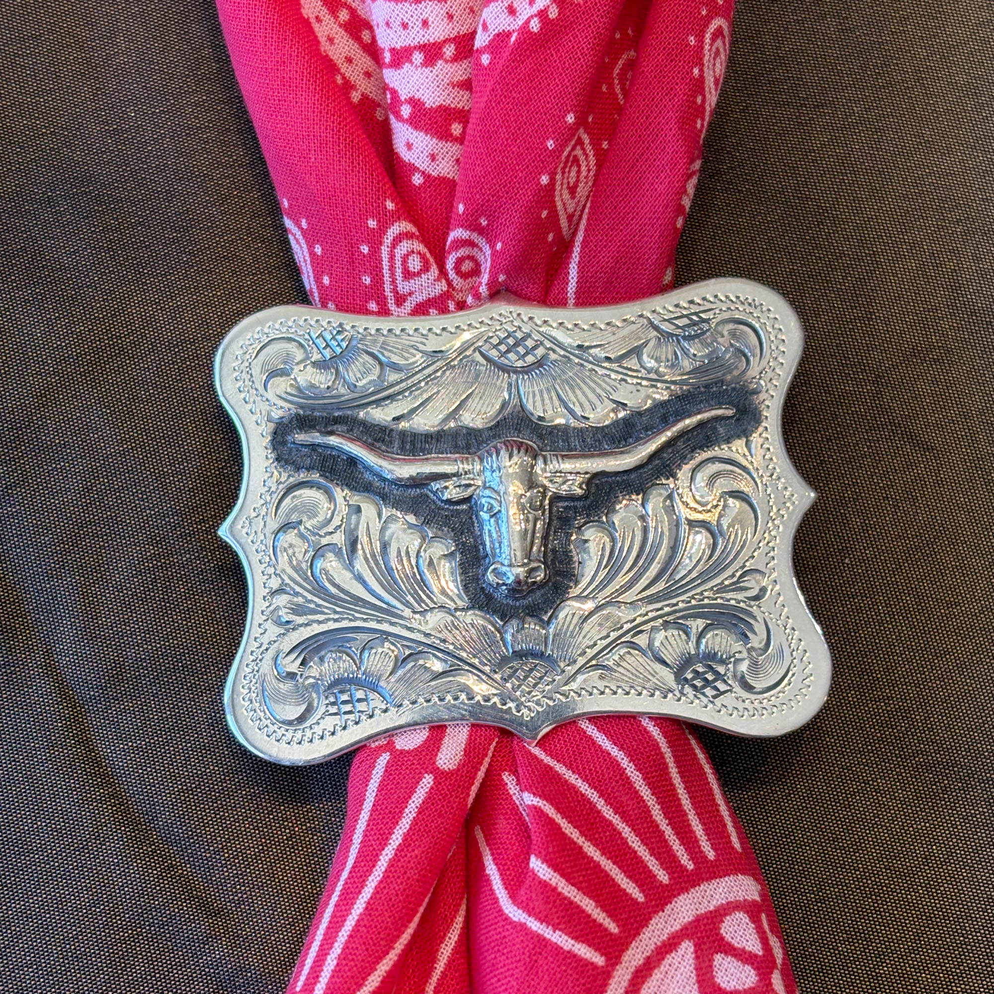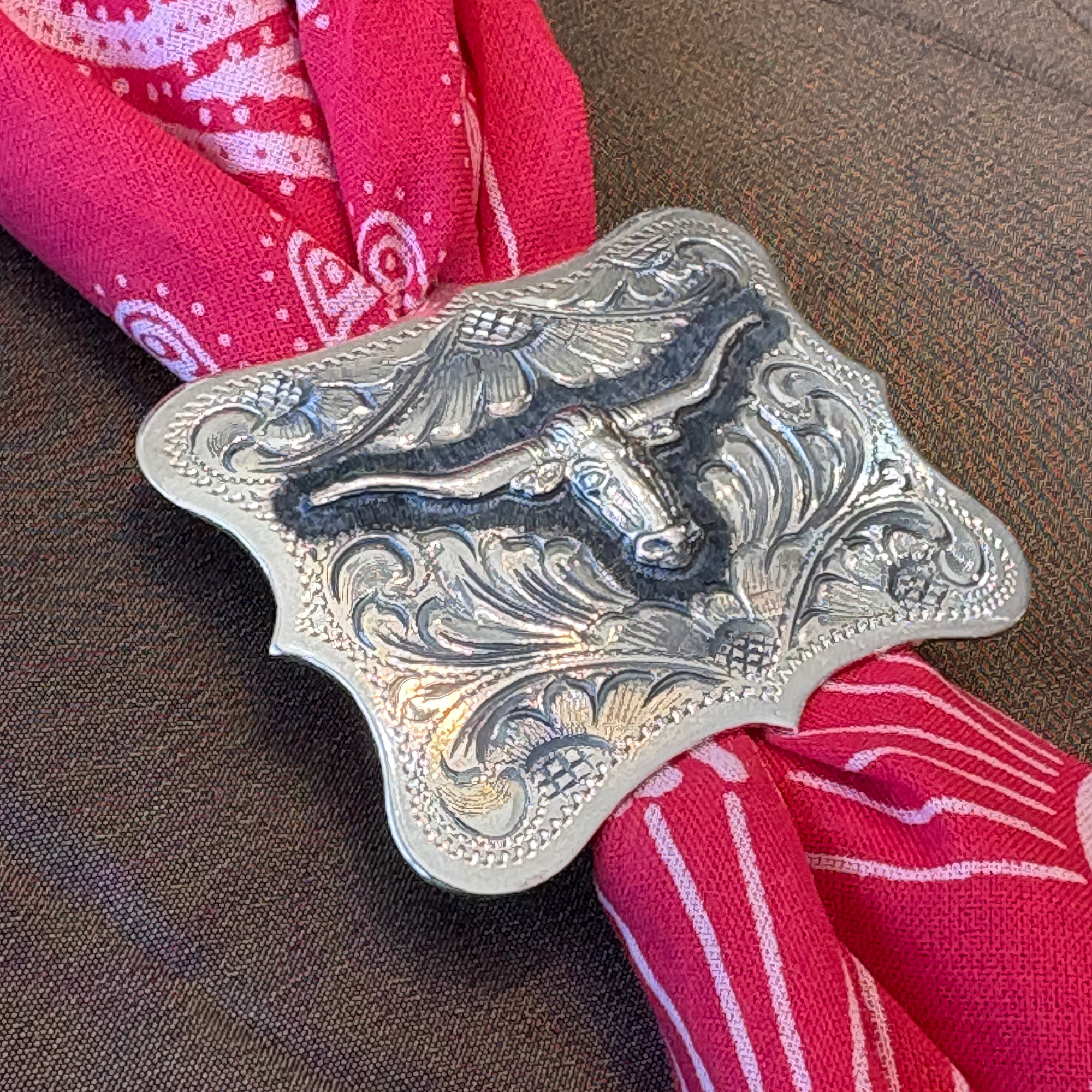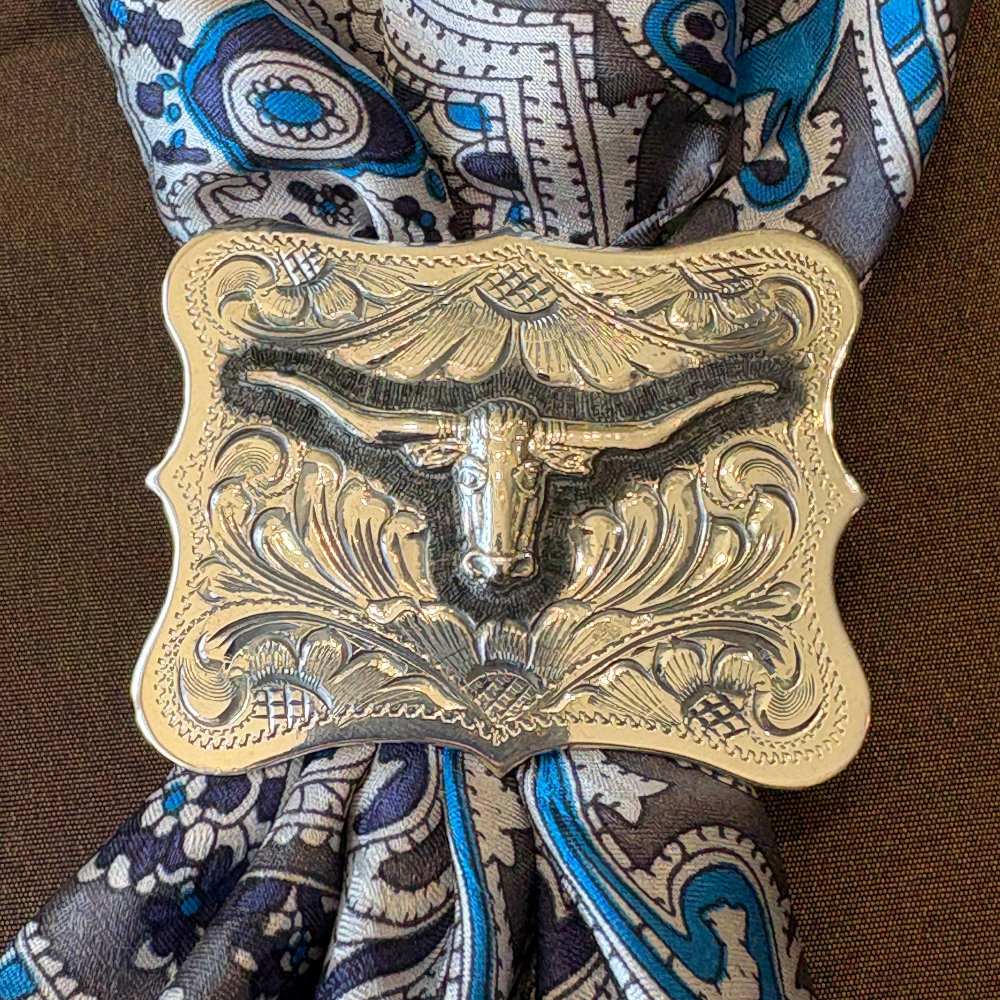 Handcrafted in solid sterling silver, this scarf slide is styled after a traditional Western buckle. A detailed longhorn figure stands out against an antiqued background, framed by hand-engraved scrolls and flowers.