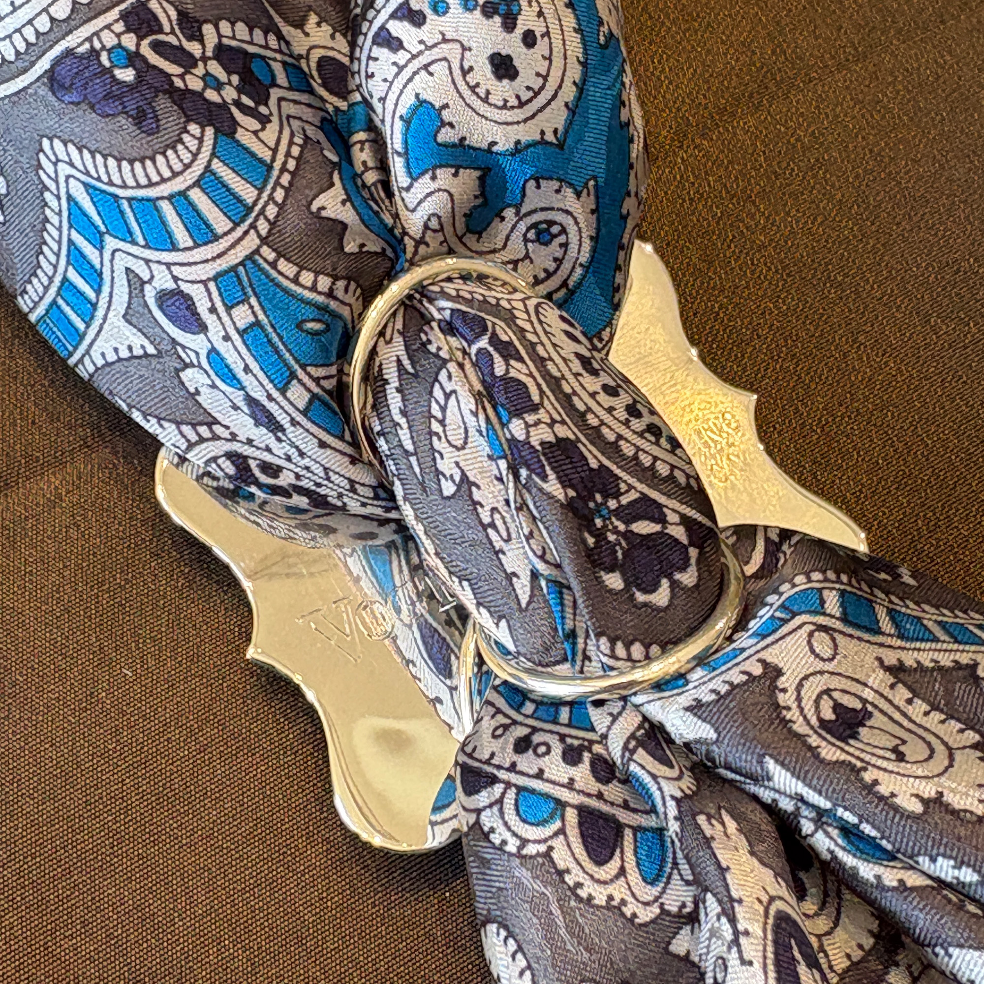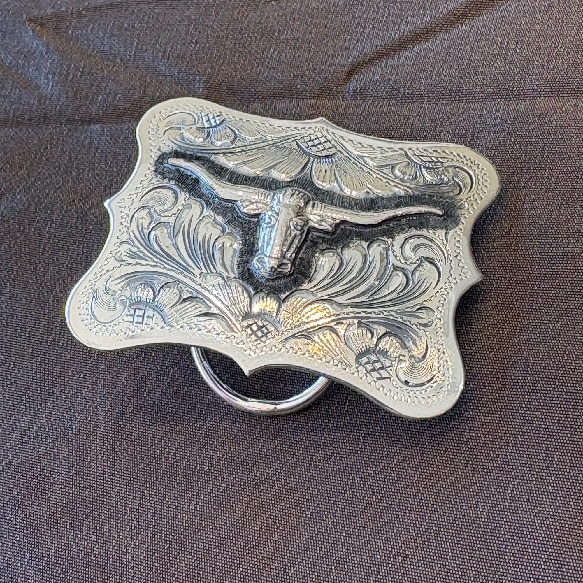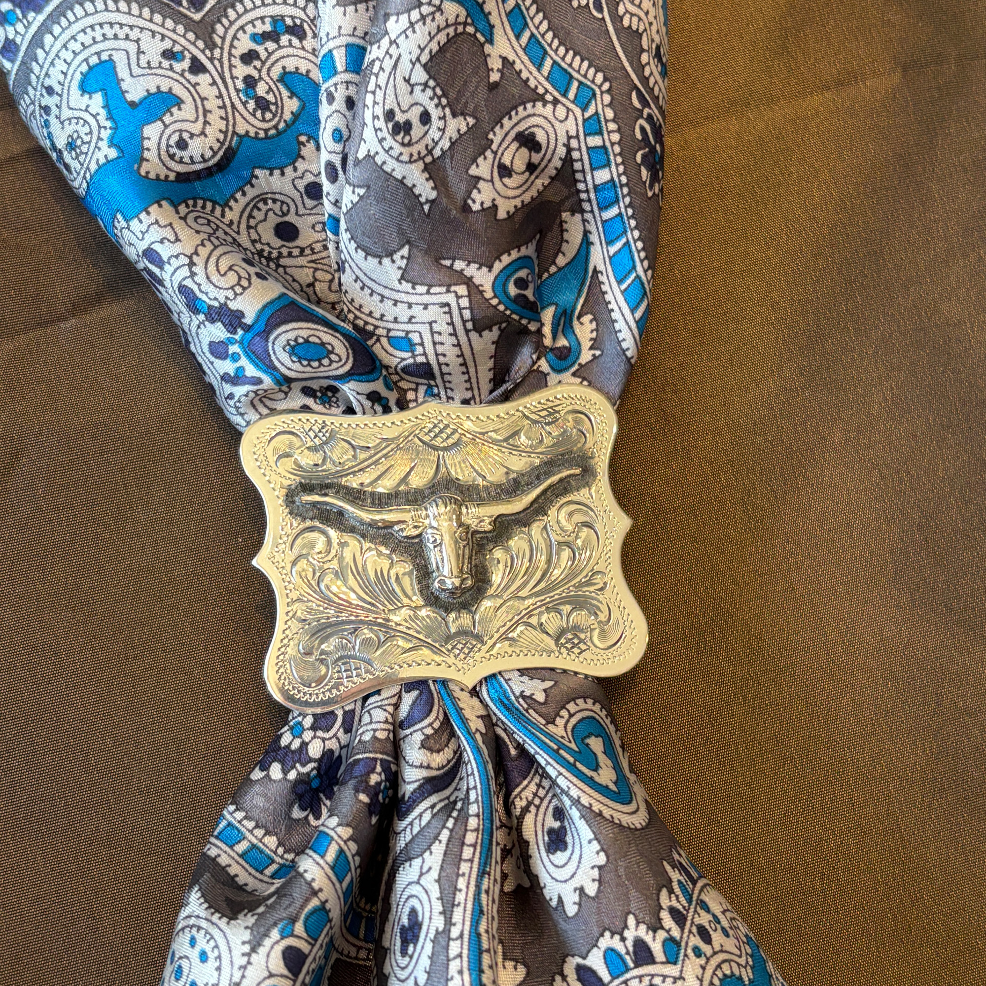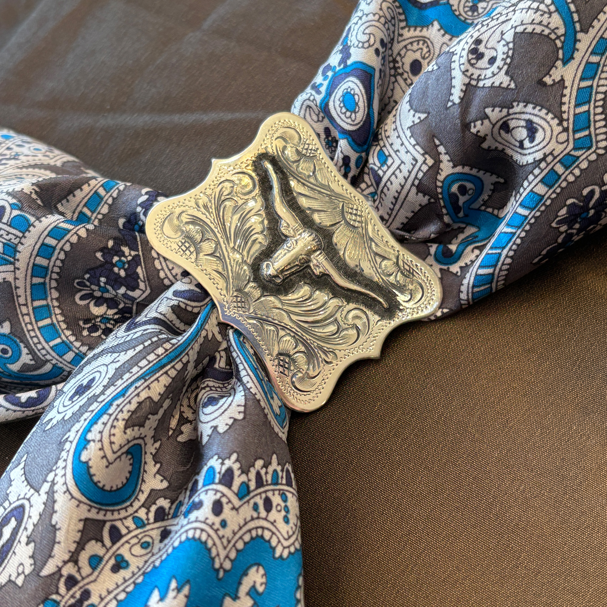 Handcrafted in solid sterling silver, this scarf slide is styled after a traditional Western buckle. A detailed longhorn figure stands out against an antiqued background, framed by hand-engraved scrolls and flowers.