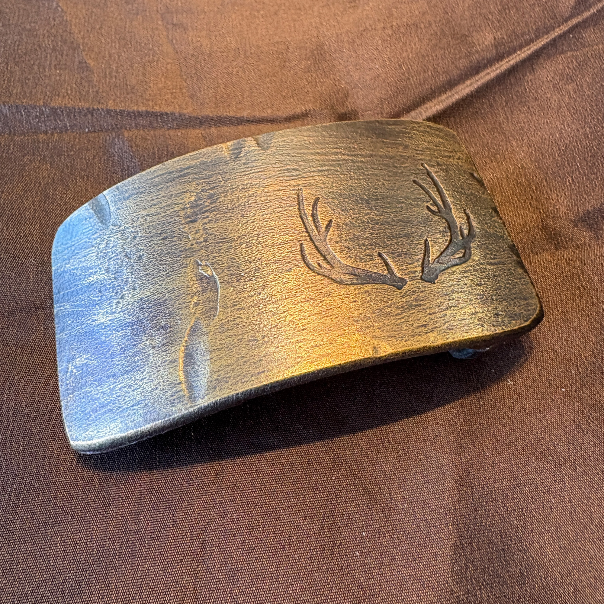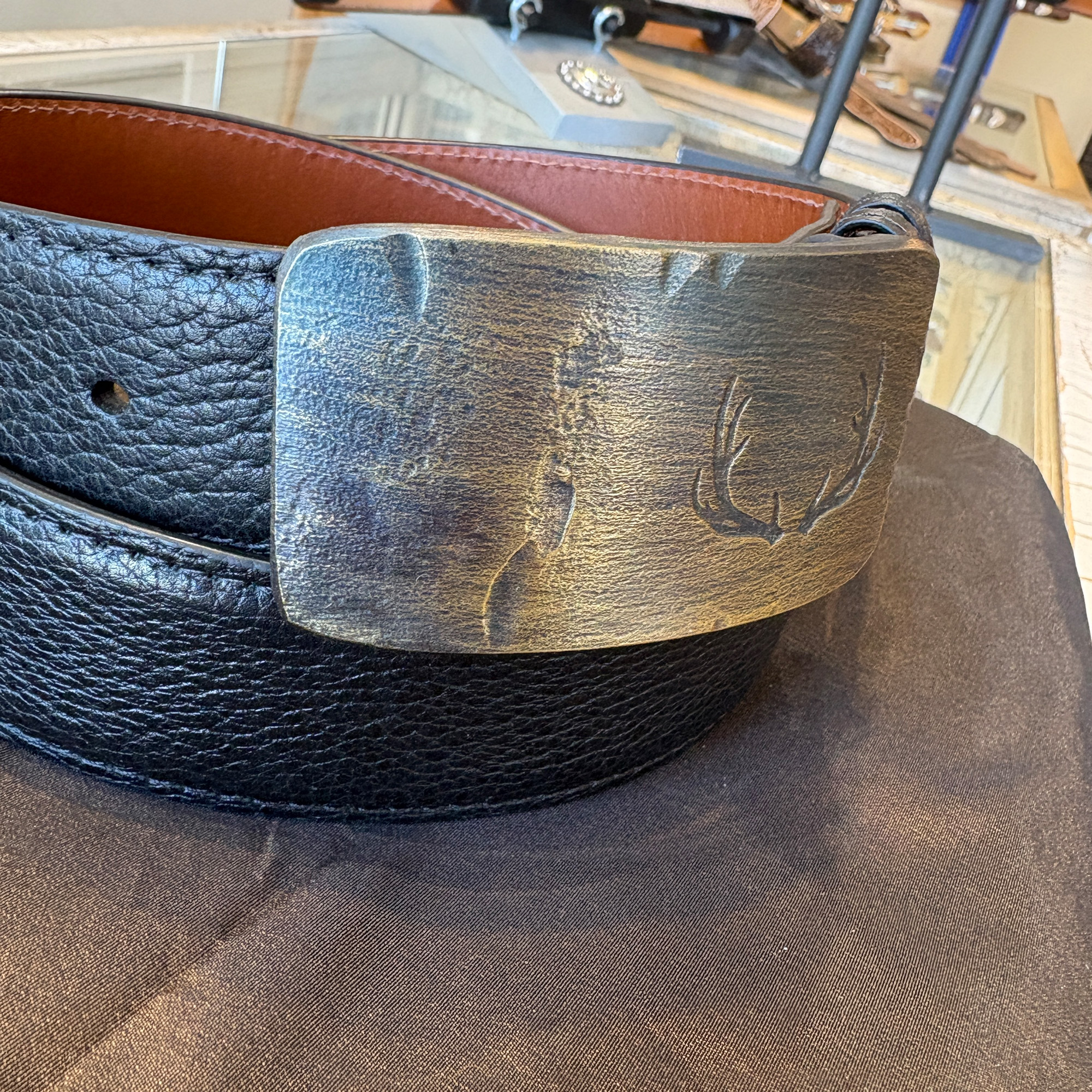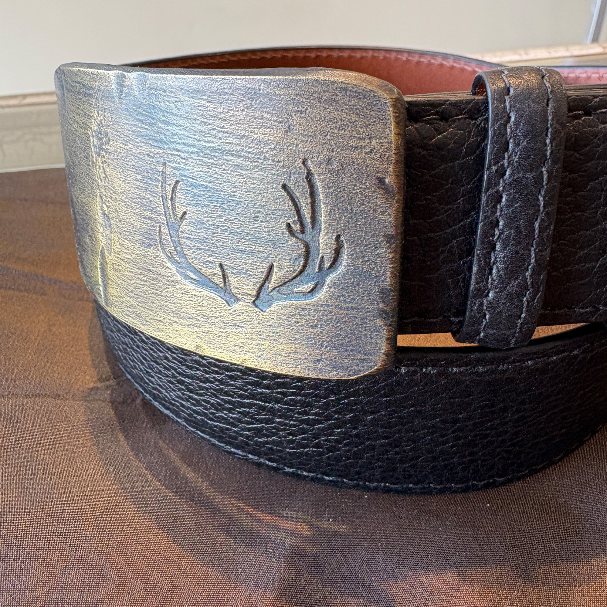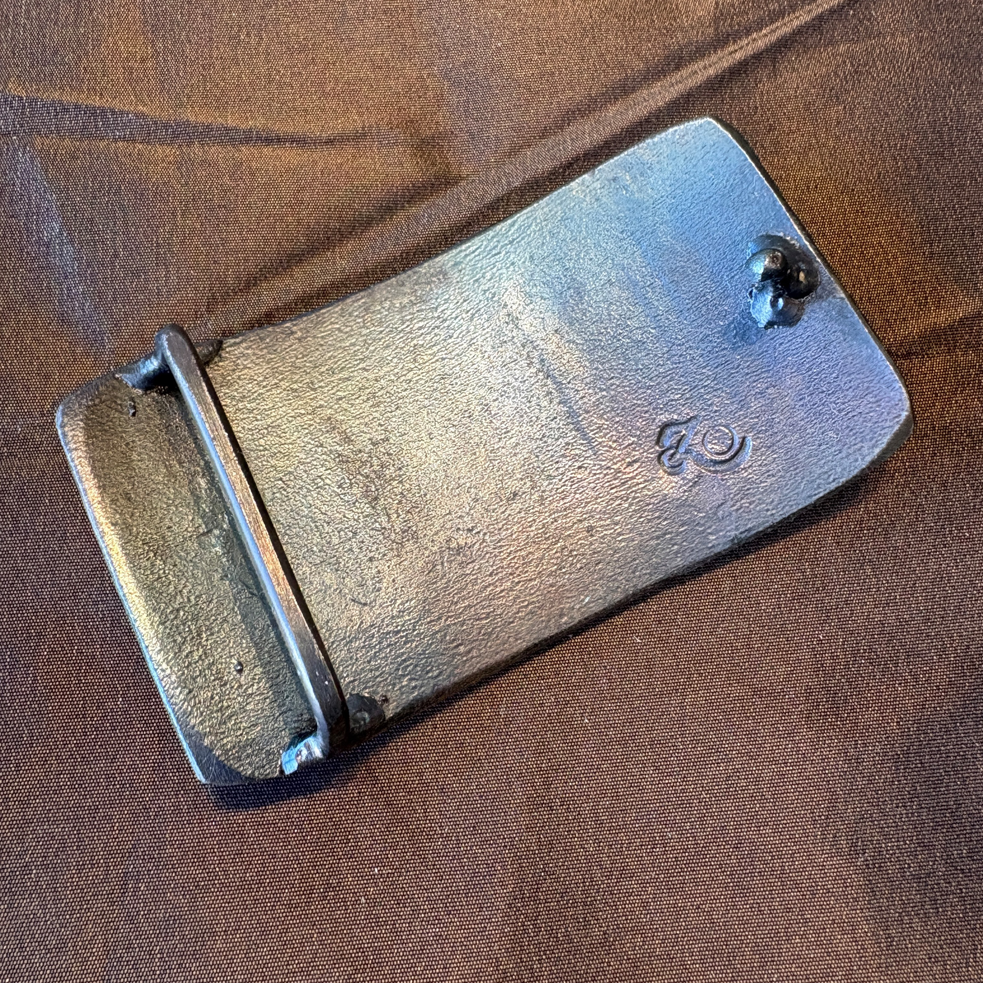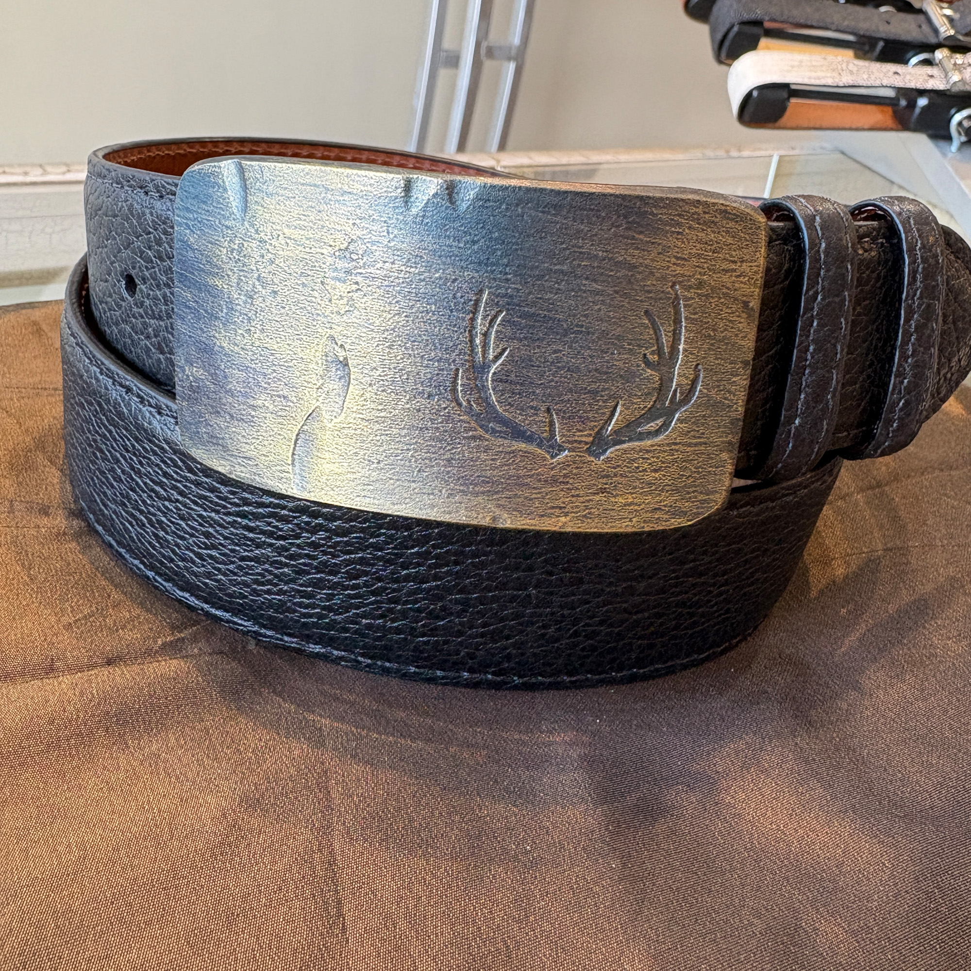Each belt buckle is hand-crafted in small batches using traditional blacksmithing techniques. The result is a unique piece where not two buckles are identical. Our belt buckles are 100% designed and hand-forged in western Montana. Like all that things that endure, they are made with unrelenting care and attention to detail. This buckle fits a wider 1-1/2″ width belt and is pictured here on a black bison leather.