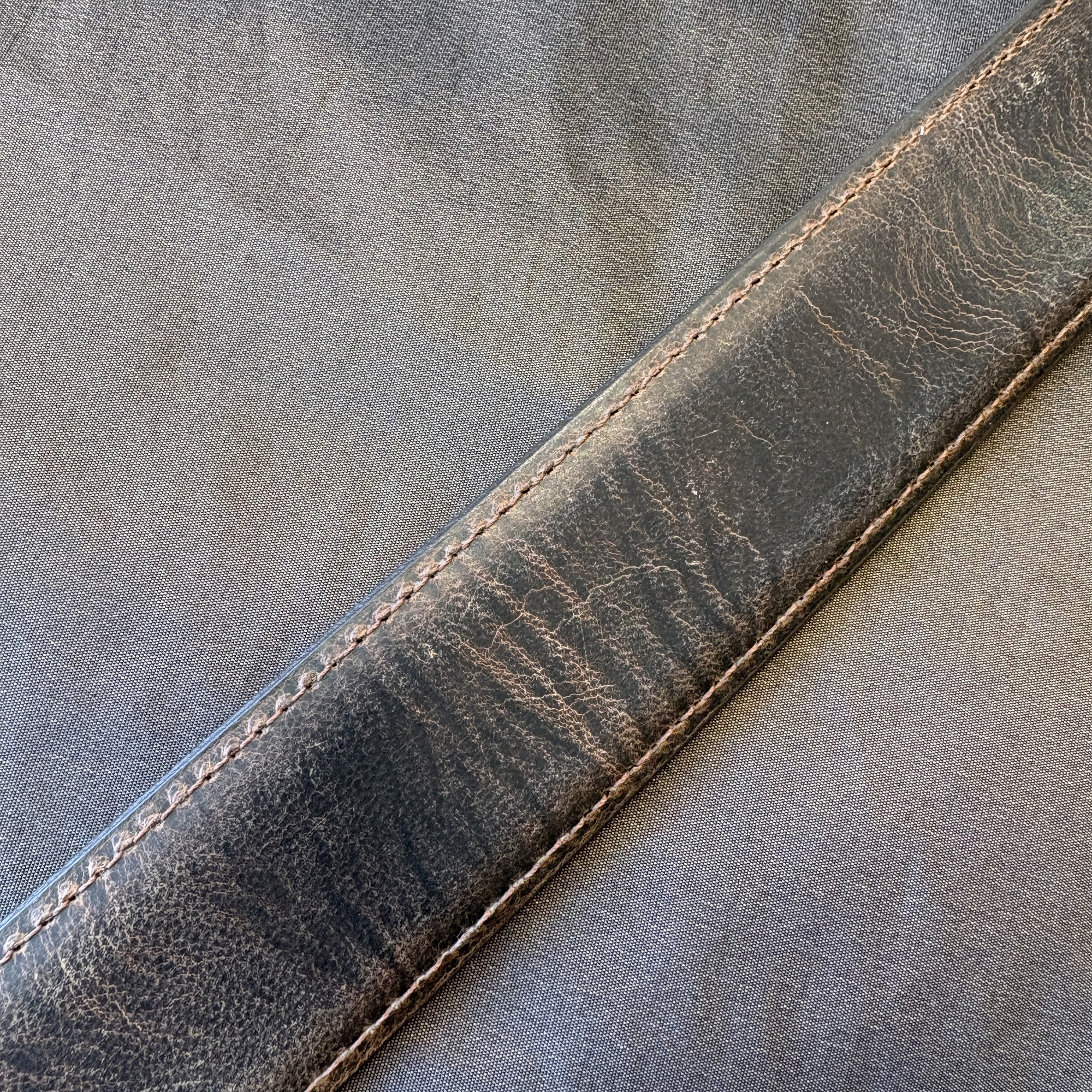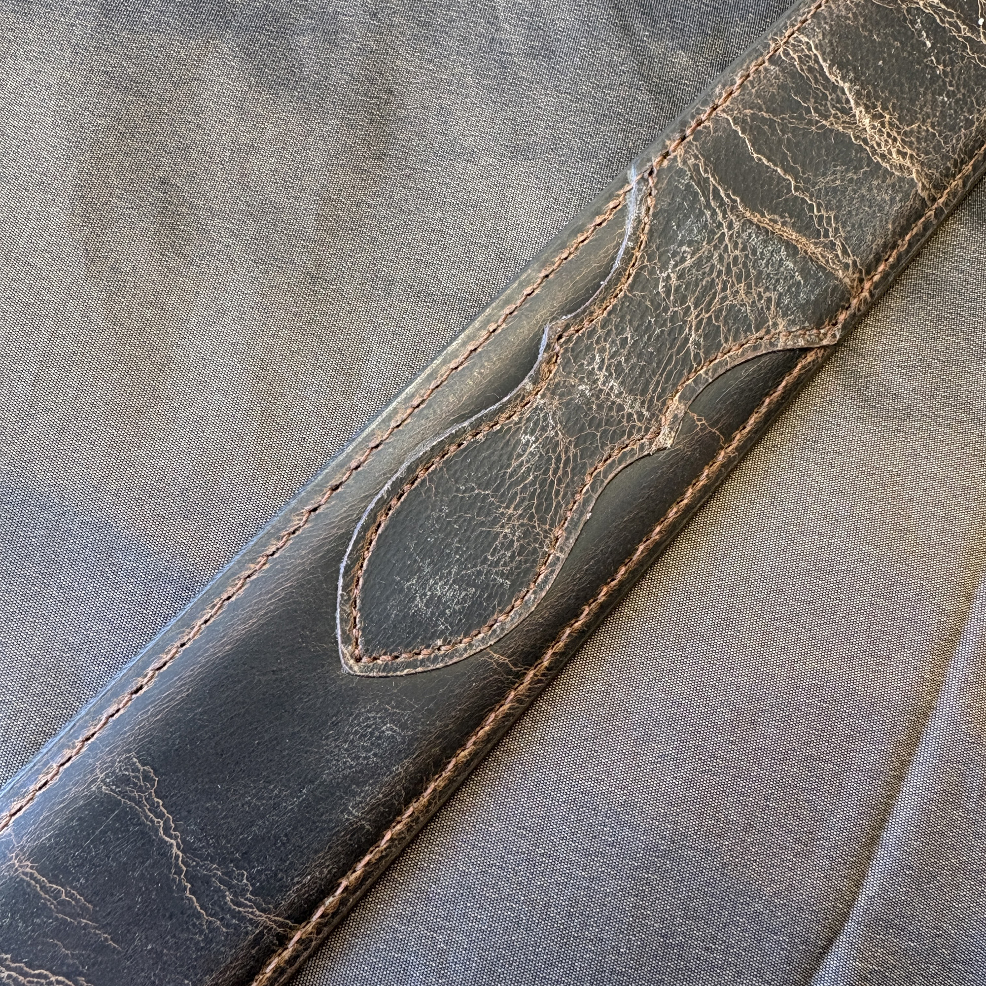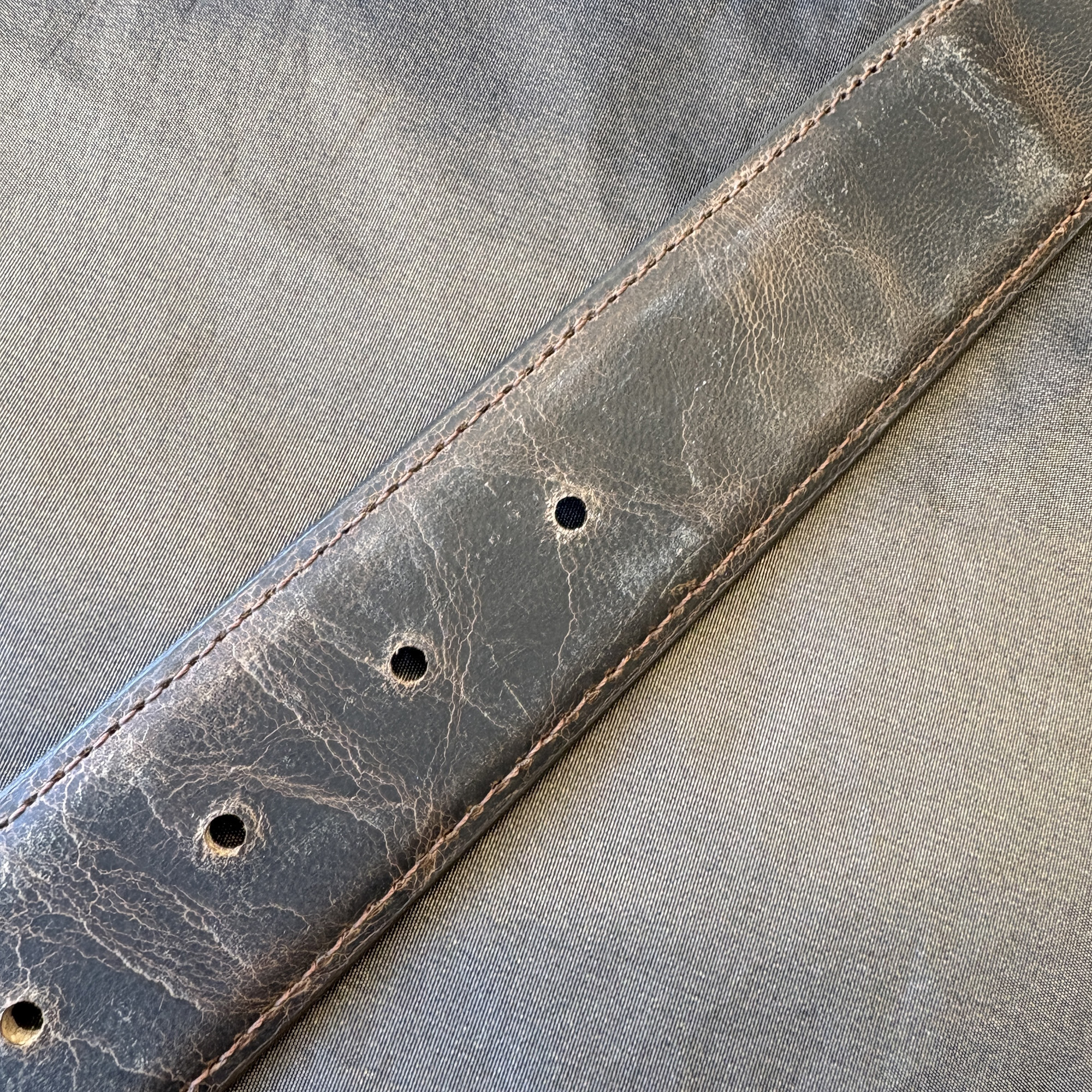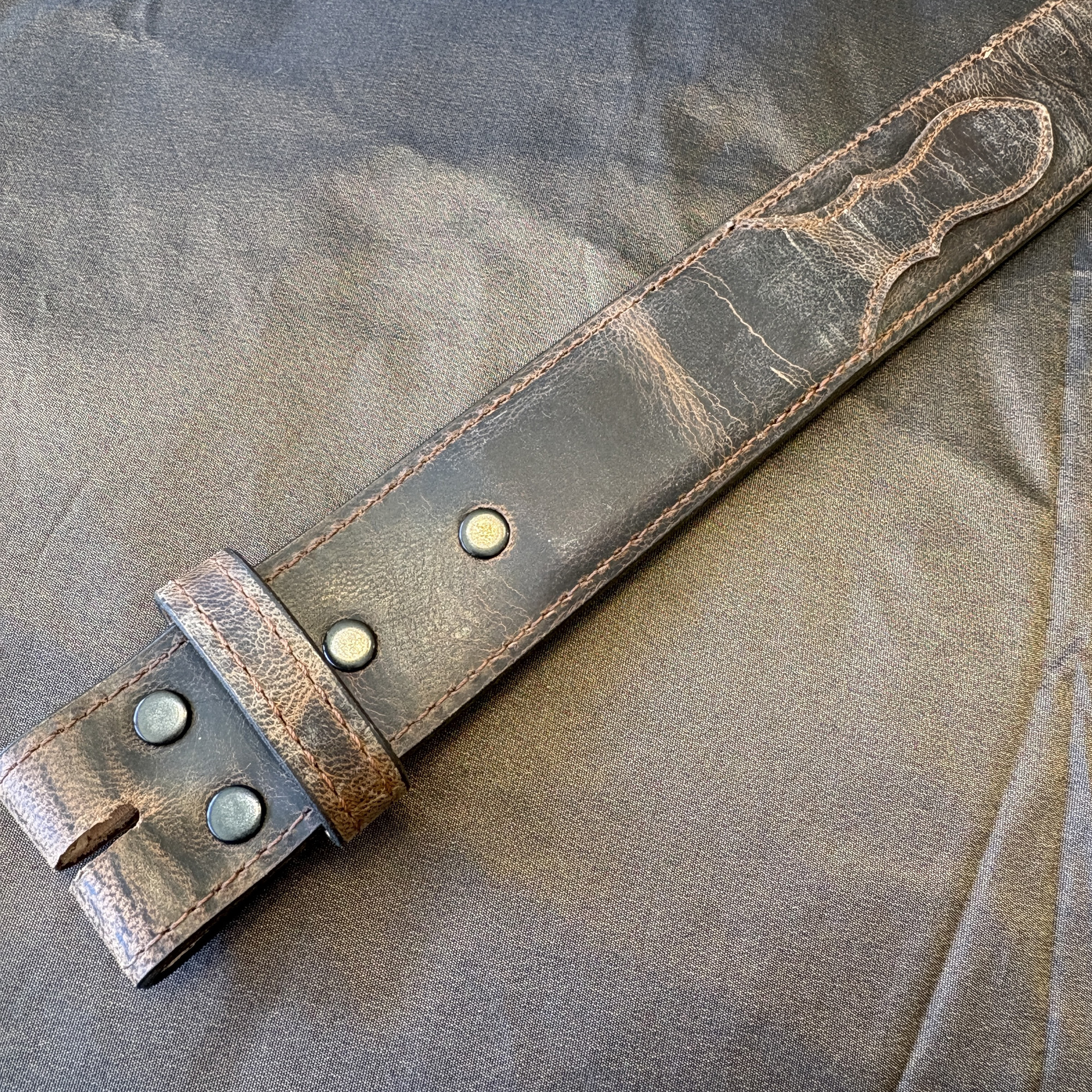 Genuine Goatskin leather belt strap with stitched in billets and miscellaneous distressed textures, in a medium brown color. They are available in all widths and lengths.