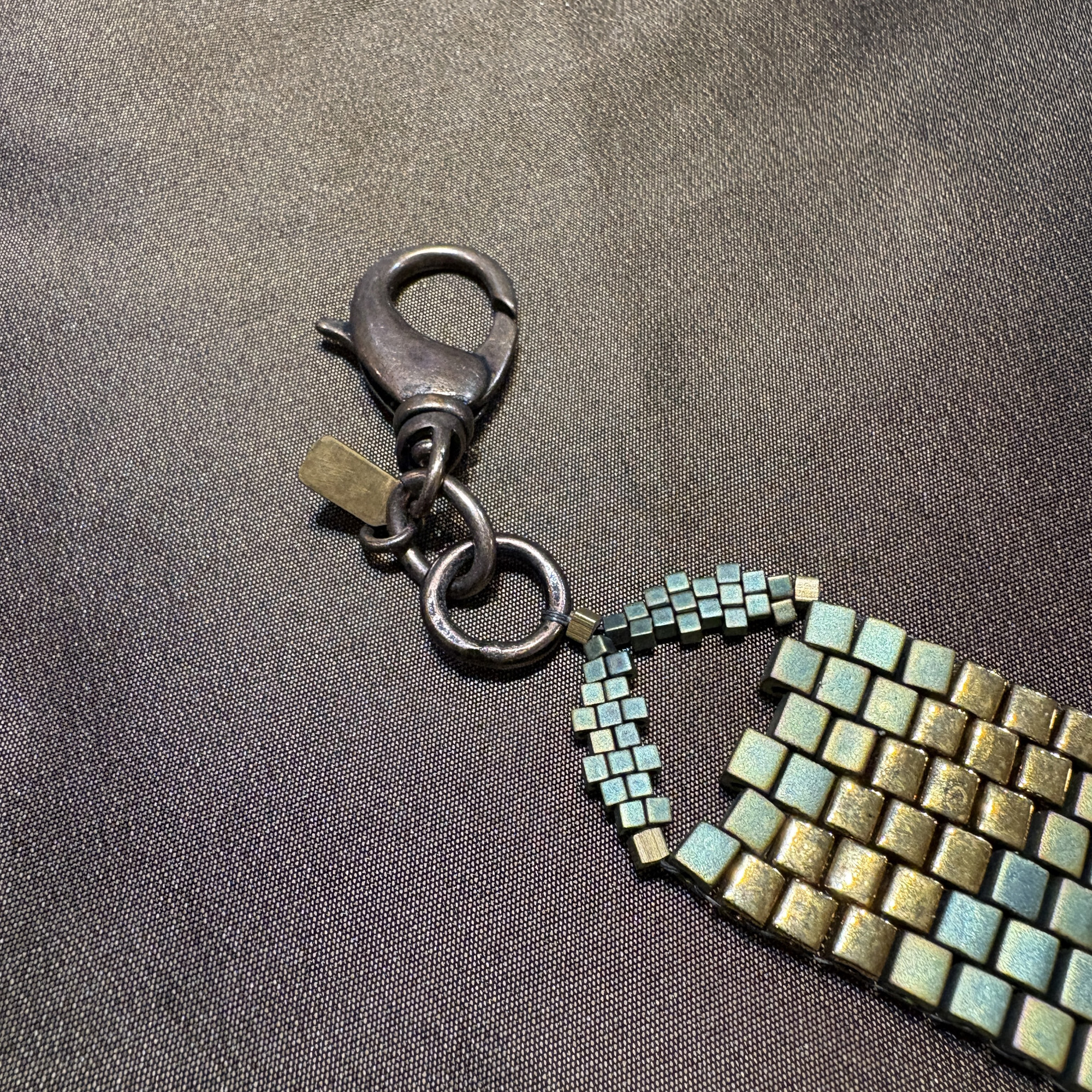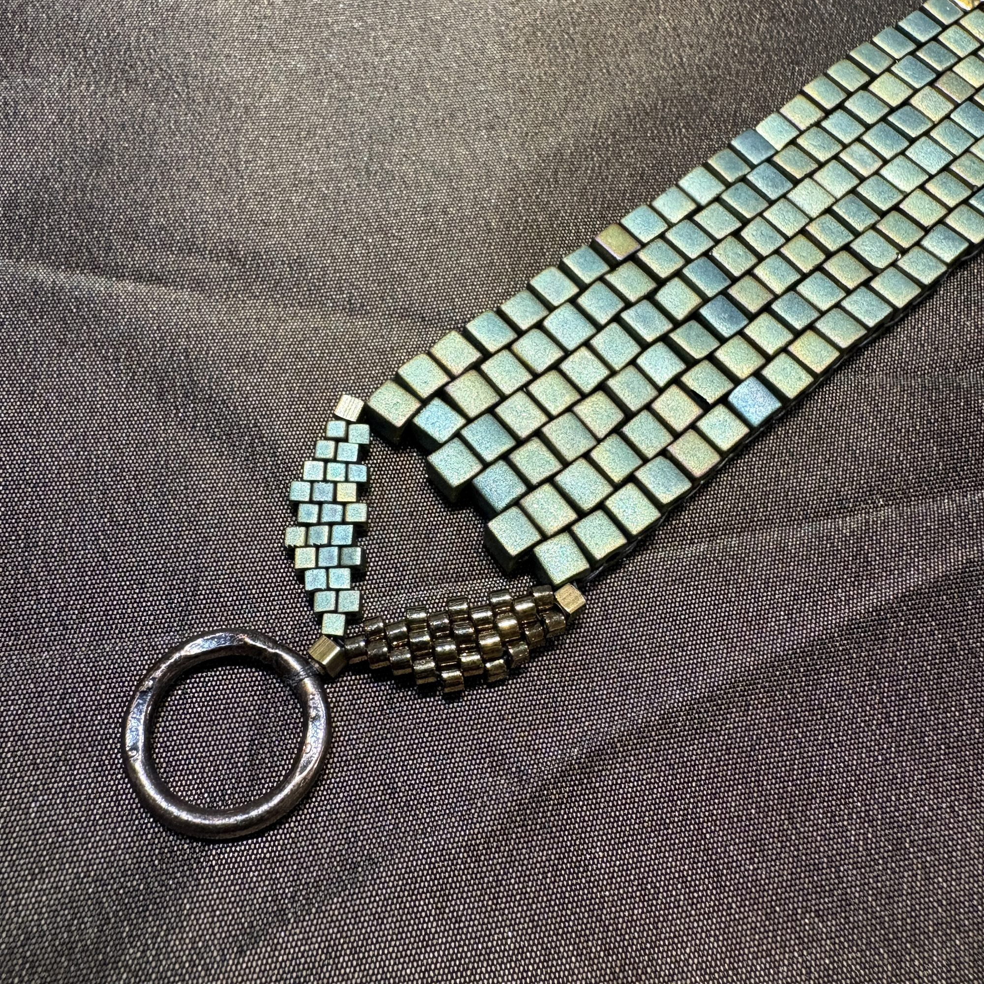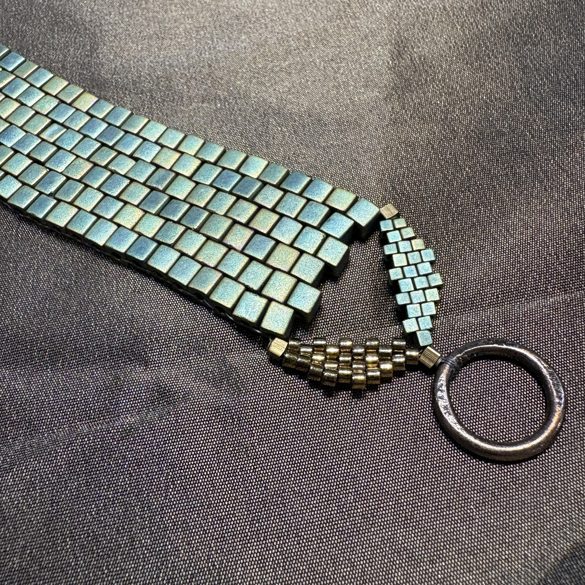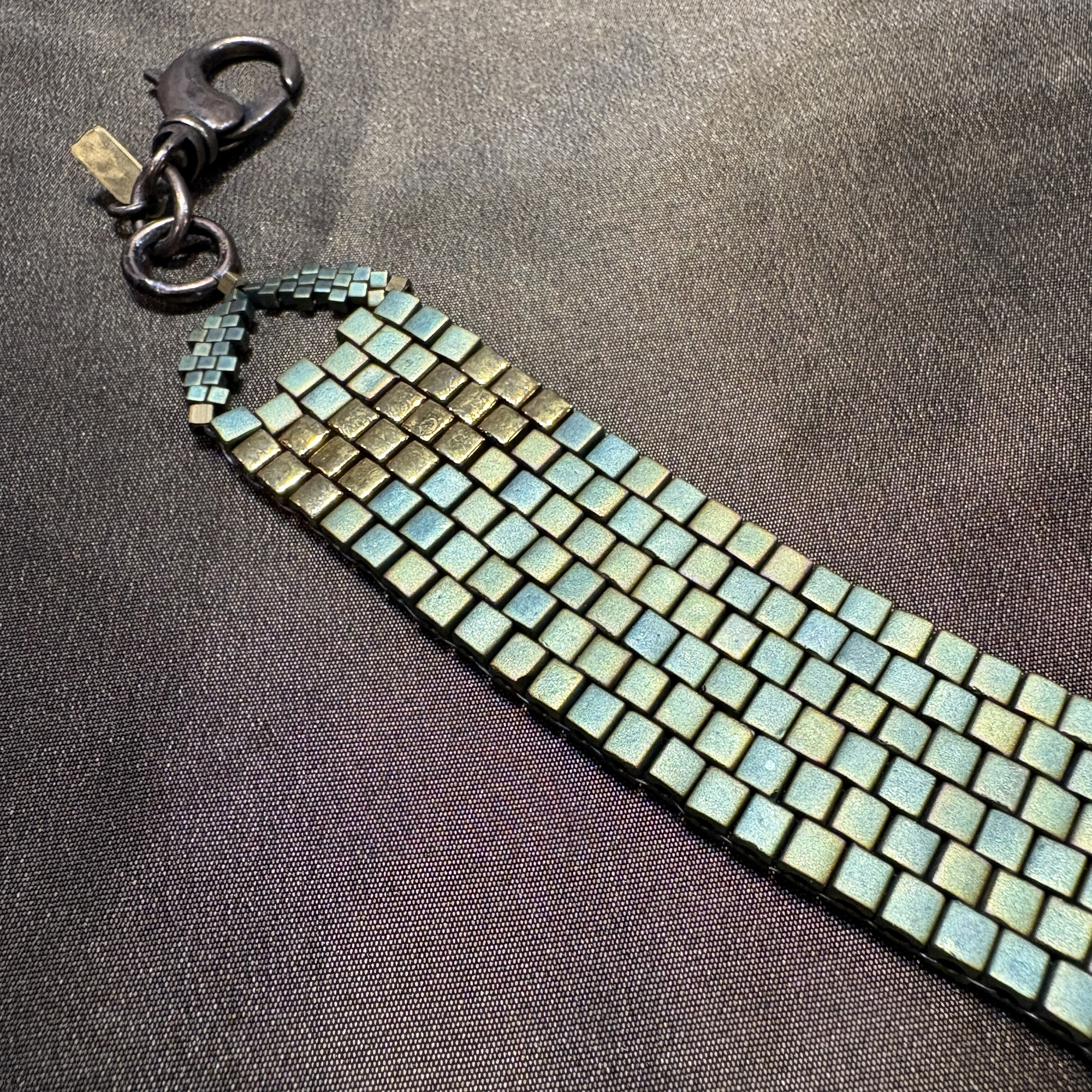 6 rows of 4mm turq and shiny bronze. Turquoise green cubes adorned with a row of shiny bronze for elegance length 7 1/2”.