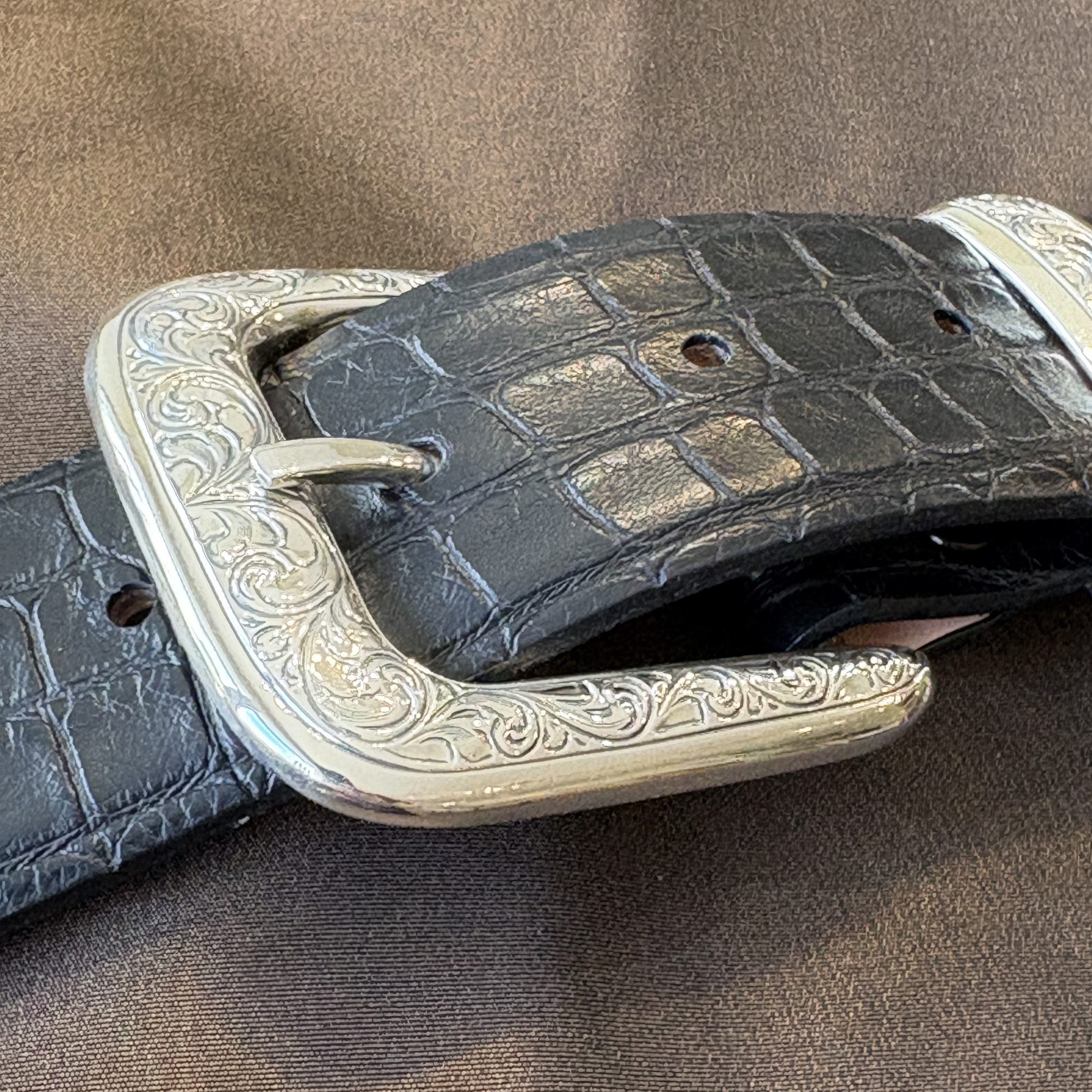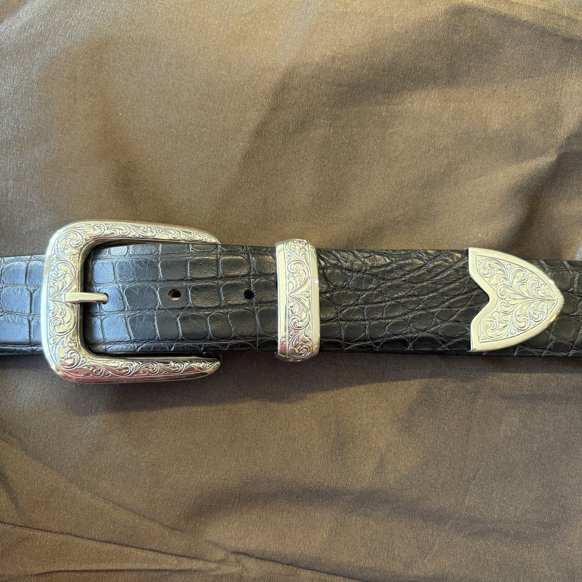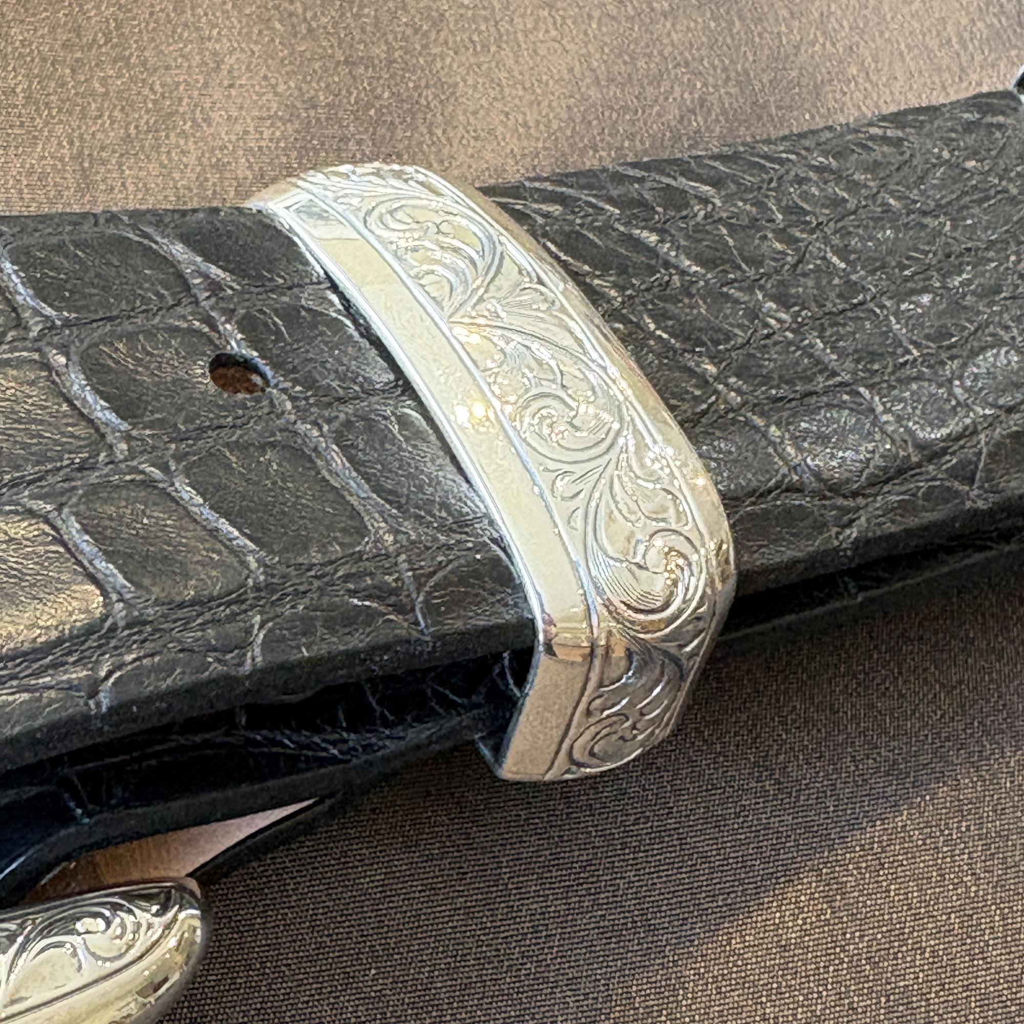 Hand-engraved scrollwork flows across the buckle, keeper, and tip of this sterling silver three-piece set. Framed by a 1/8″ smooth border and finished with an antique patina. Designed to fit a 1½” belt.