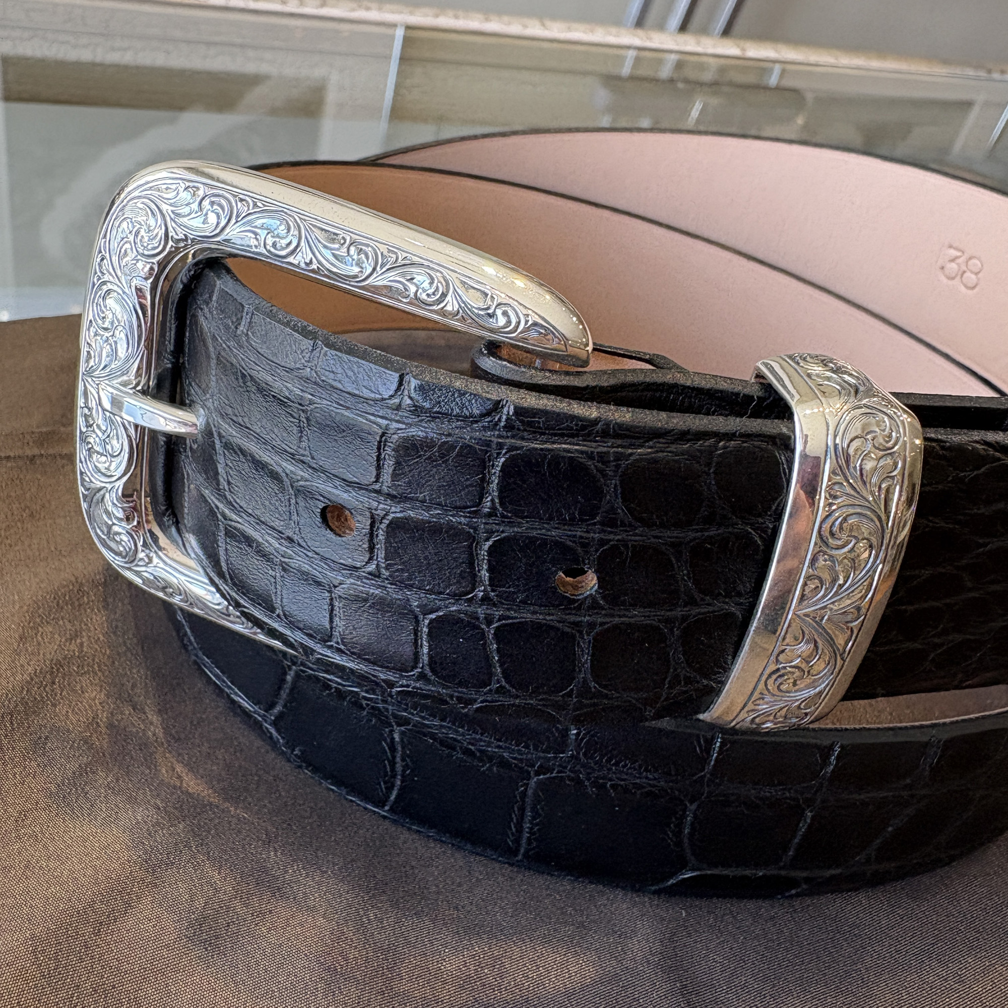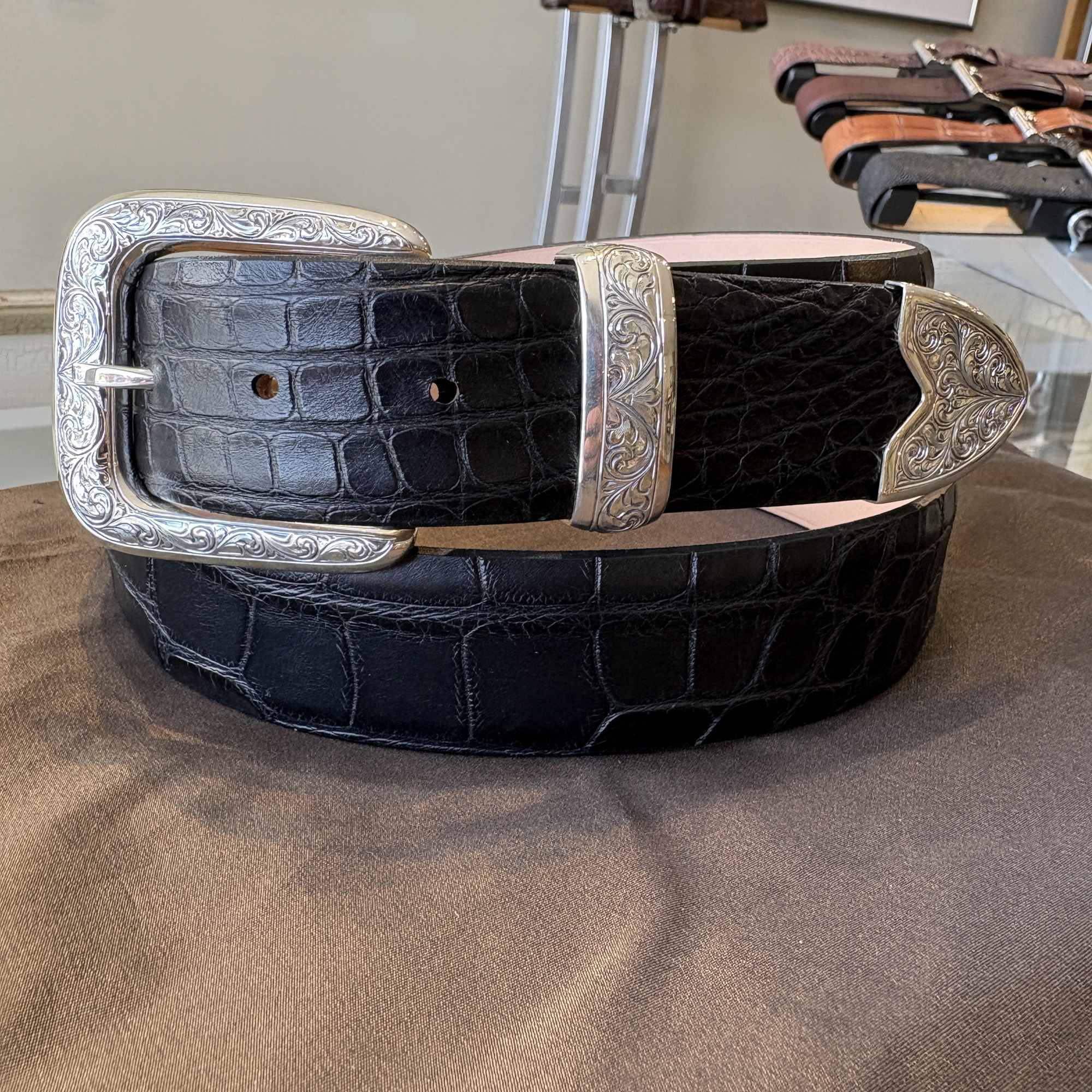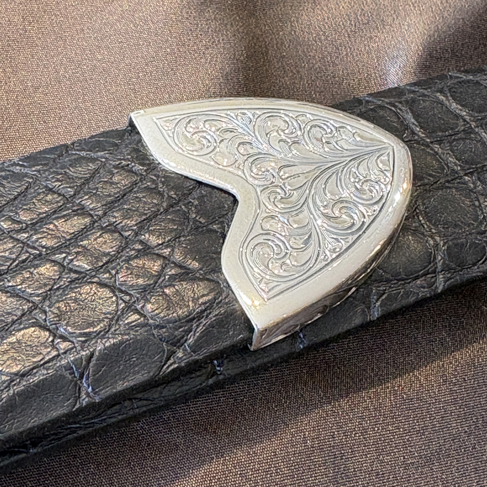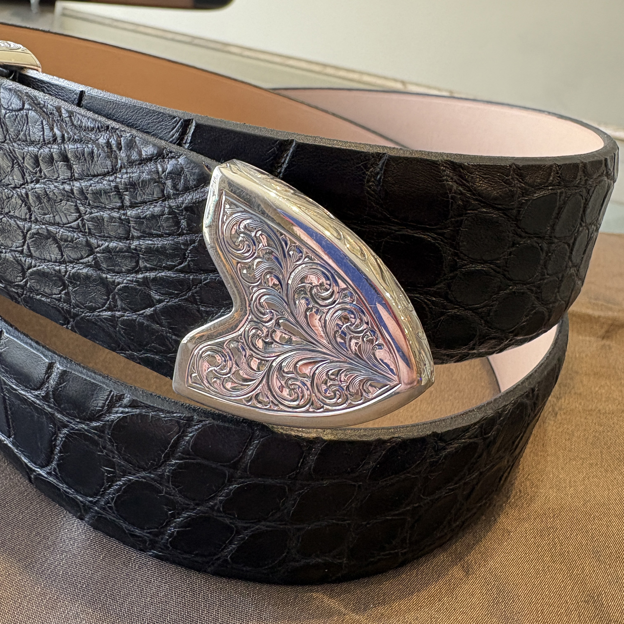 Hand-engraved scrollwork flows across the buckle, keeper, and tip of this sterling silver three-piece set. Framed by a 1/8″ smooth border and finished with an antique patina. Designed to fit a 1½” belt.