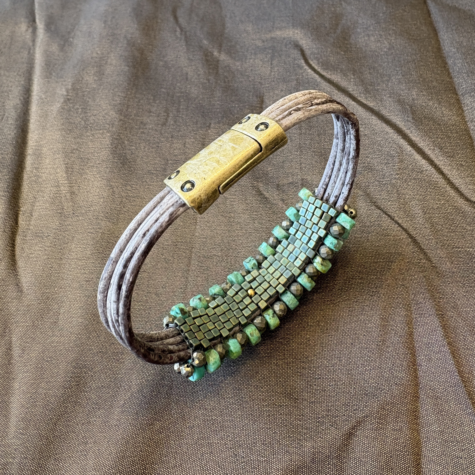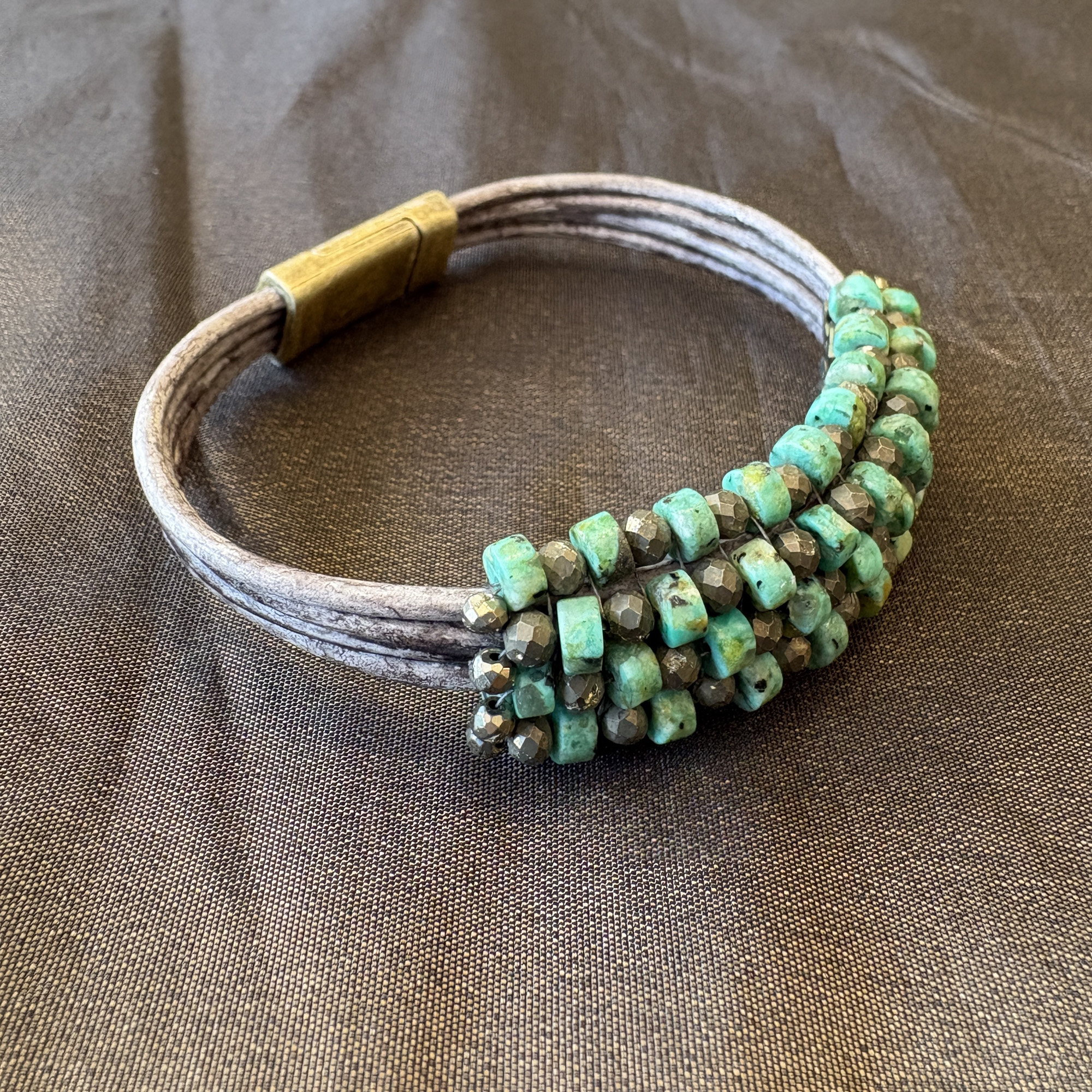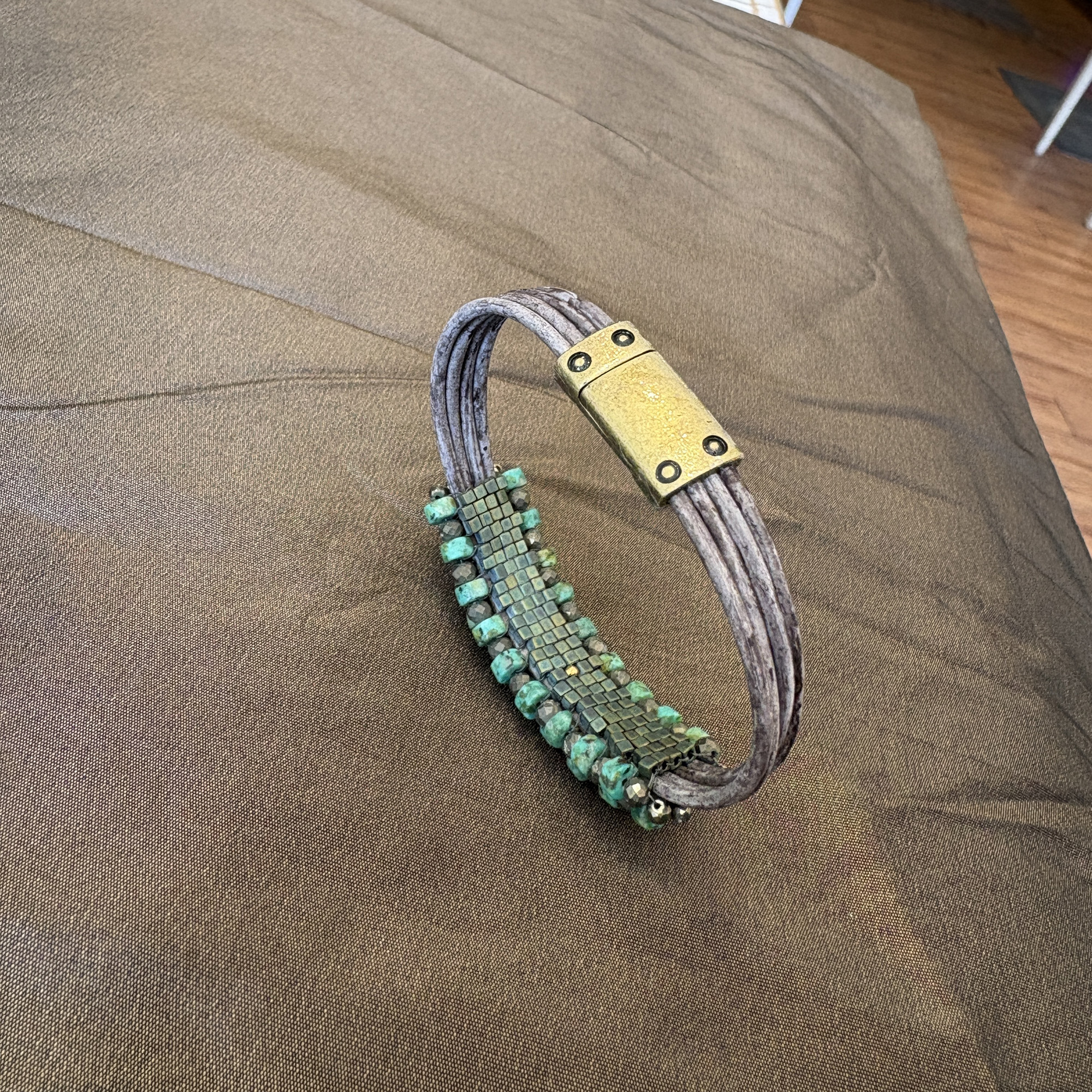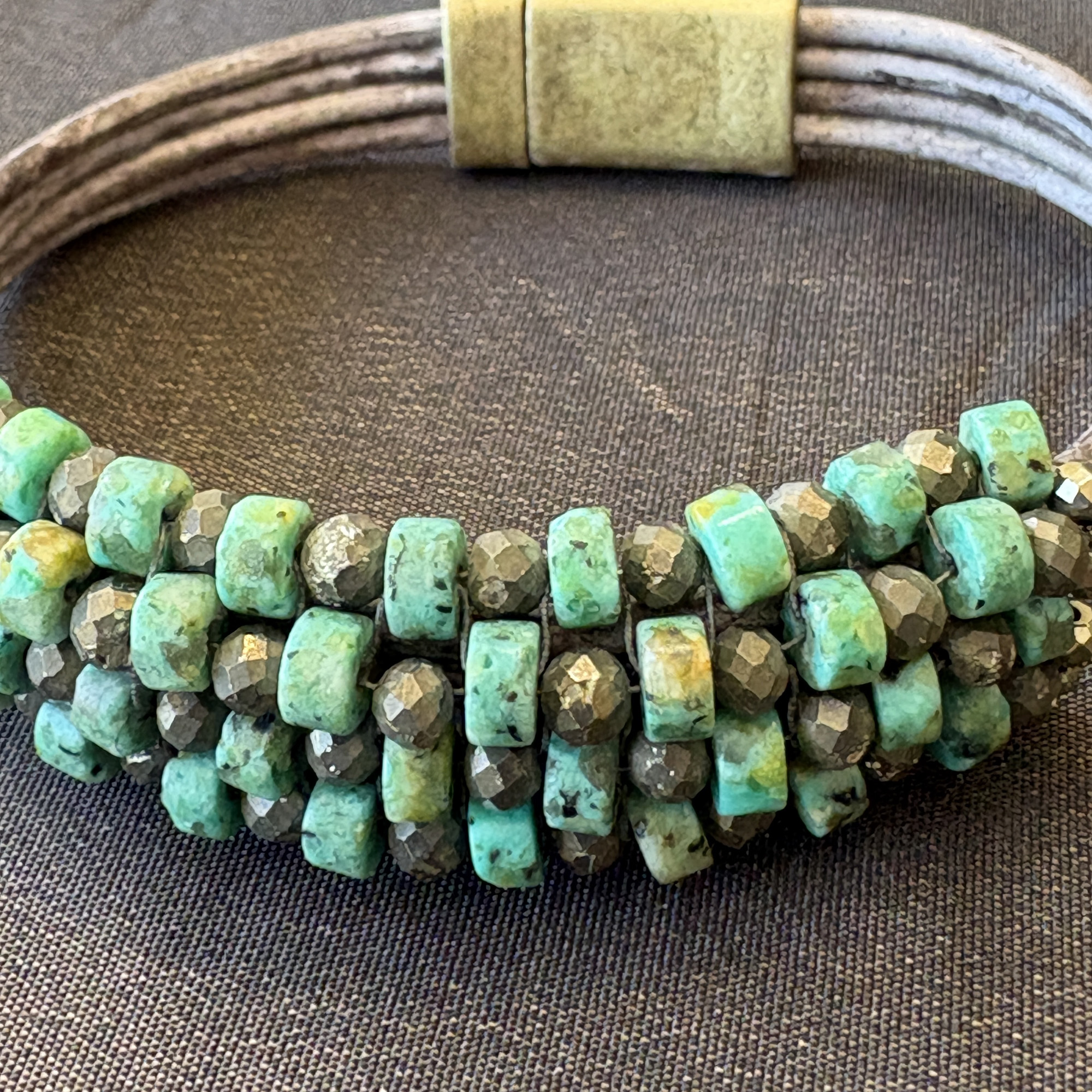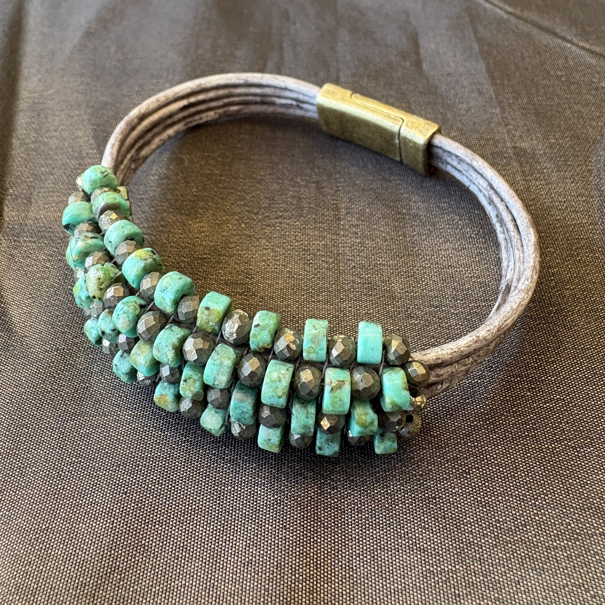 Four tan/grey leather strands with bronze magnet clasp. Five rows of turquoise and pyrite alternating in a checkerboard style finish.