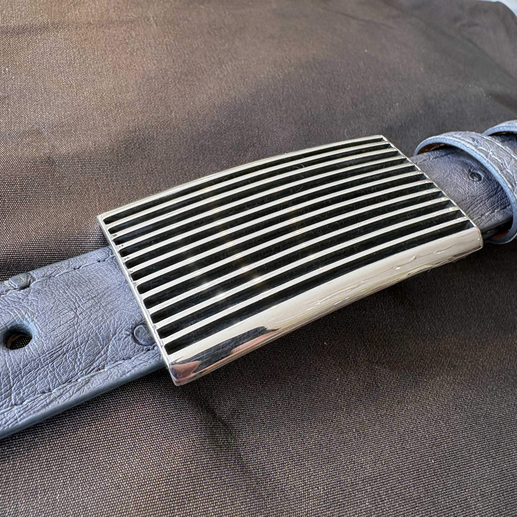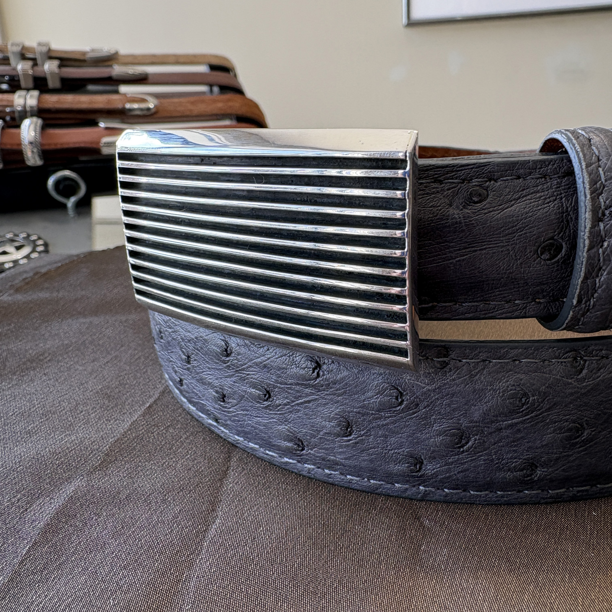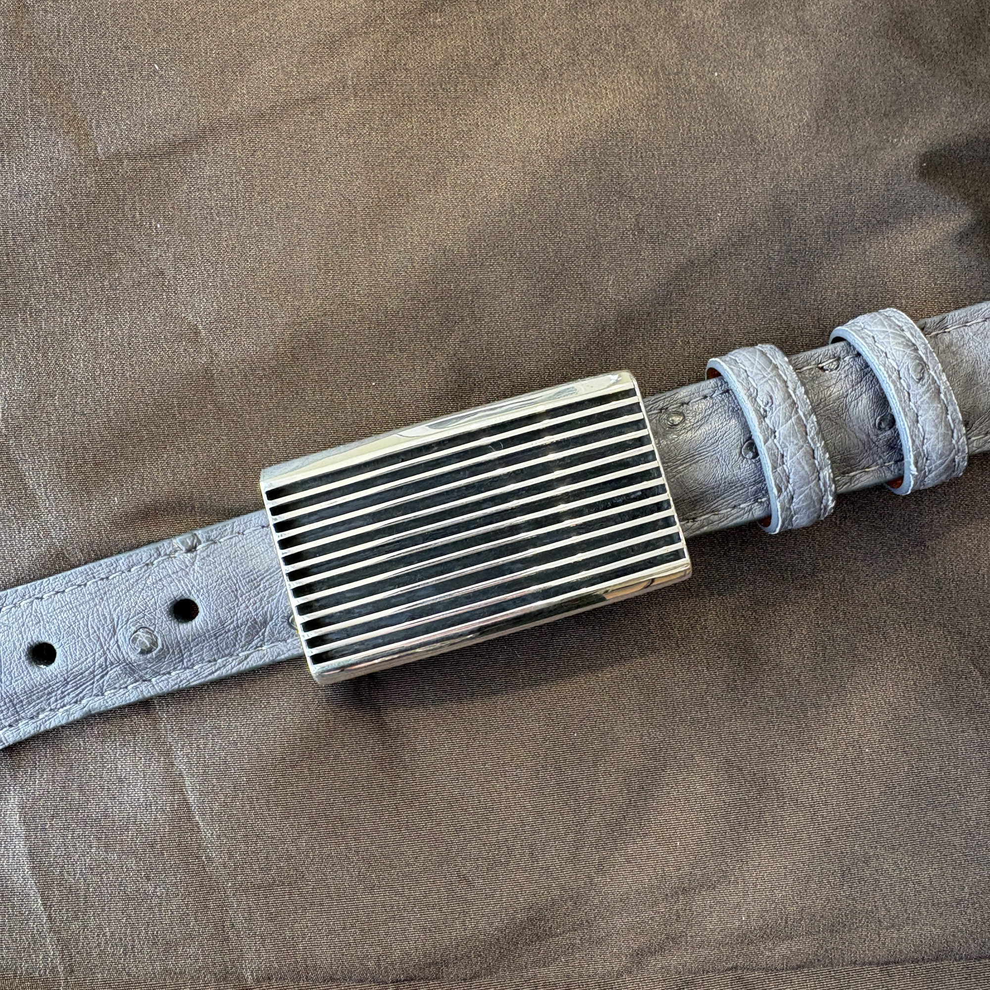 Designed by the late Francis Jones Navajo made rectangle buckle with parallel lines. This is the narrower version of this buckle. It comes in two widths. This one is 1″ wide and is pictured on a grey ostrich quill strap. All sterling silver. There are just two of these buckles left.