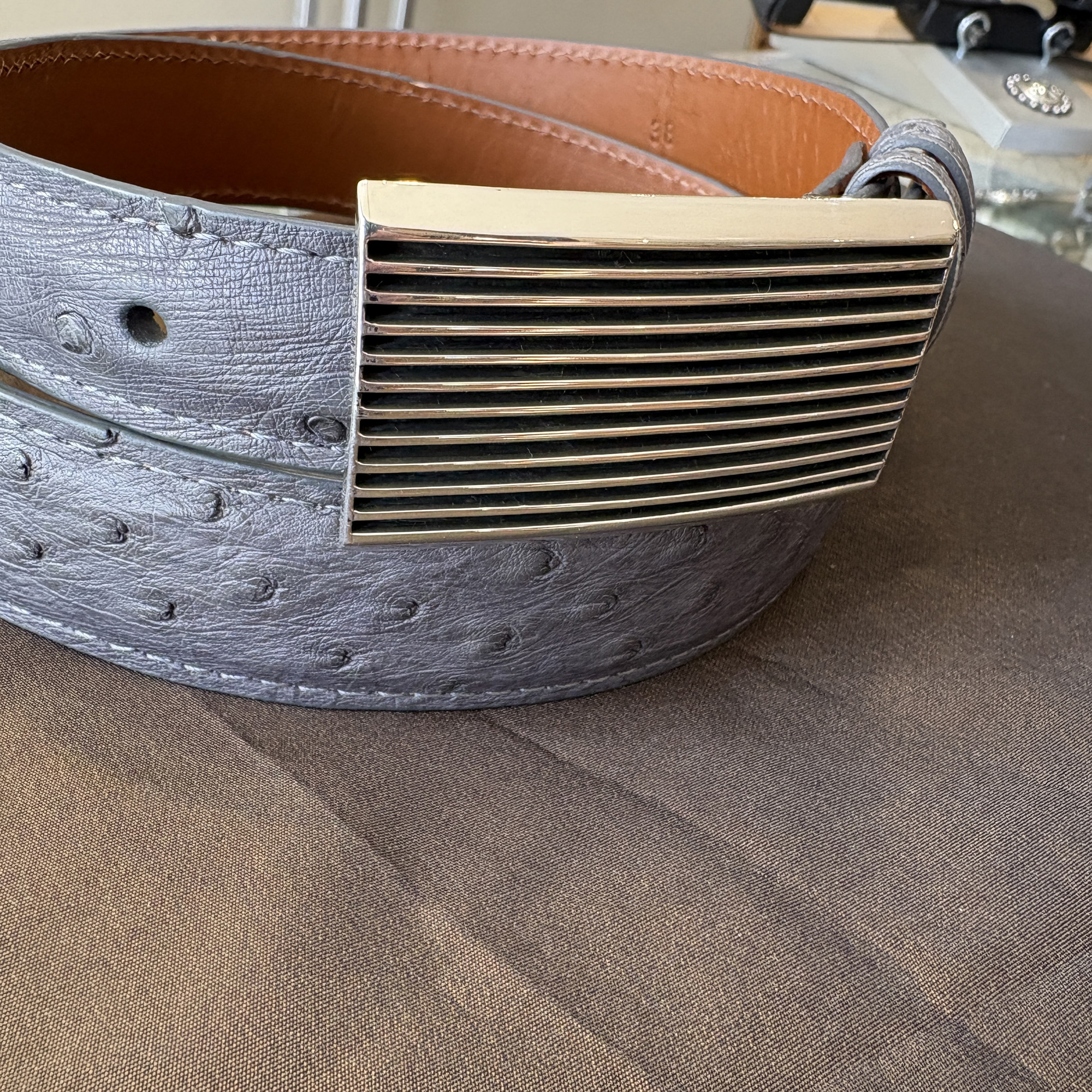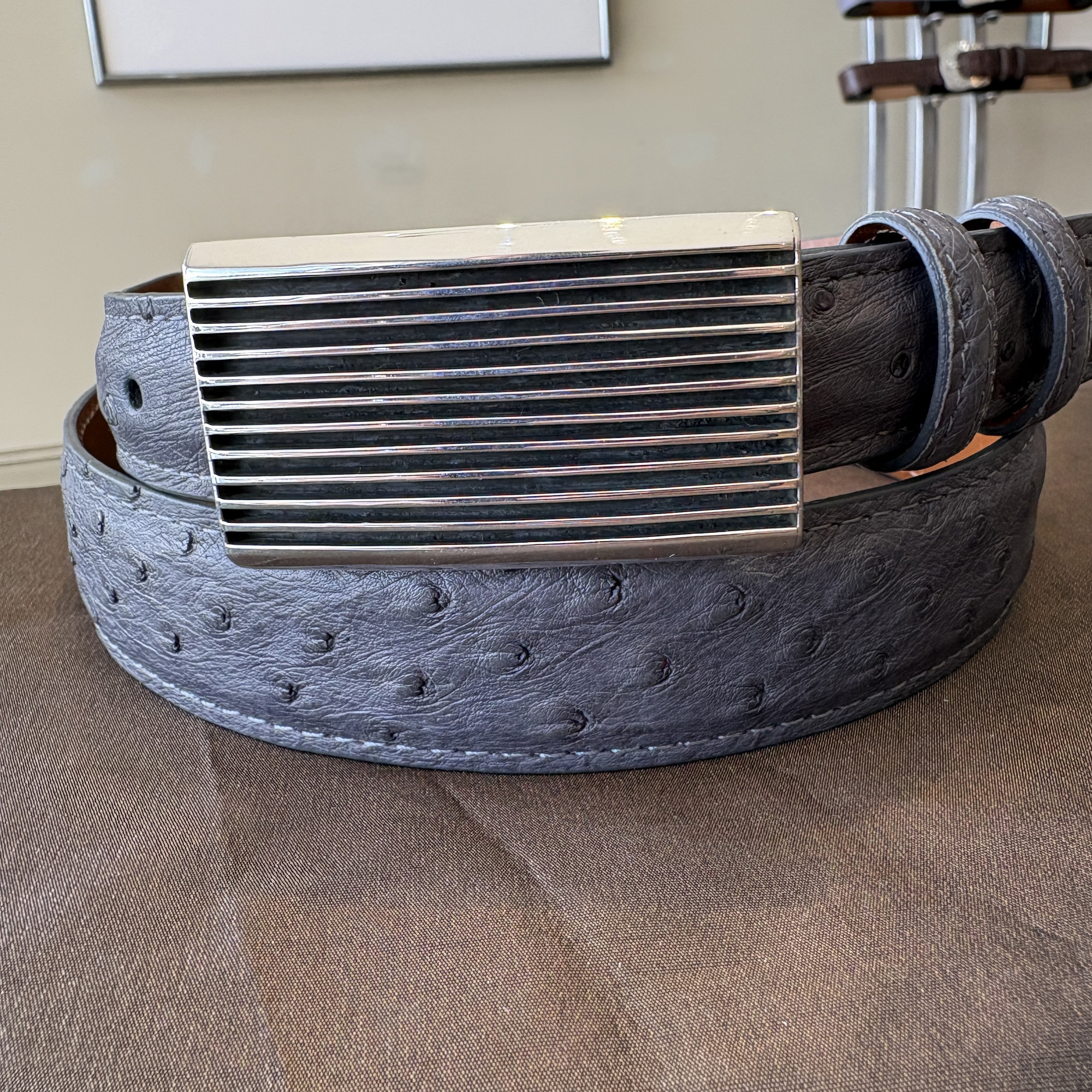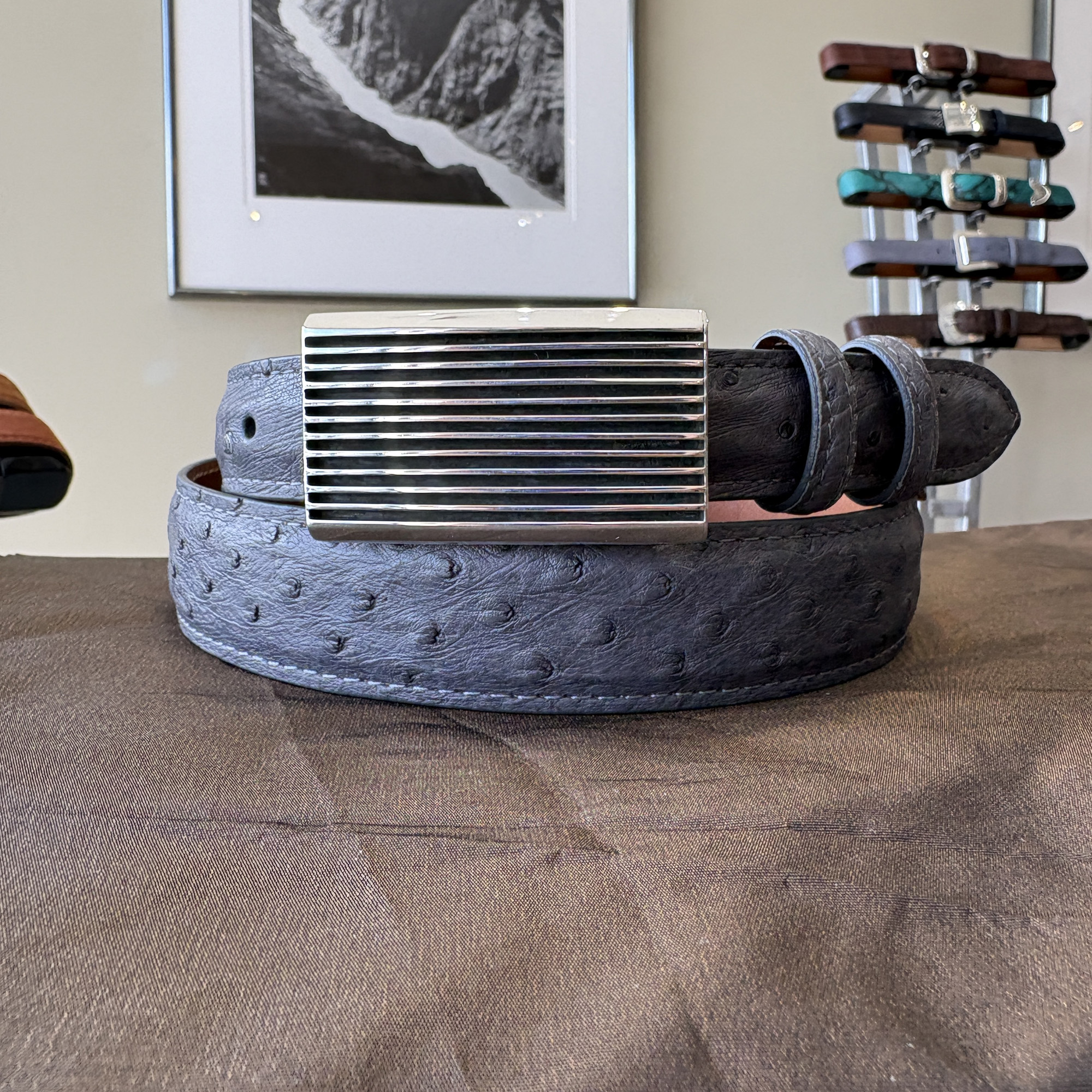 Designed by the late Francis Jones Navajo made rectangle buckle with parallel lines. This is the narrower version of this buckle. It comes in two widths. This one is 1″ wide and is pictured on a grey ostrich quill strap. All sterling silver. There are just two of these buckles left.