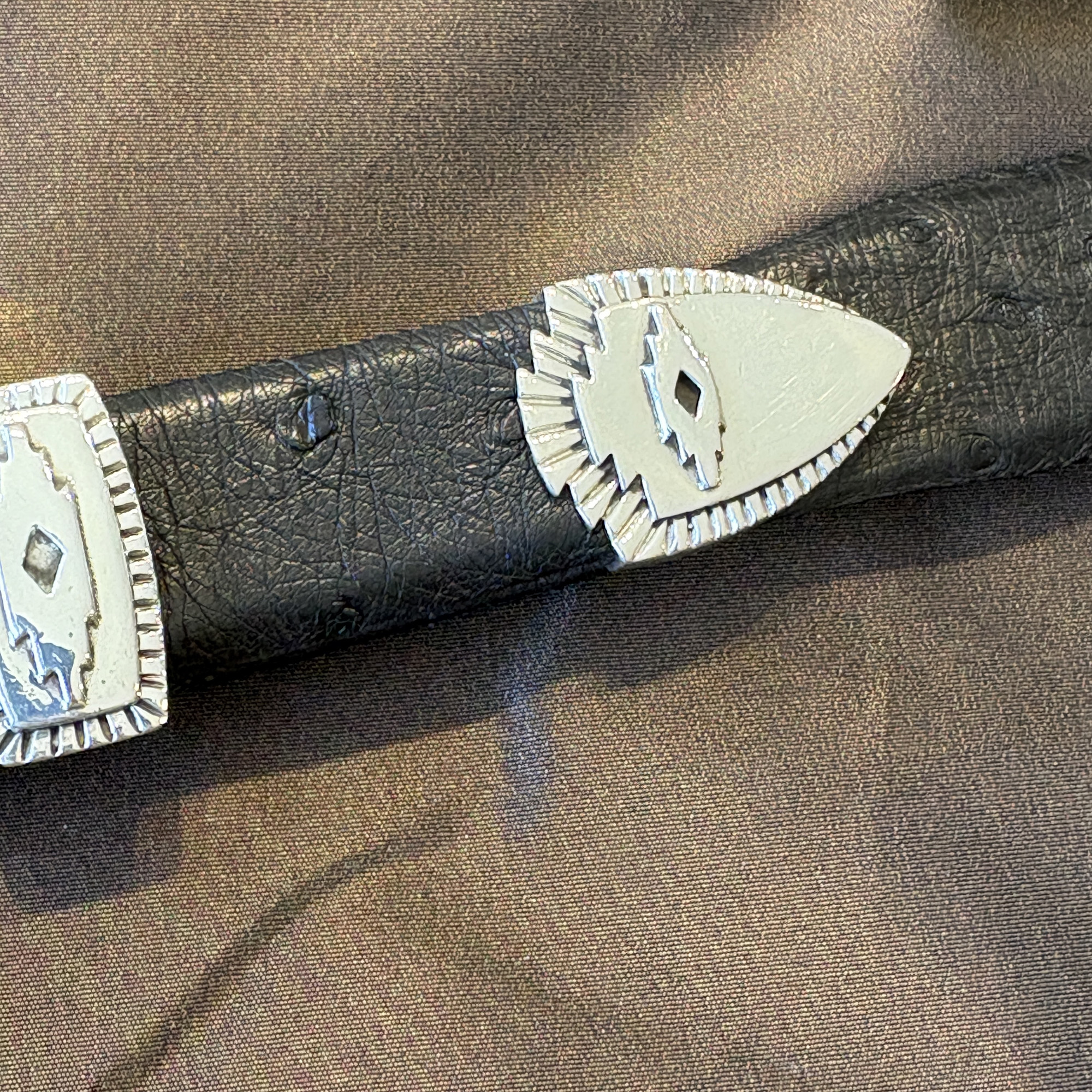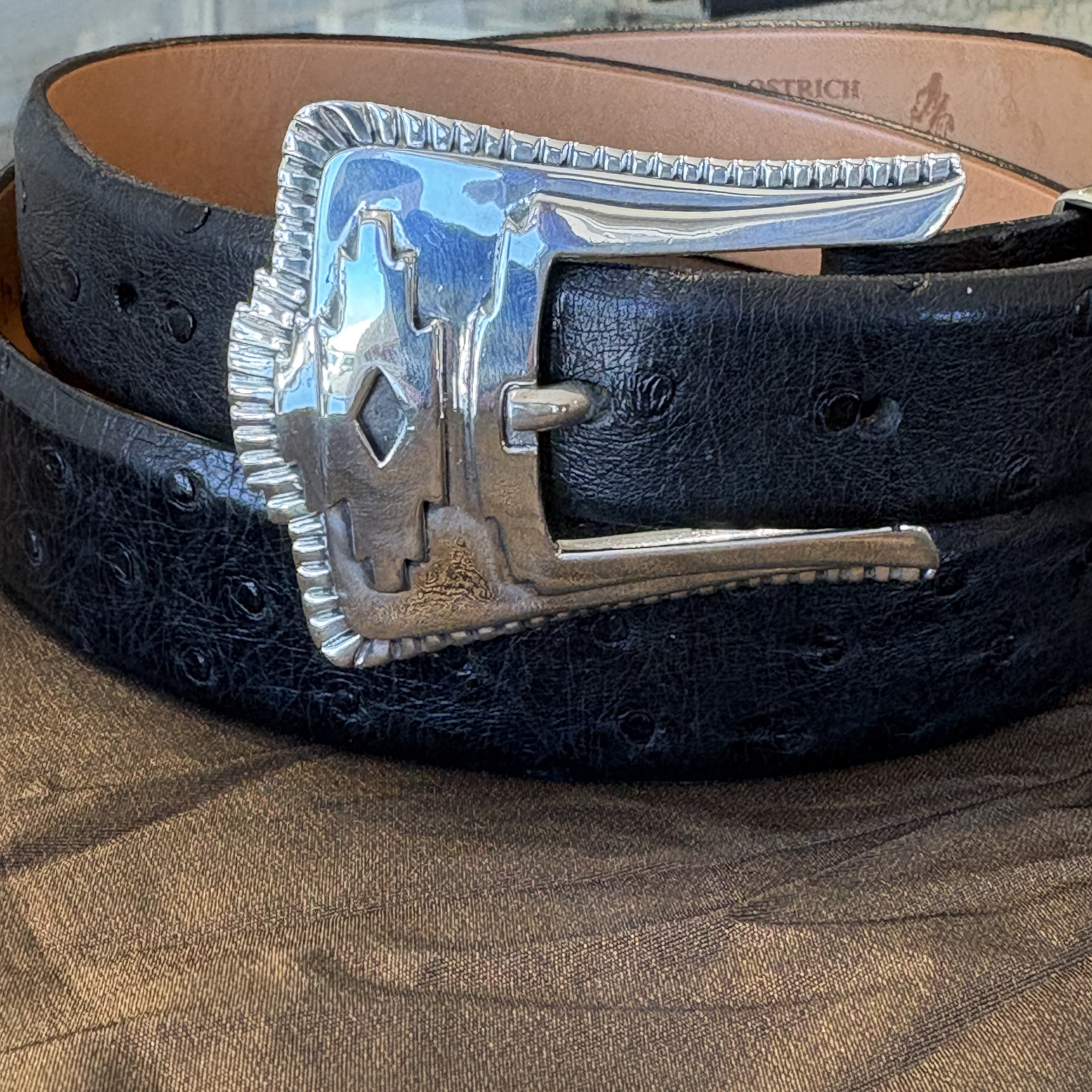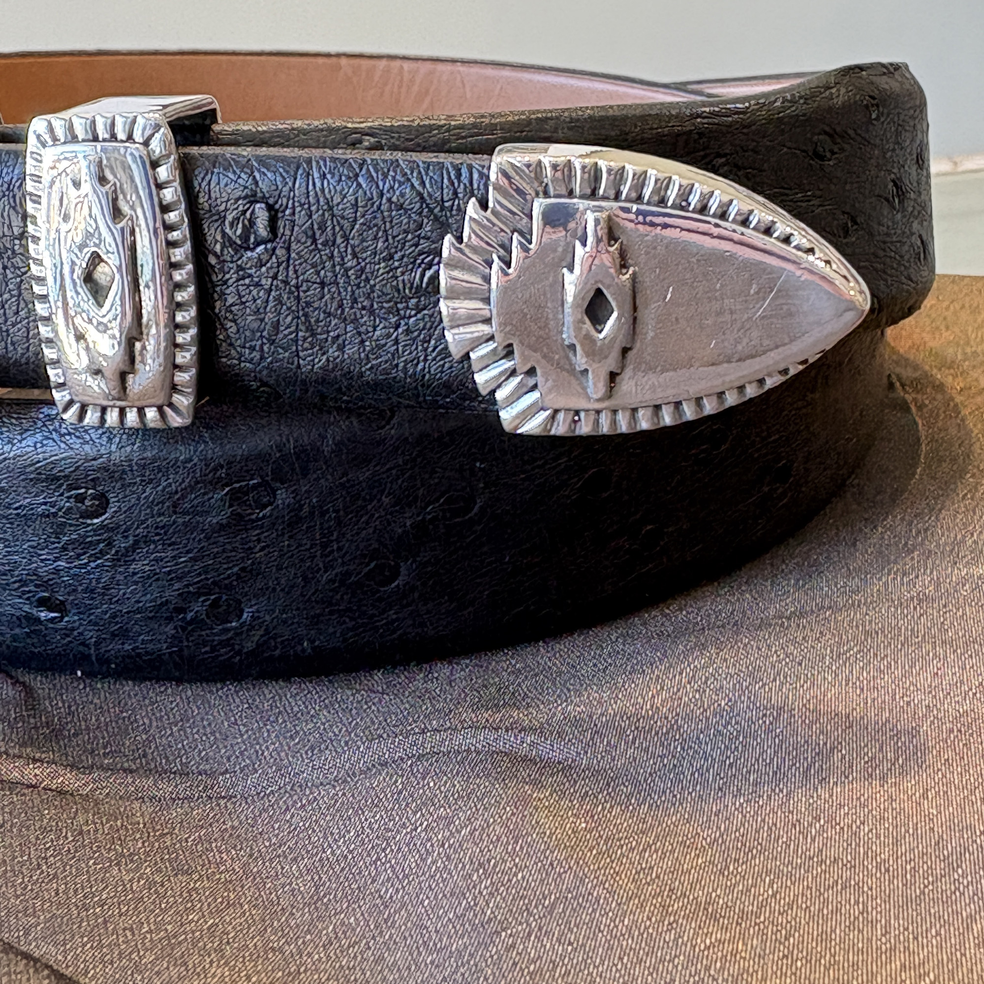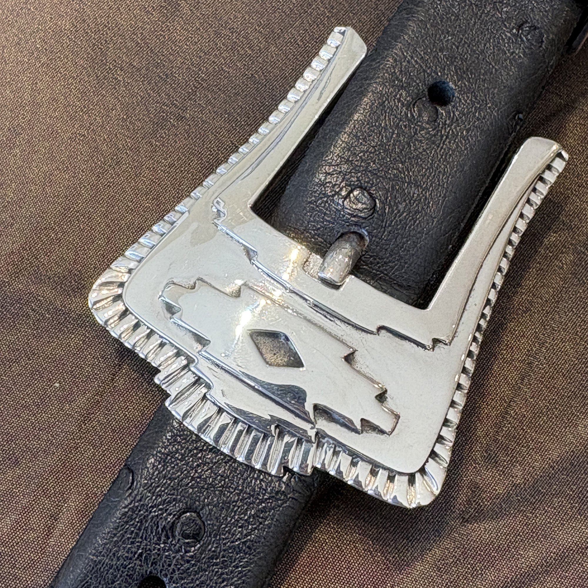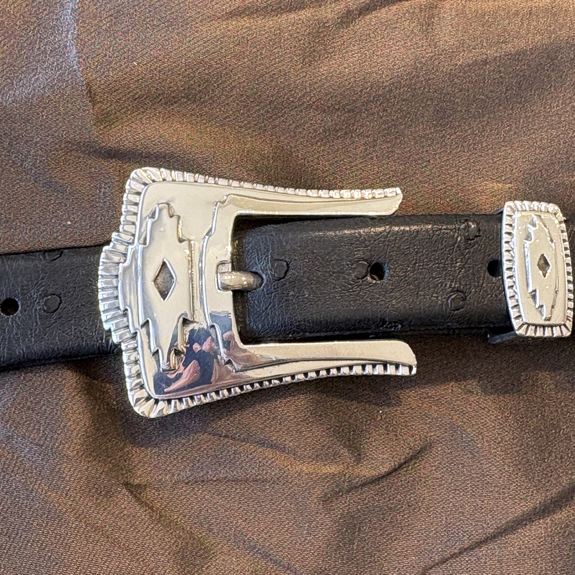 Here is a pre-owned James Reid buckle set that has a unique southwest flavor. It fits a 1″ belt and is shown here on a black ostrich leather. This buckle has been worn, but looks great. It has been buffed out and polished up. They don’t make buckles like this anymore. Get it while you can.