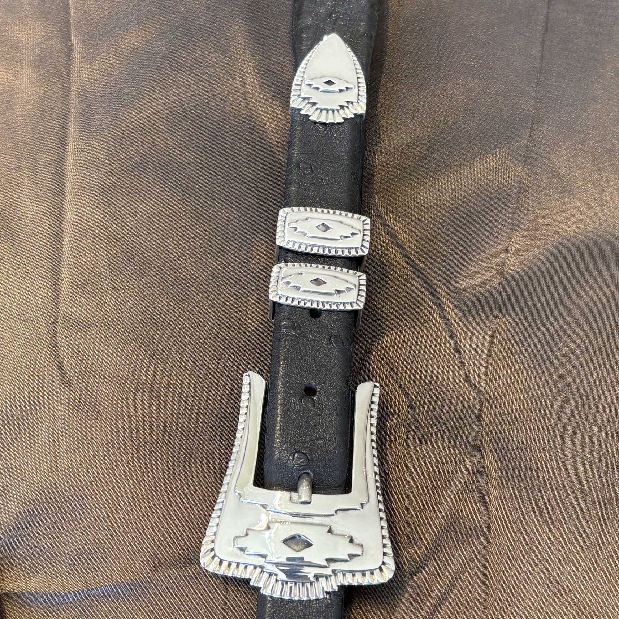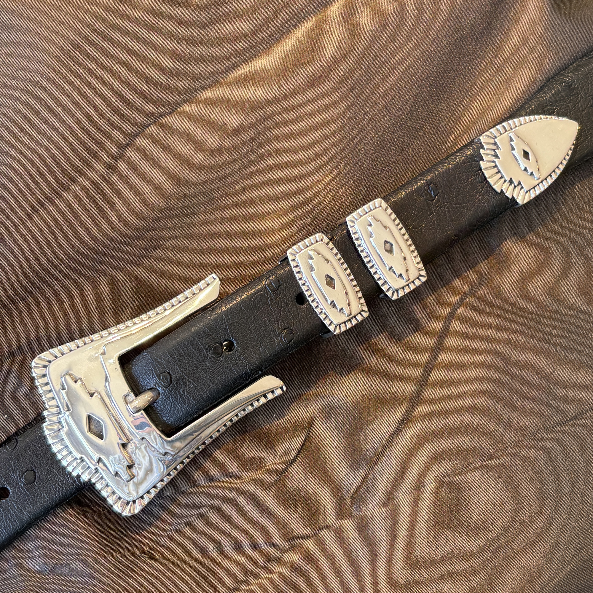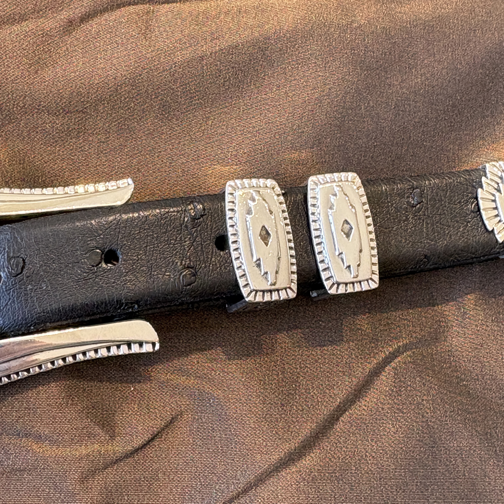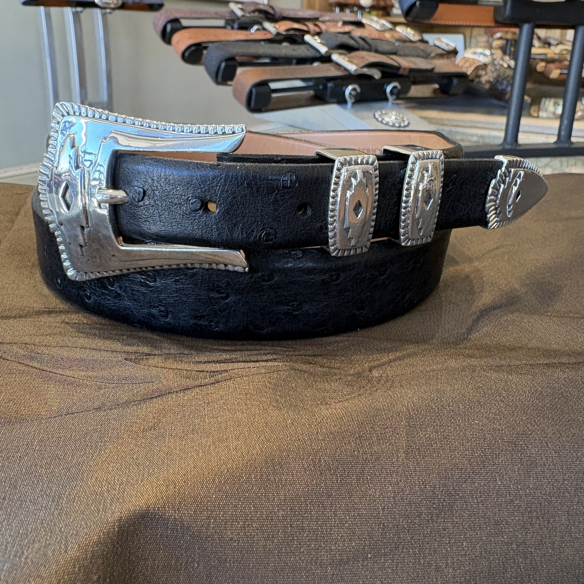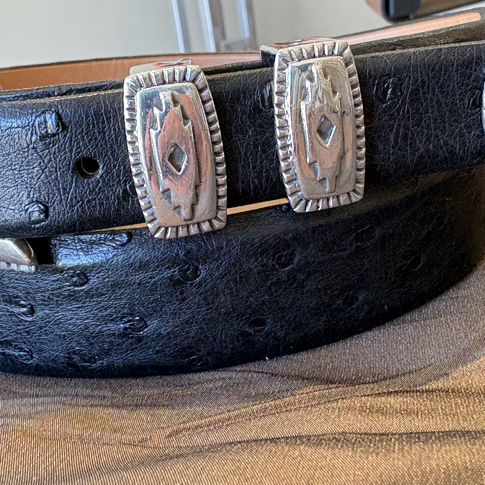 Here is a pre-owned James Reid buckle set that has a unique southwest flavor. It fits a 1″ belt and is shown here on a black ostrich leather. This buckle has been worn, but looks great. It has been buffed out and polished up. They don’t make buckles like this anymore. Get it while you can.
