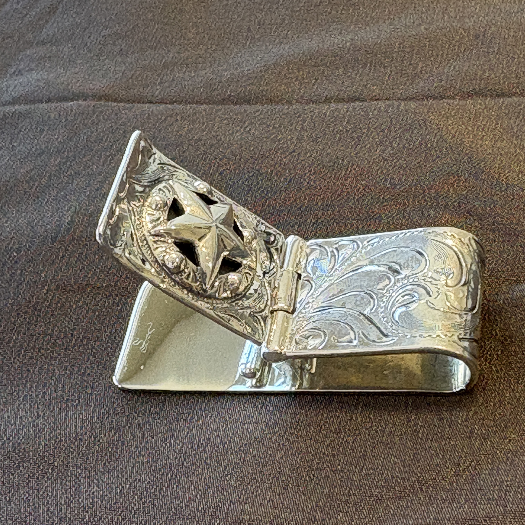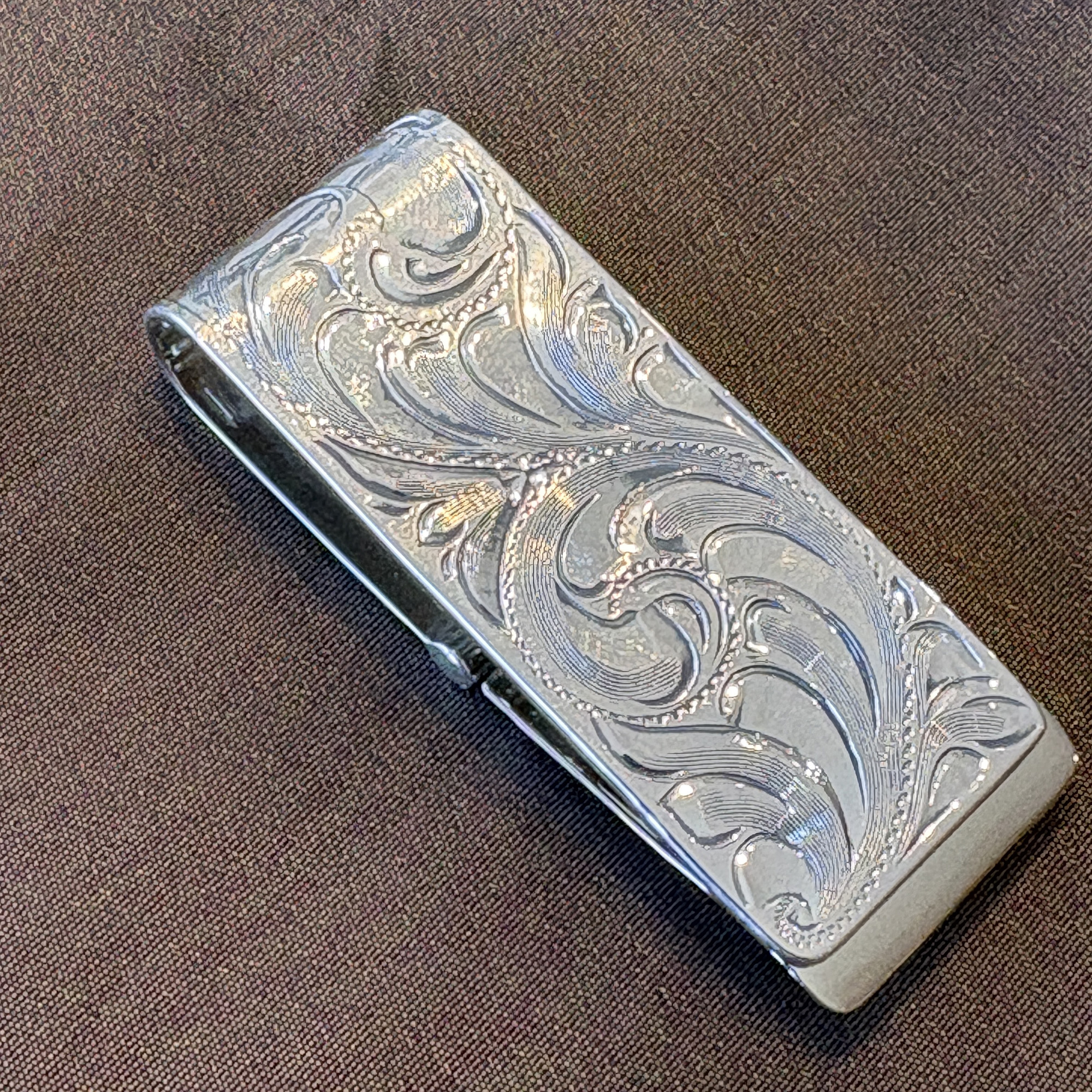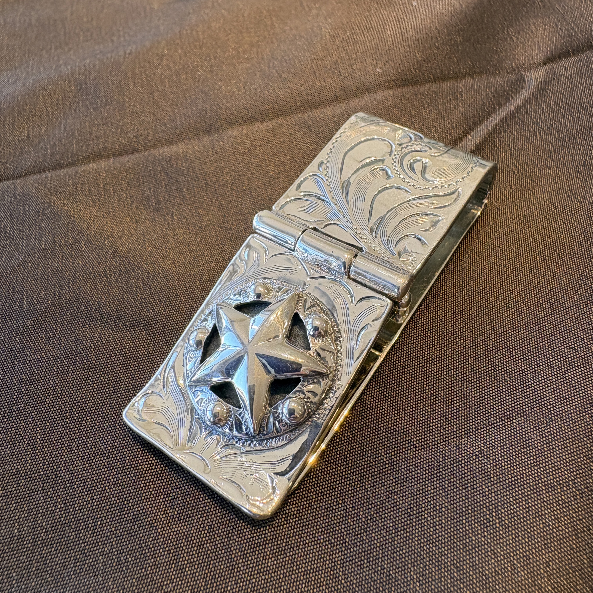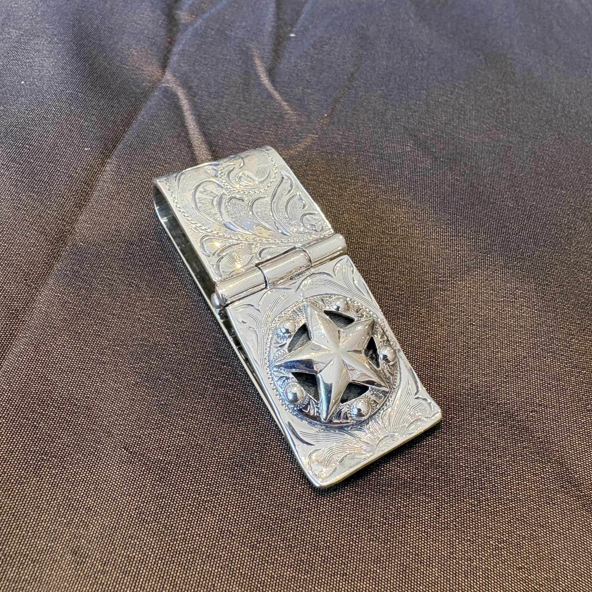This badge was inspired by those of the Old West and is made of sterling silver, set on a hinged cam. The hinged mechanism flips open and closed to allow for the contents to be removed and then secured. This antiqued sterling silver overlay 1 1/8″ money clip is fully hand engraved both front and back.
