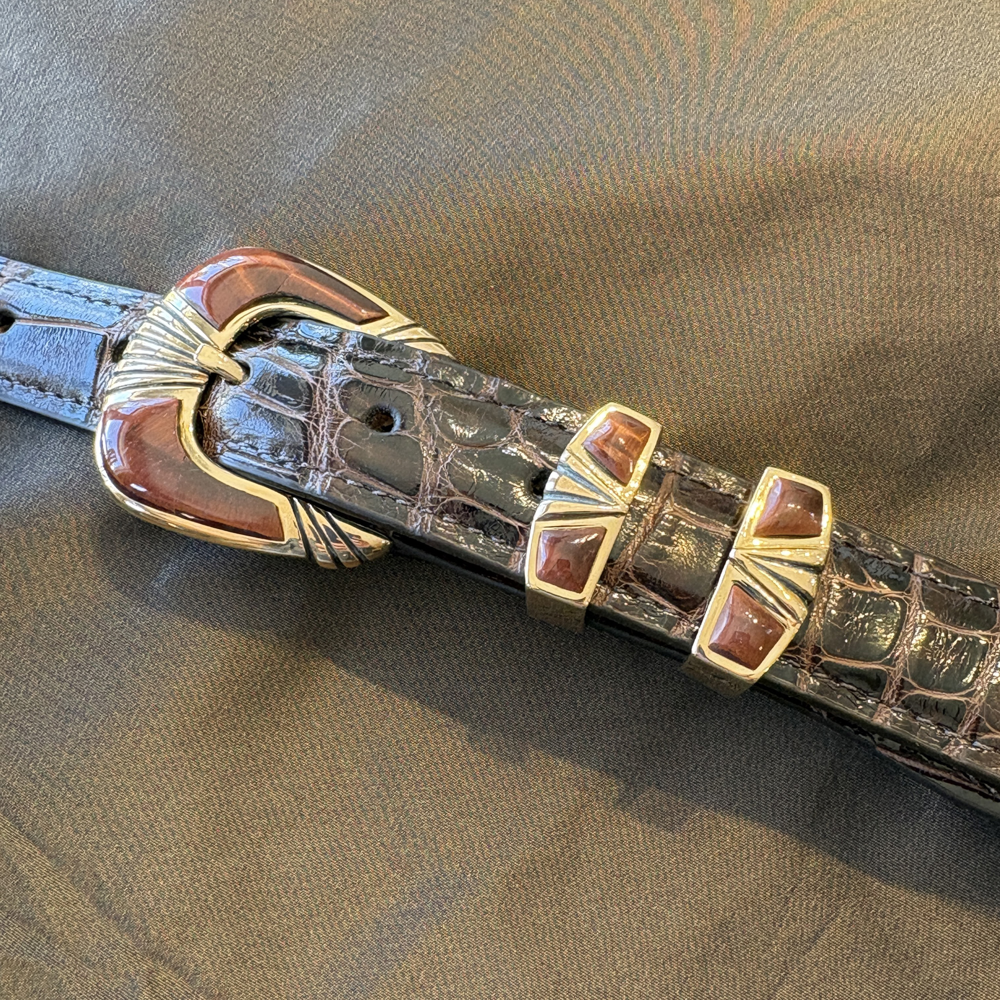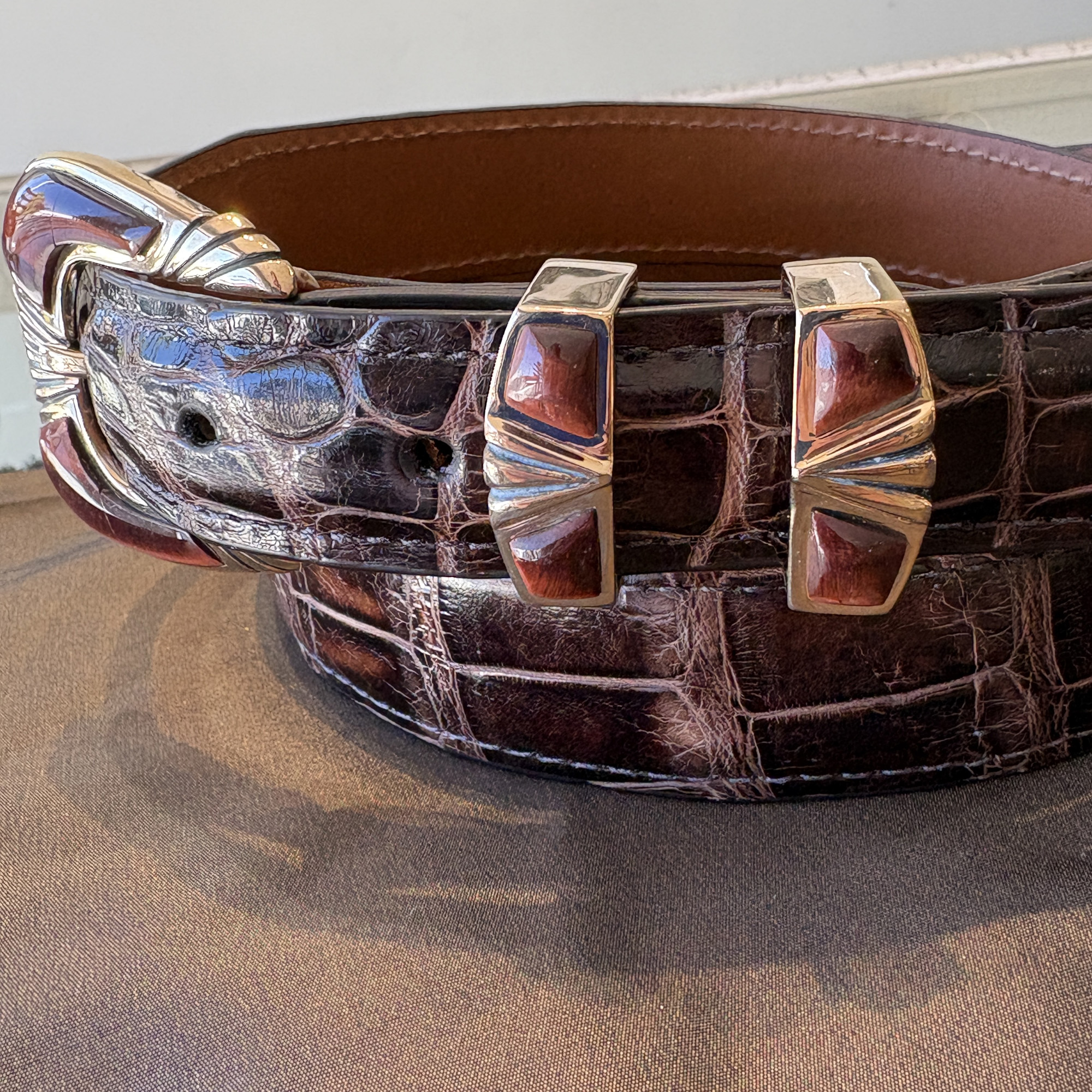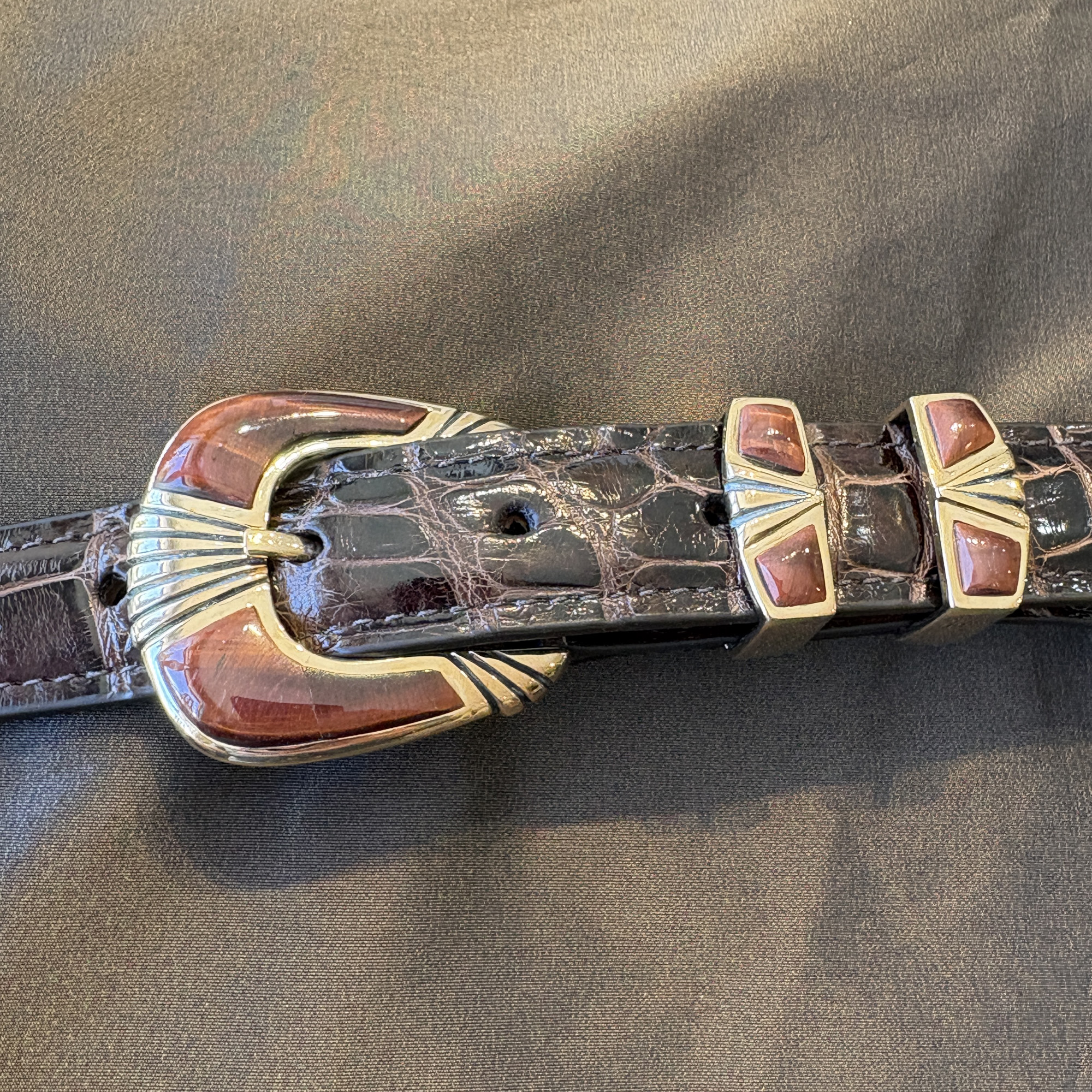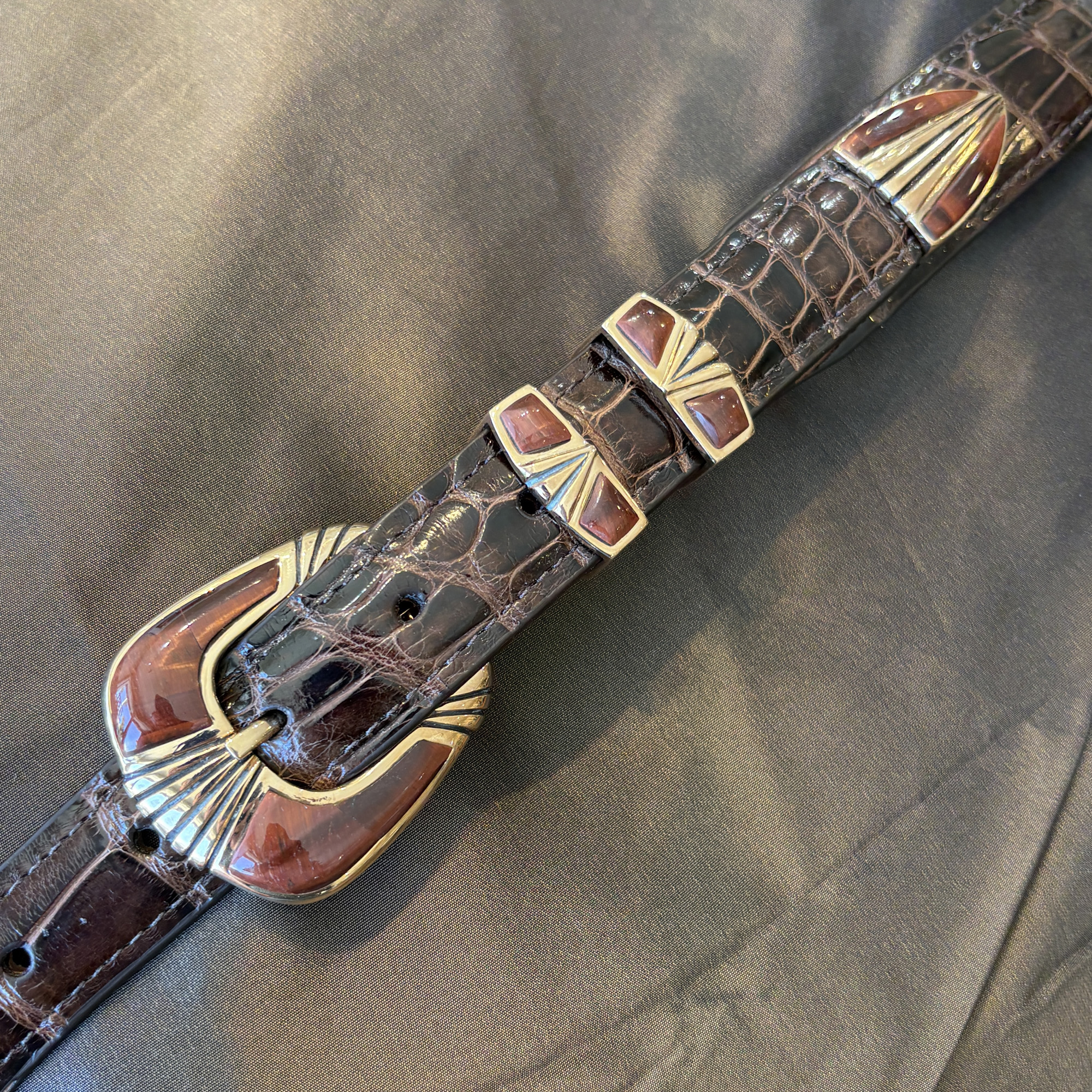Here is a beautiful four piece buckle set made out of rose bronze, instead of the usual sterling silver. Red tiger’s eye stones compliment the gold/bronze coloring of the metal. It will fit a 1″ width belt and looks great on this classic dark brown alligator.