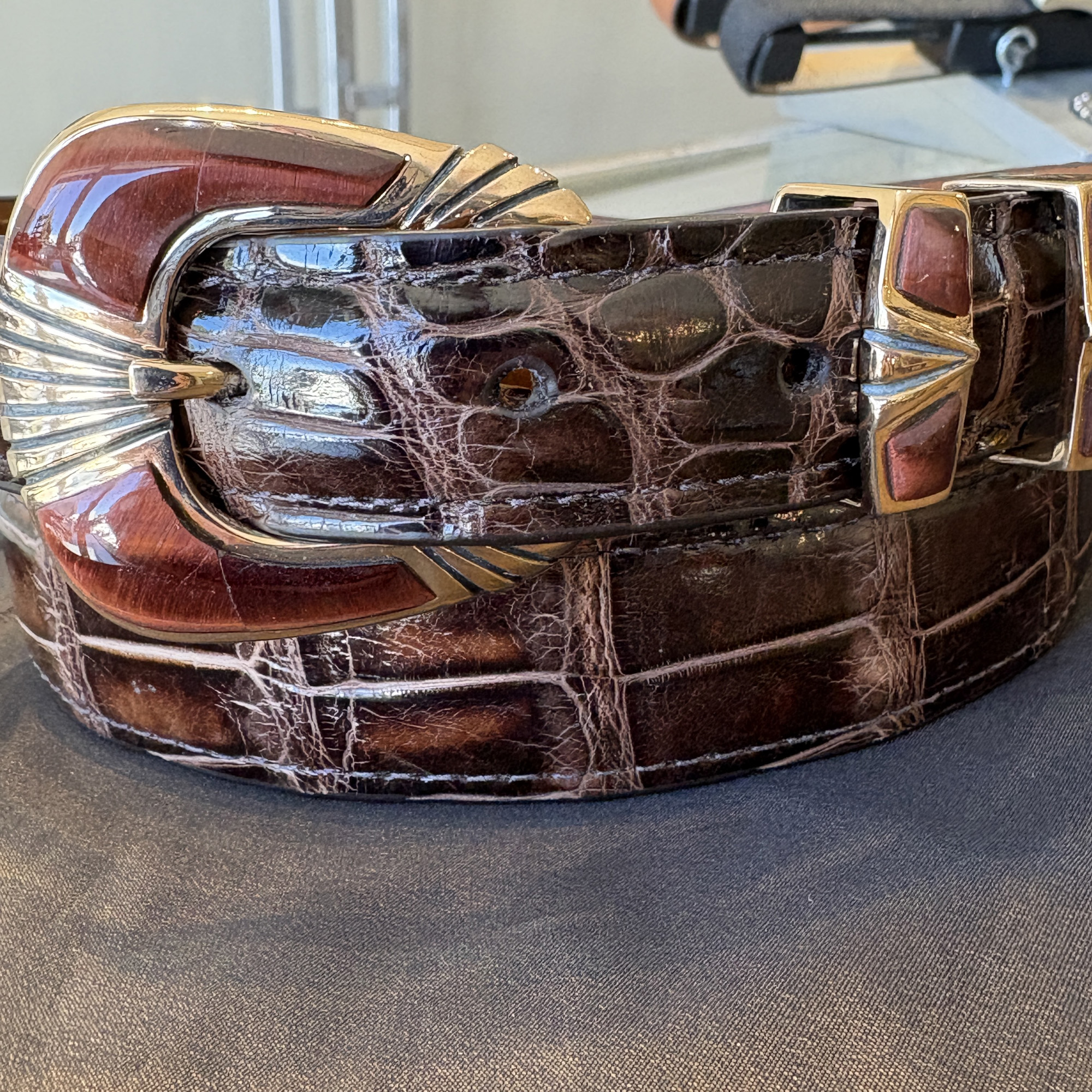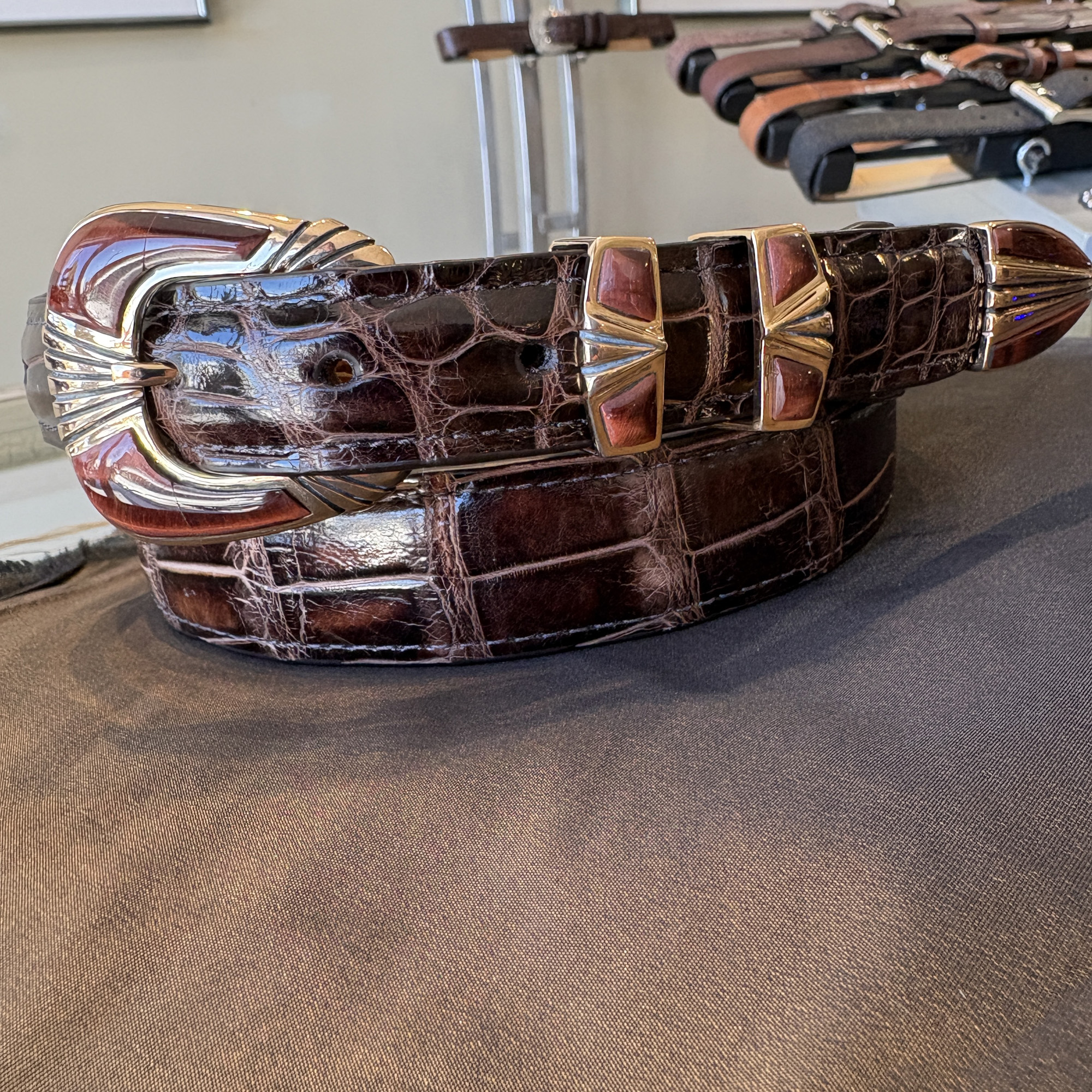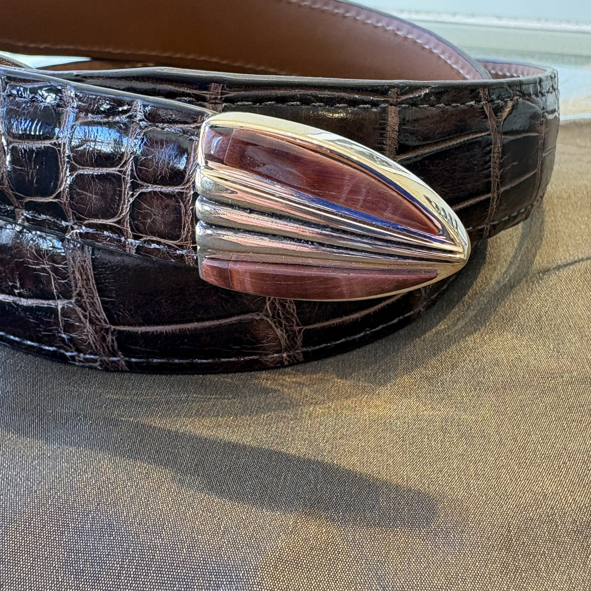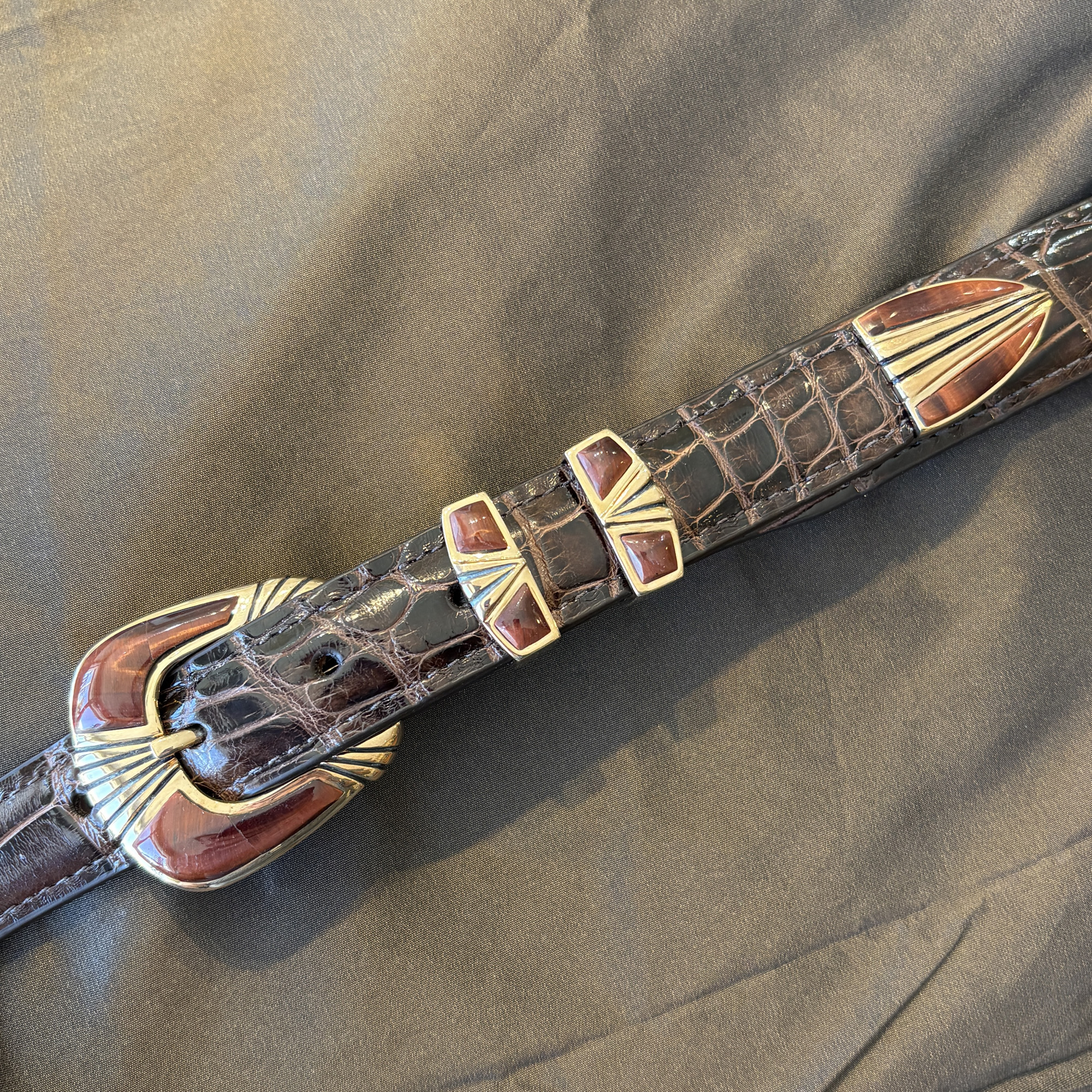 Here is a beautiful four piece buckle set made out of rose bronze, instead of the usual sterling silver. Red tiger’s eye stones compliment the gold/bronze coloring of the metal. It will fit a 1″ width belt and looks great on this classic dark brown alligator.
