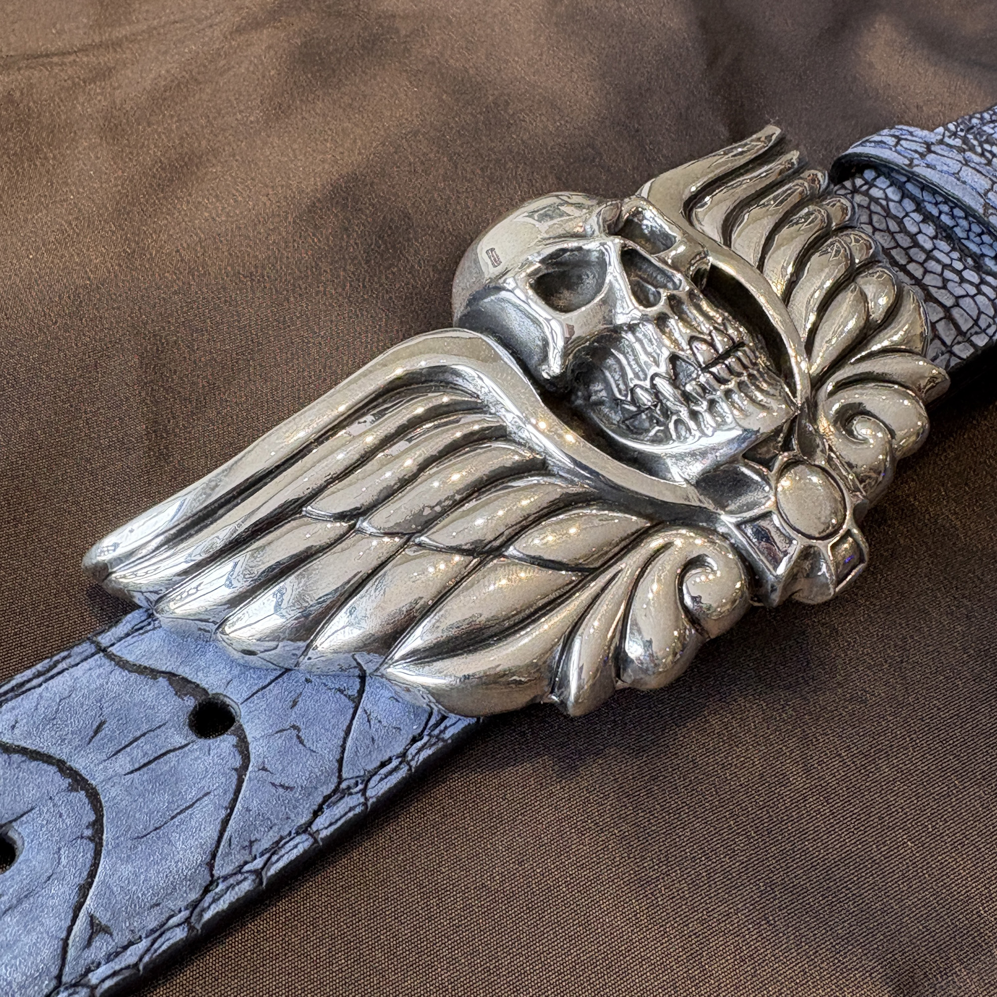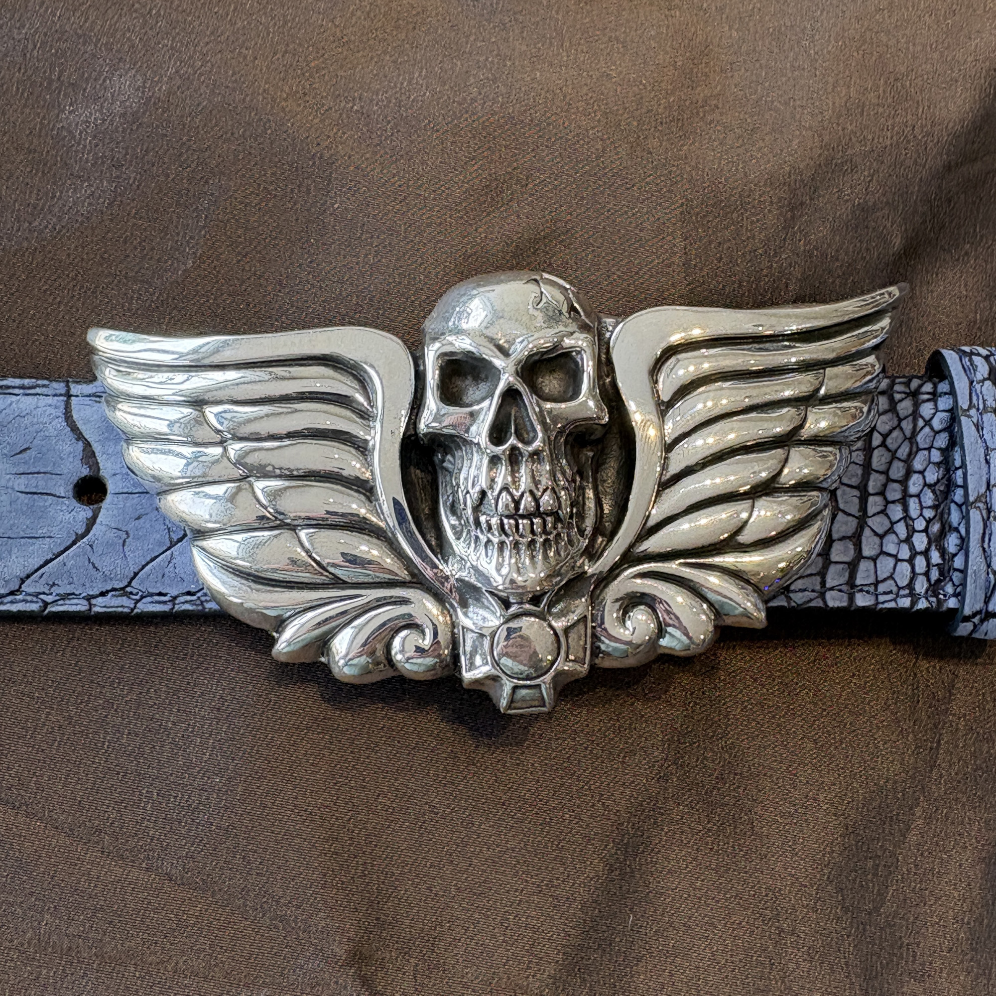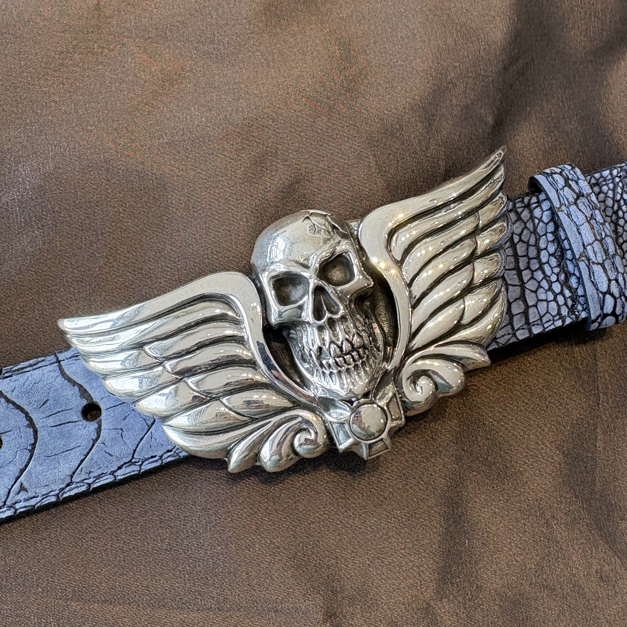 Here is the incredible large skull buckle with wings and iron cross. It’s a very heavy duty buckle. Definitely for the unconventional man or woman. This buckle makes a statement, that you’ll not take nuthin’ from nobody. It fits an 1-1/2″ width belt, and is shown here on a sueded blue ostrich leg belt.