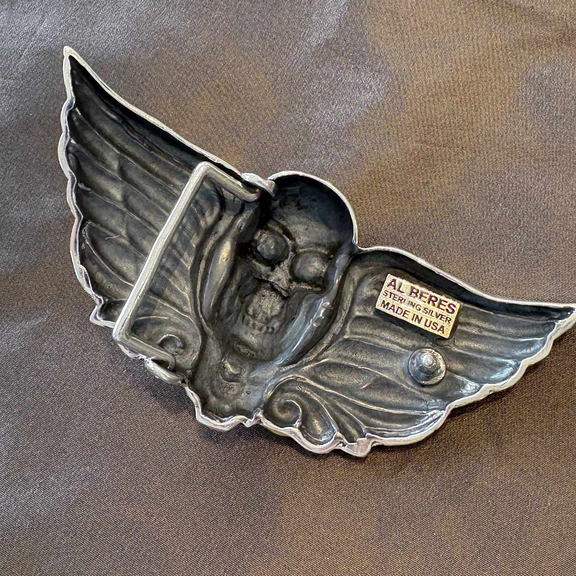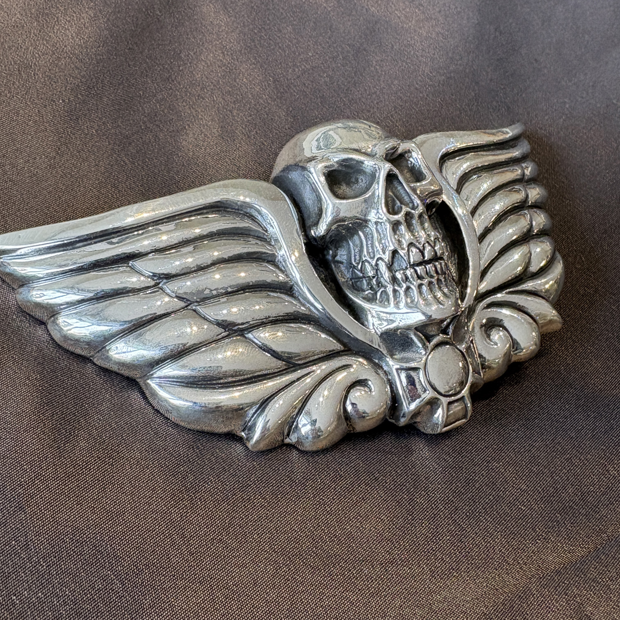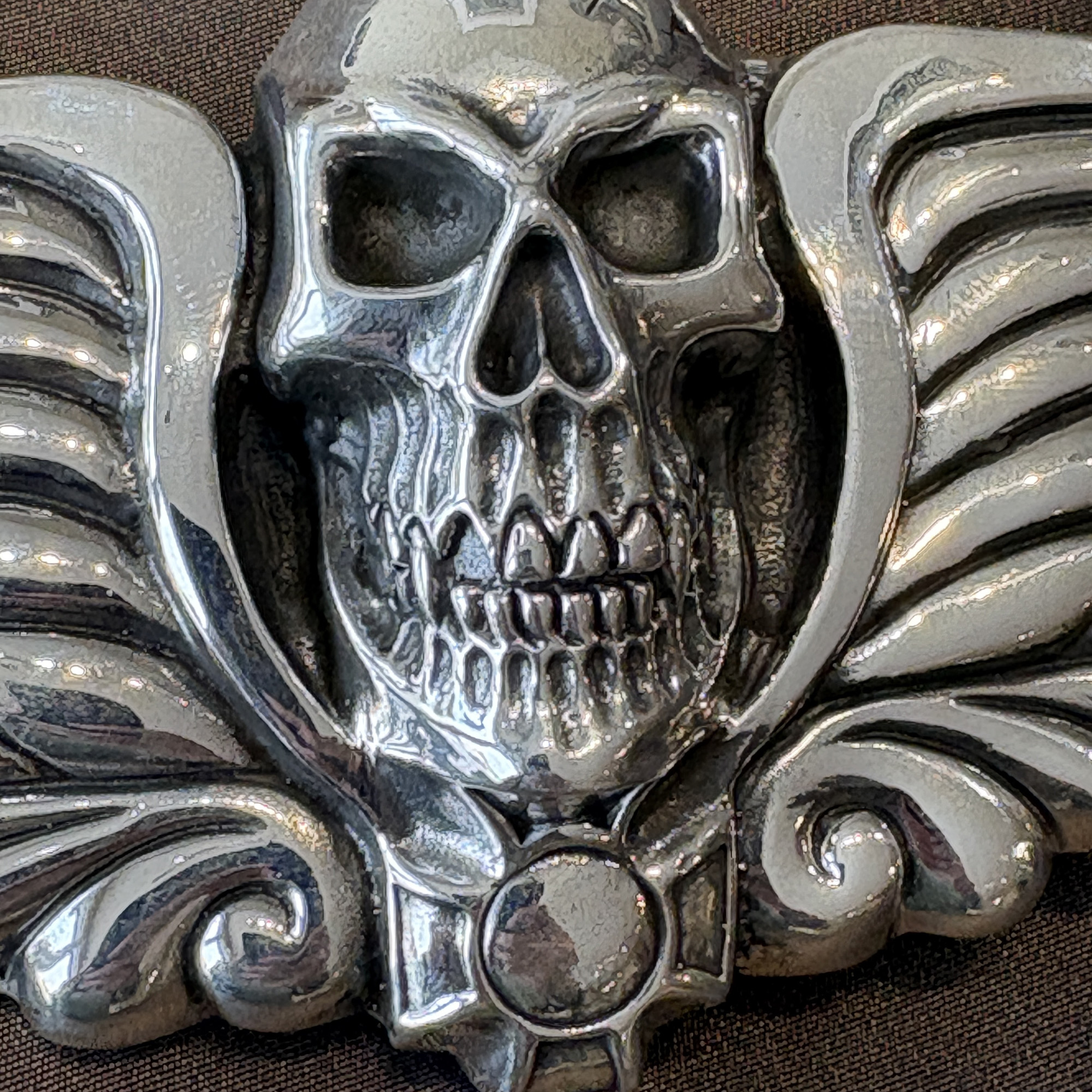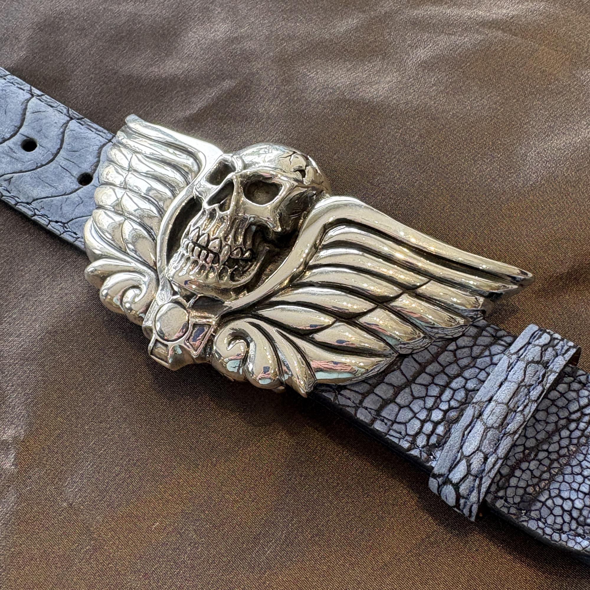 Here is the incredible large skull buckle with wings and iron cross. It’s a very heavy duty buckle. Definitely for the unconventional man or woman. This buckle makes a statement, that you’ll not take nuthin’ from nobody. It fits an 1-1/2″ width belt, and is shown here on a sueded blue ostrich leg belt.