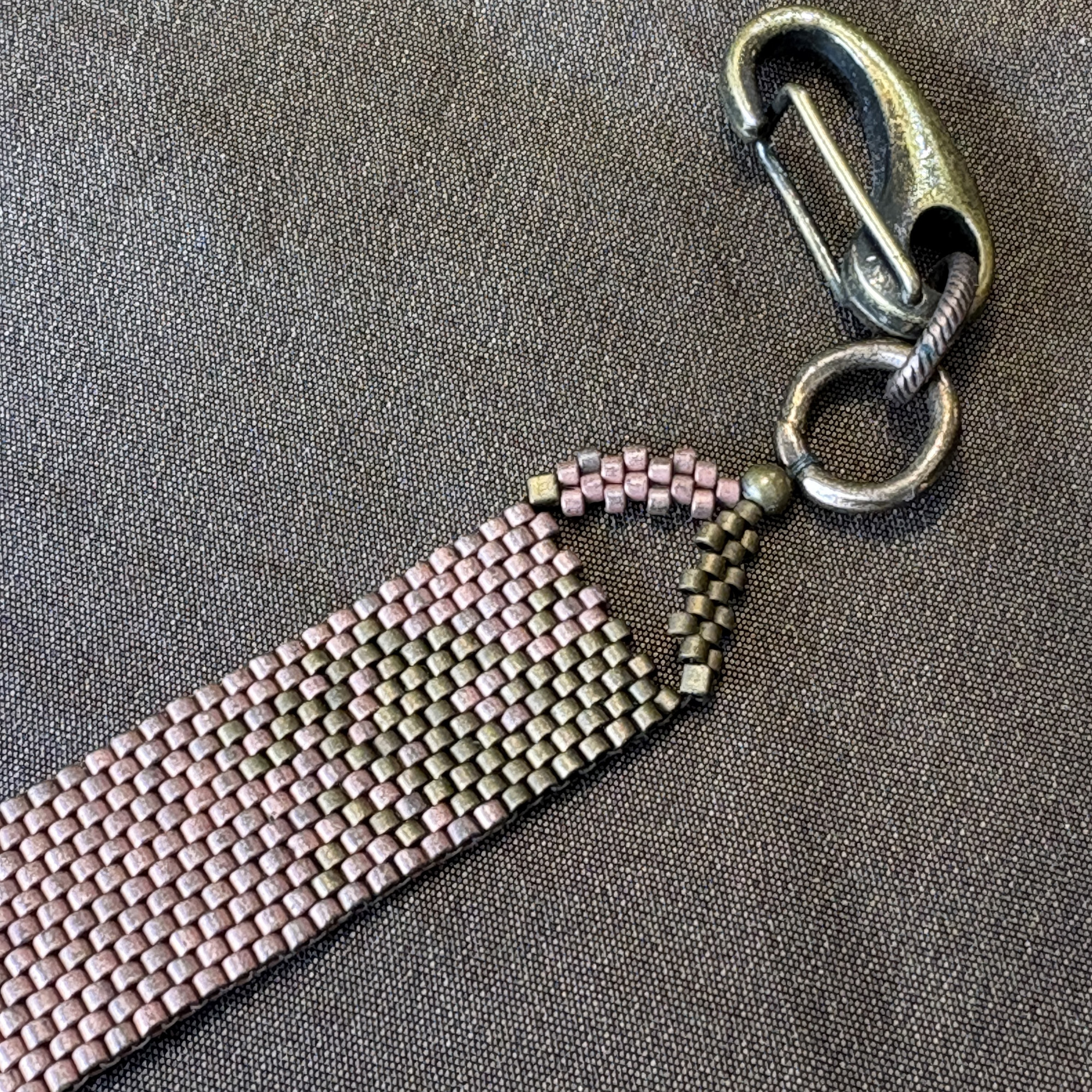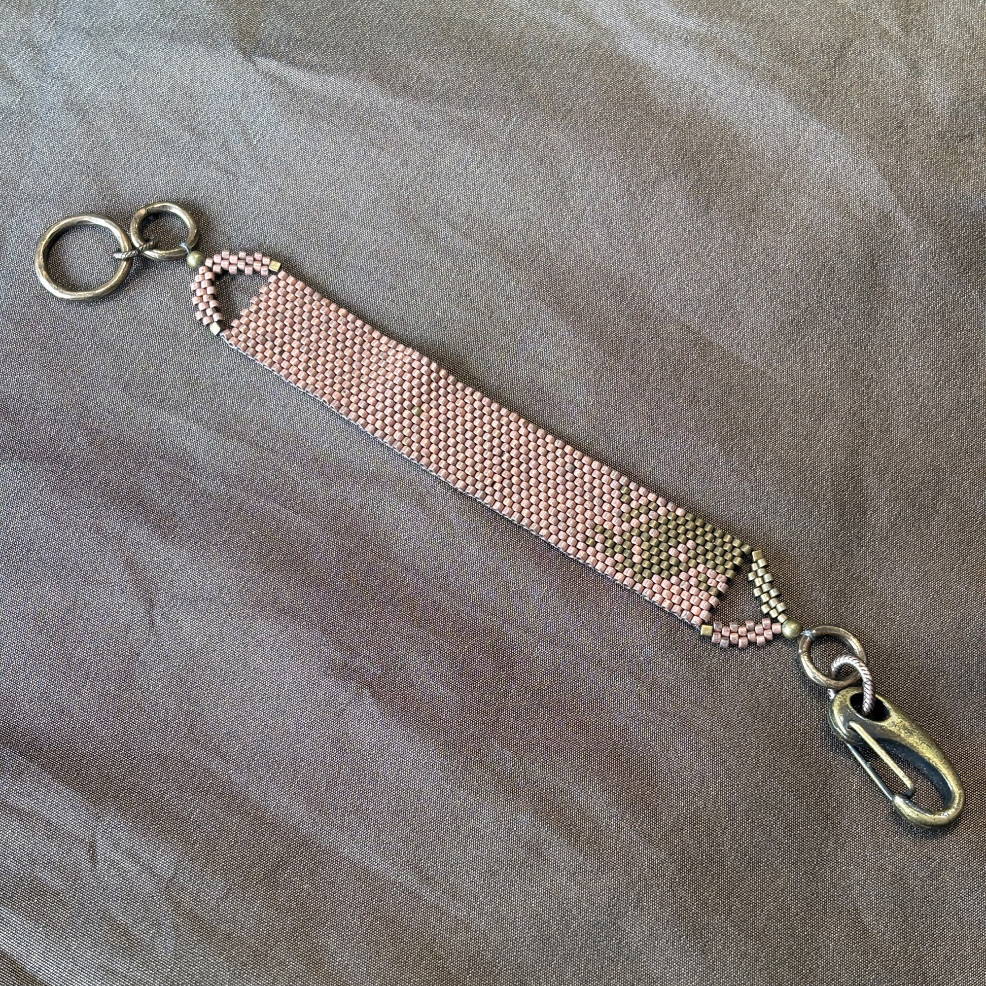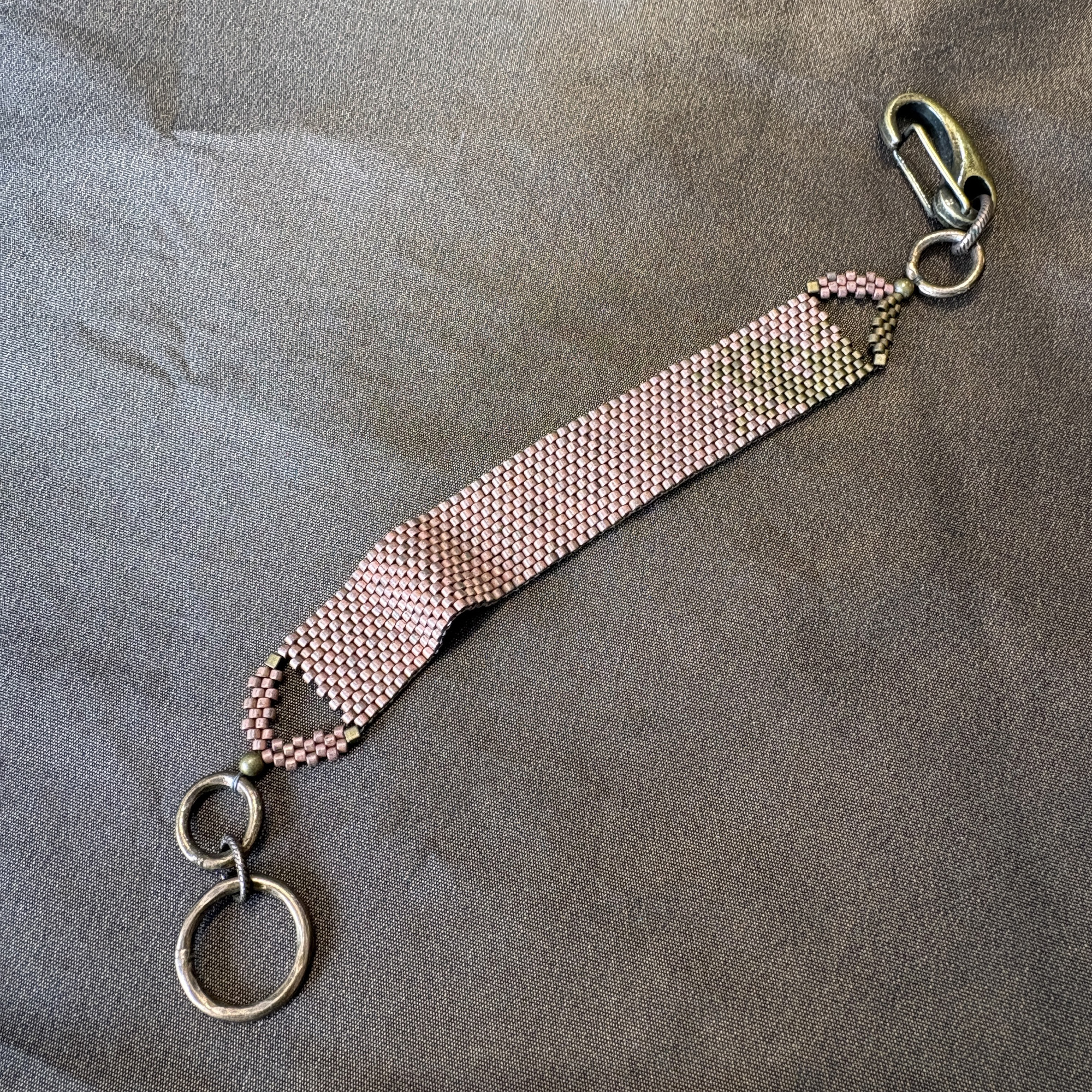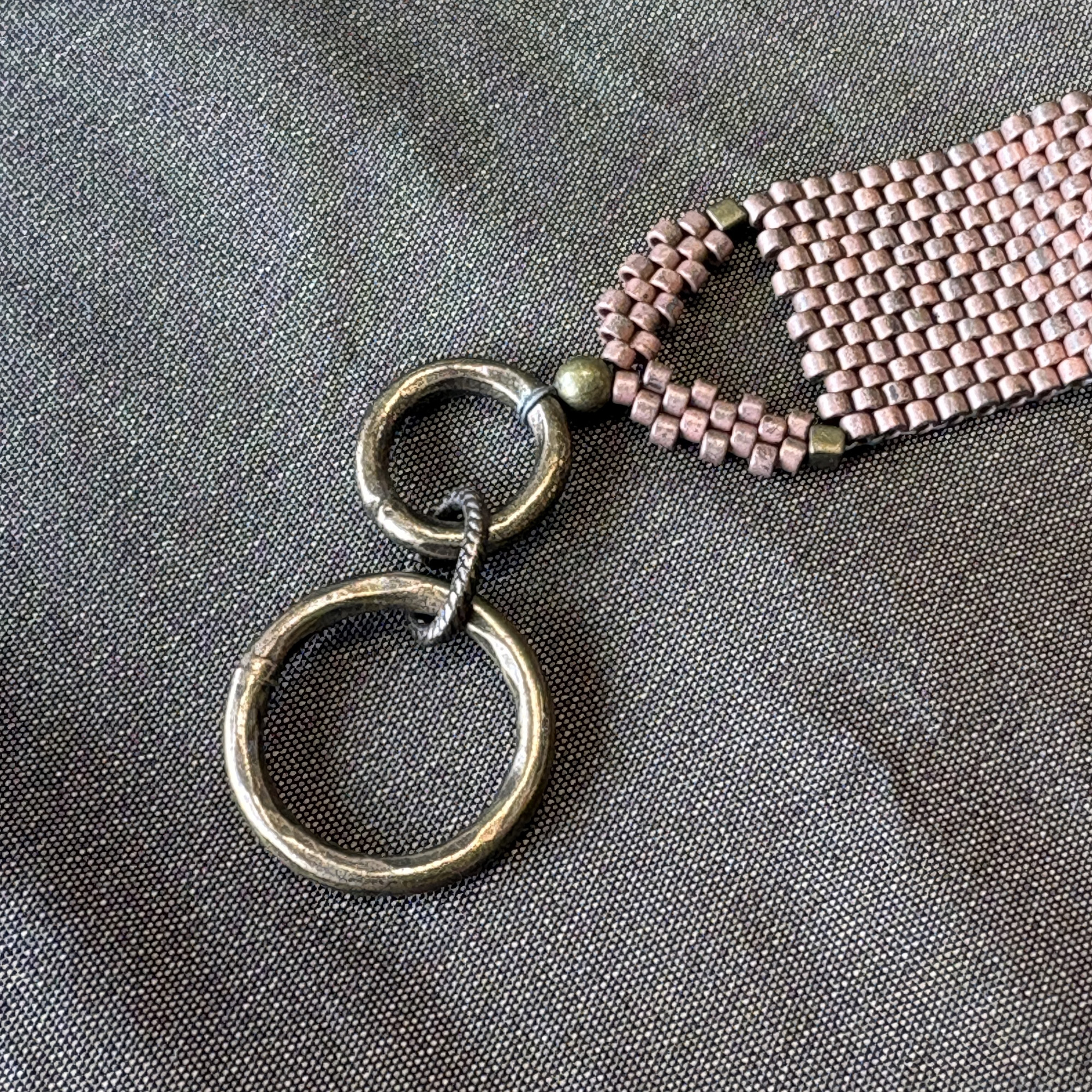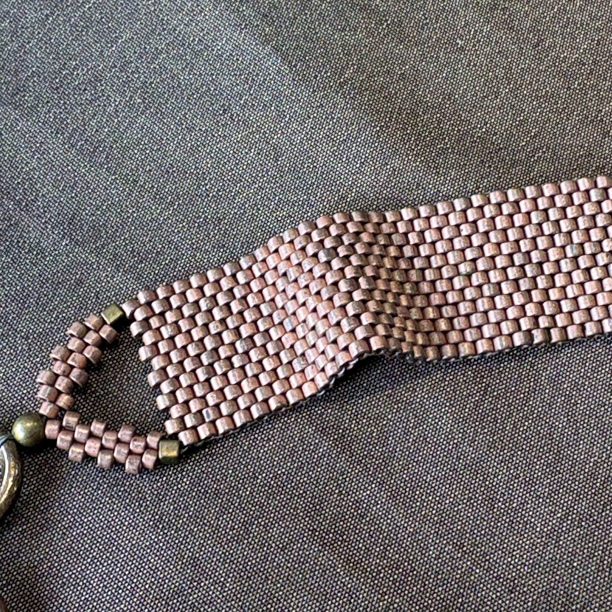 One of a kind glass beaded bracelet in a unique, terra cotta, pink-ish tone, combined with bronze beads. Beautifully crafted and comfortable design, made just for Saddlebags.