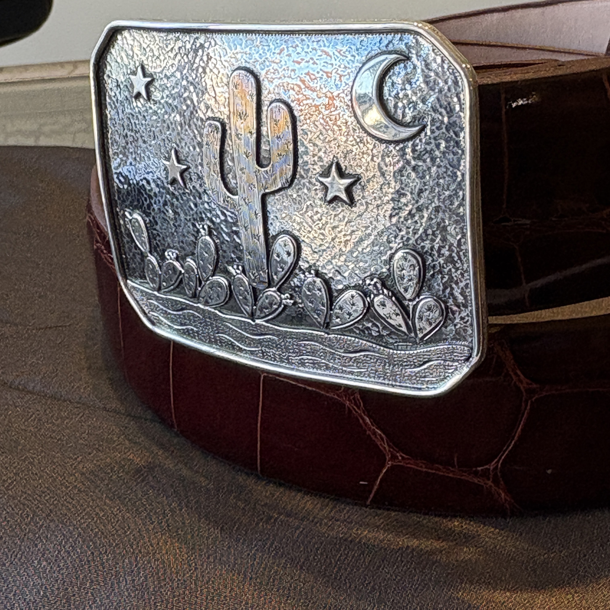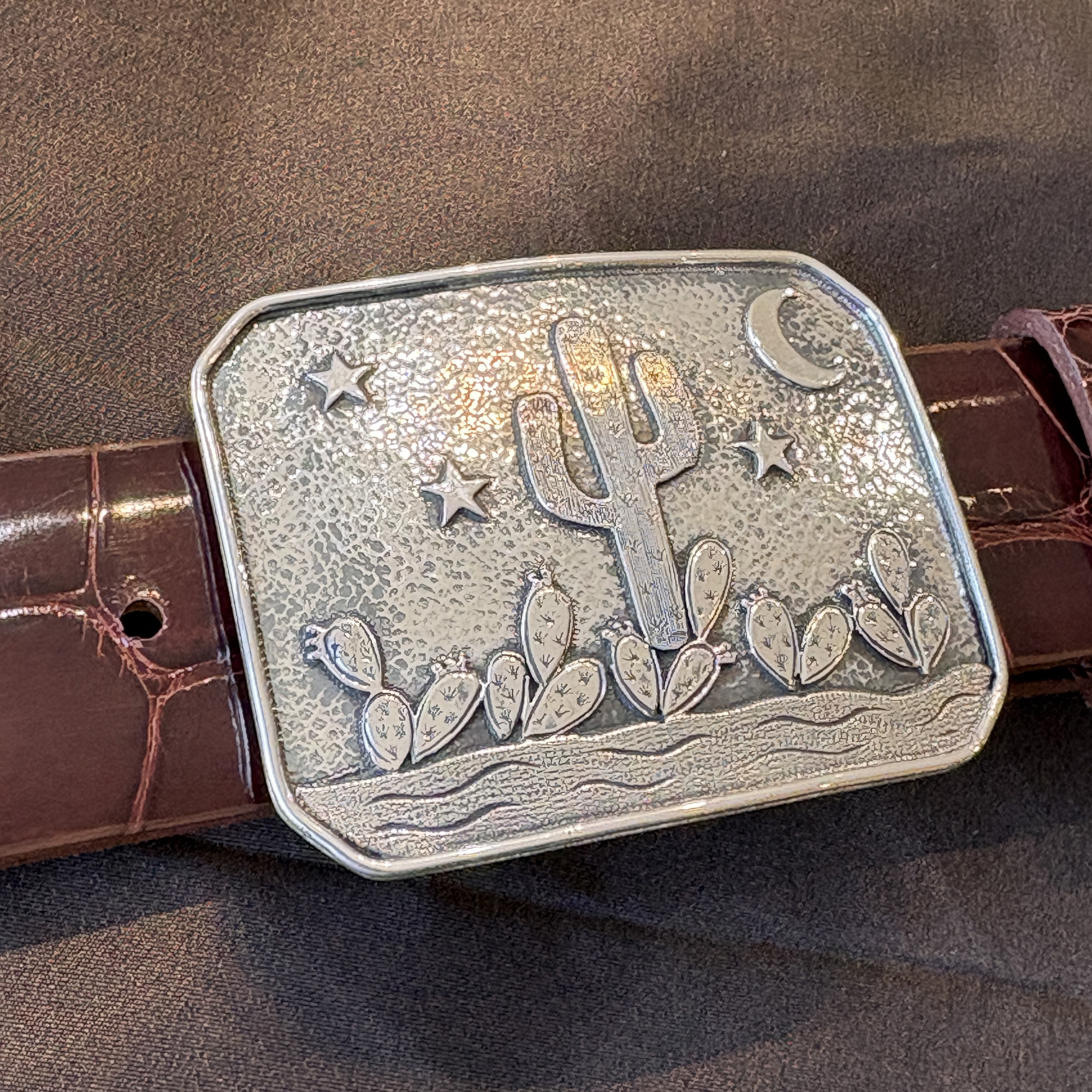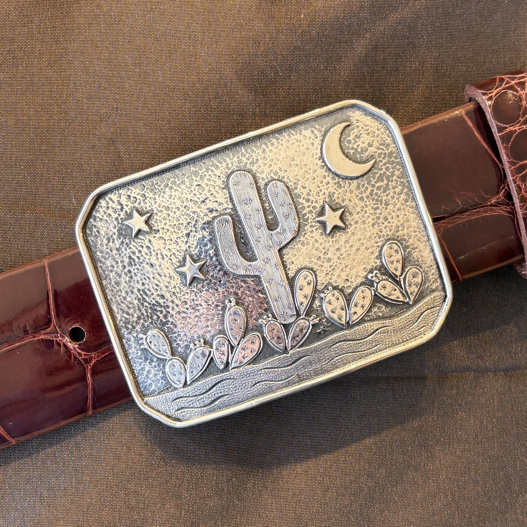 The Desert Dawn buckle features cactus, stars, moon, and mountains. It takes a 1-1/2″ width belt and is pictured here on a shiny dark cognac alligator strap. This is the first one we’ve done in all sterling silver.