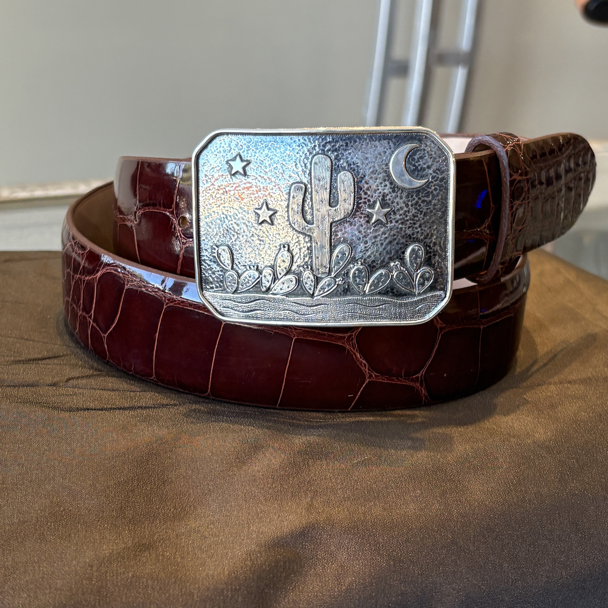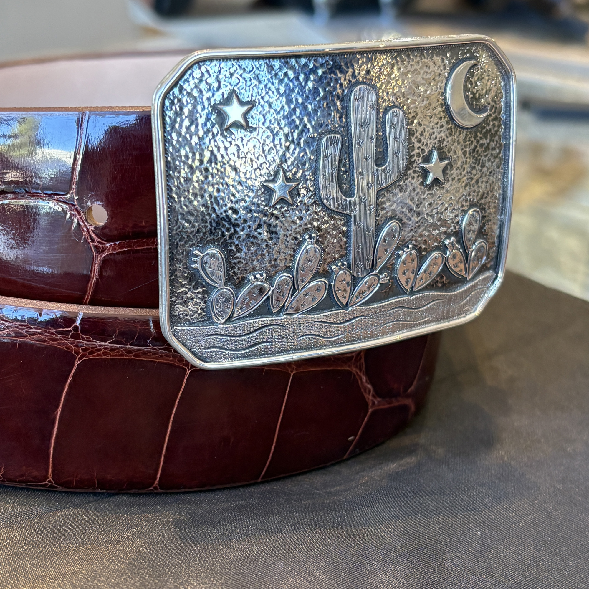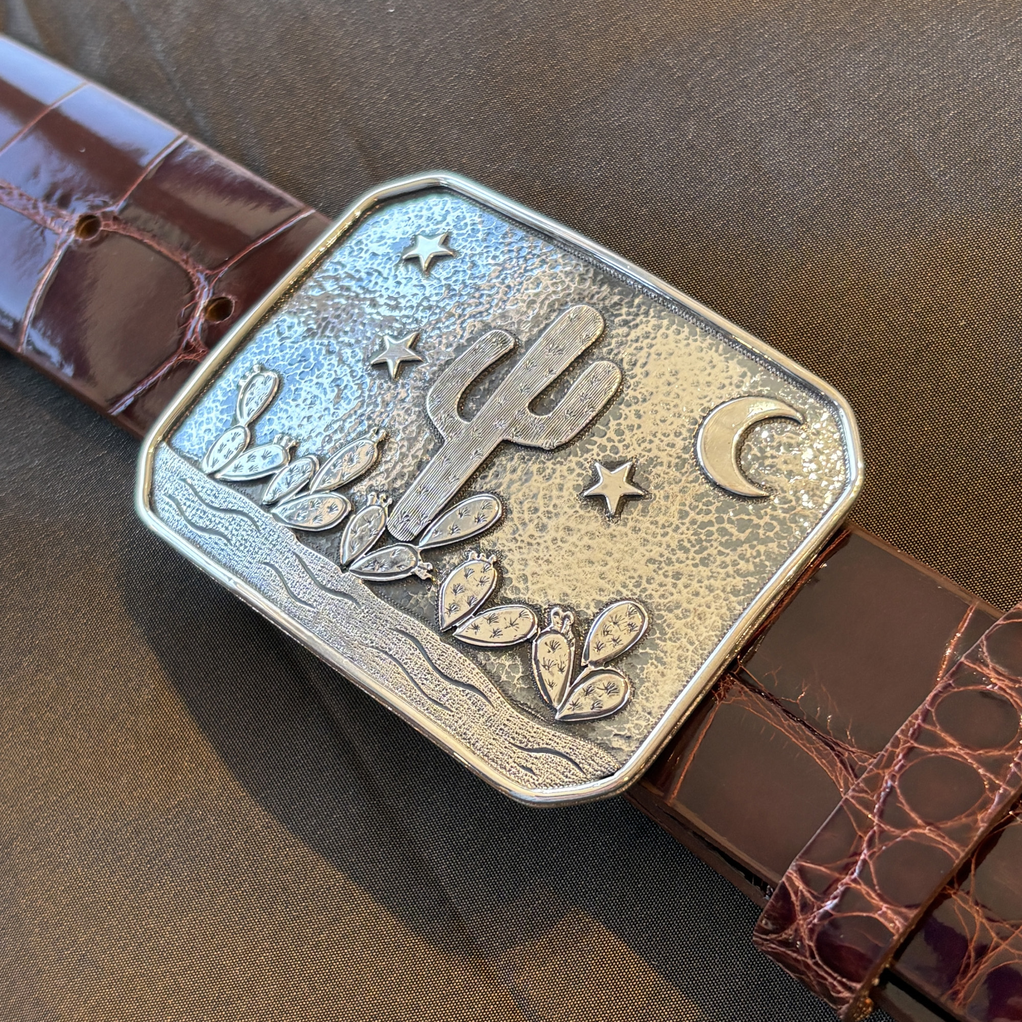 The Desert Dawn buckle features cactus, stars, moon, and mountains. It takes a 1-1/2″ width belt and is pictured here on a shiny dark cognac alligator strap. This is the first one we’ve done in all sterling silver.