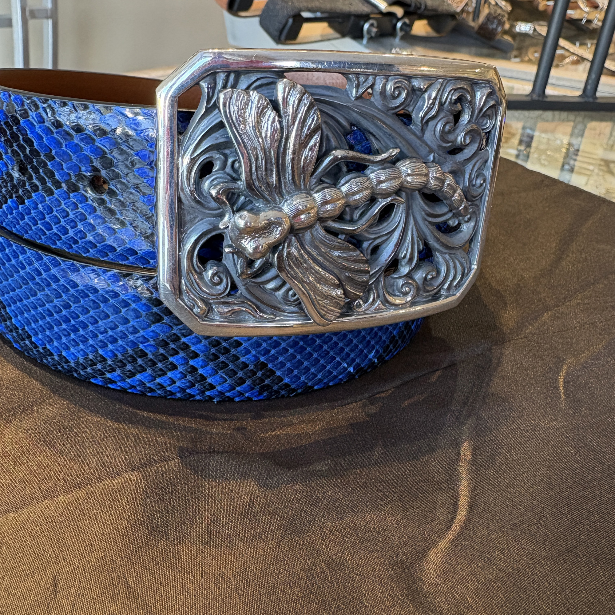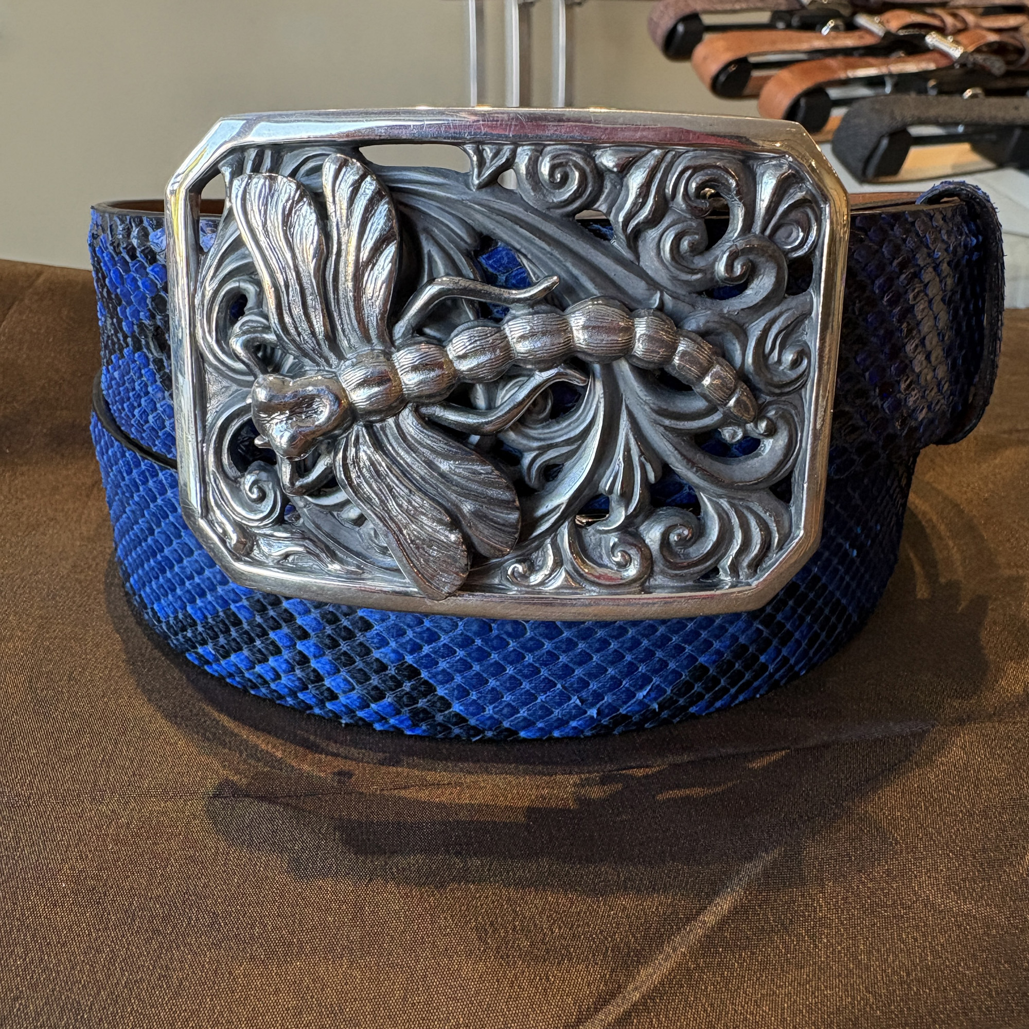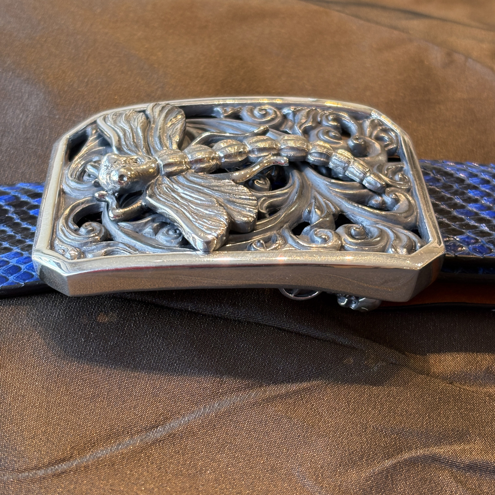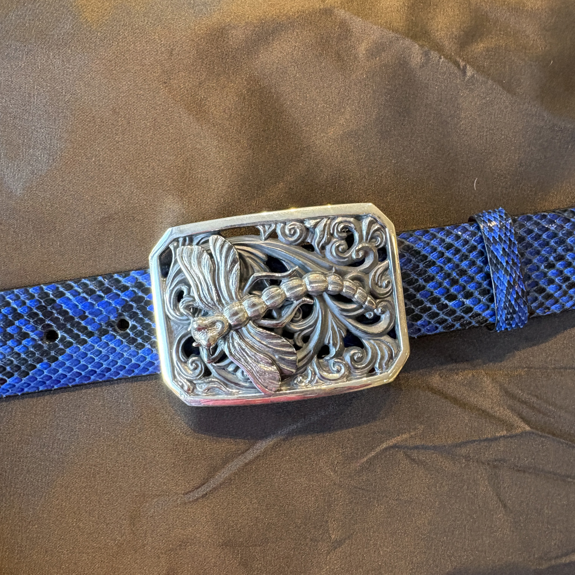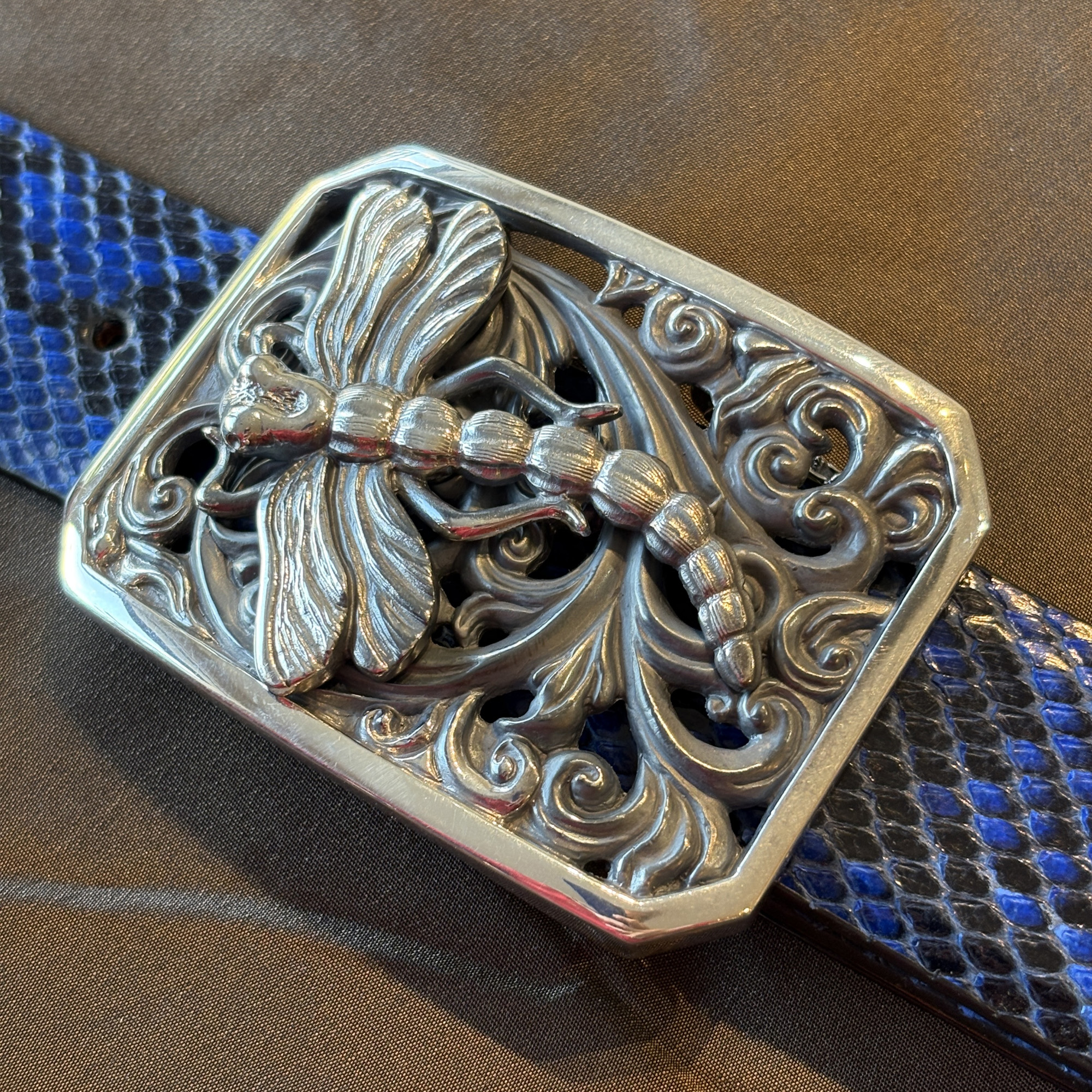 The new Dragon Fly buckle is a beauty!! The winged creature has really nice detail work, and lovely filigree scroll work as the background. It is framed in a notched corner rectangle and fits an 1-1/2″ width belt strap. It is shown here on a black and blue python leather belt.