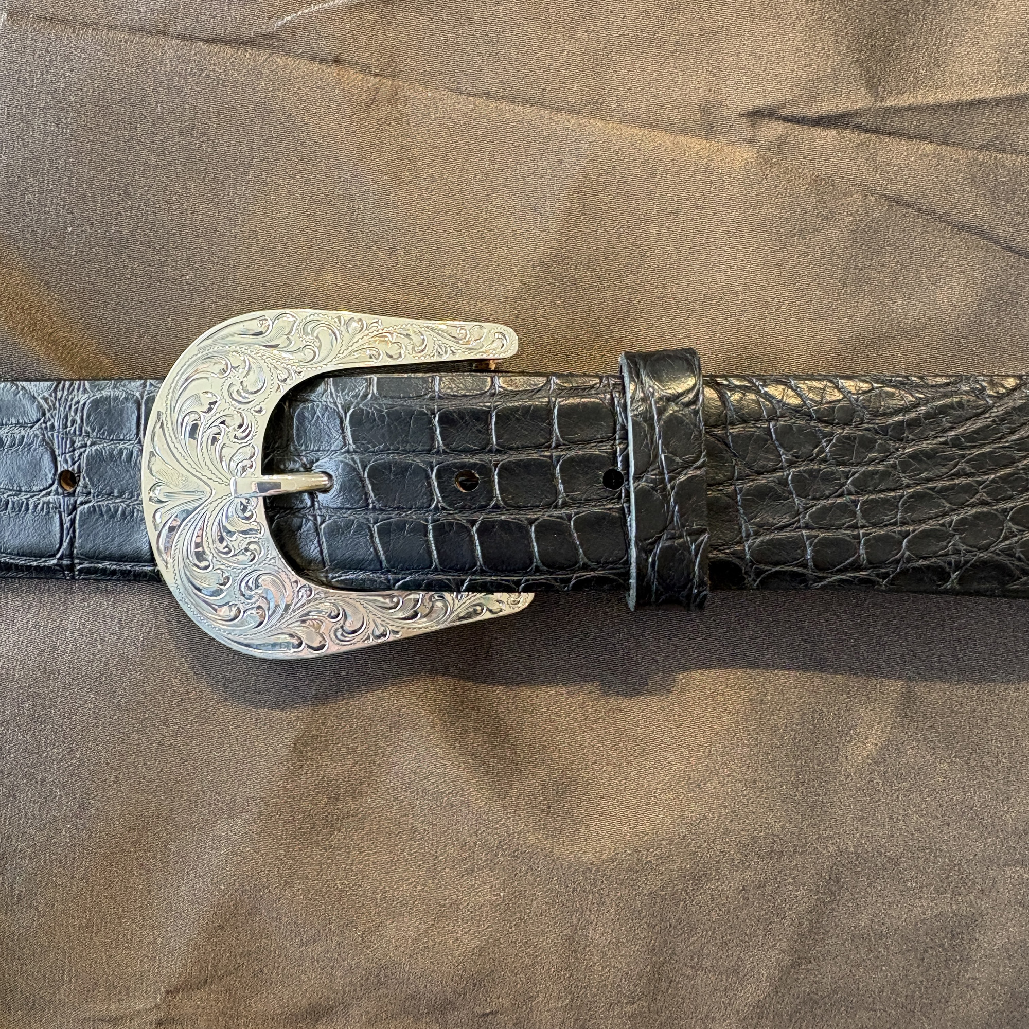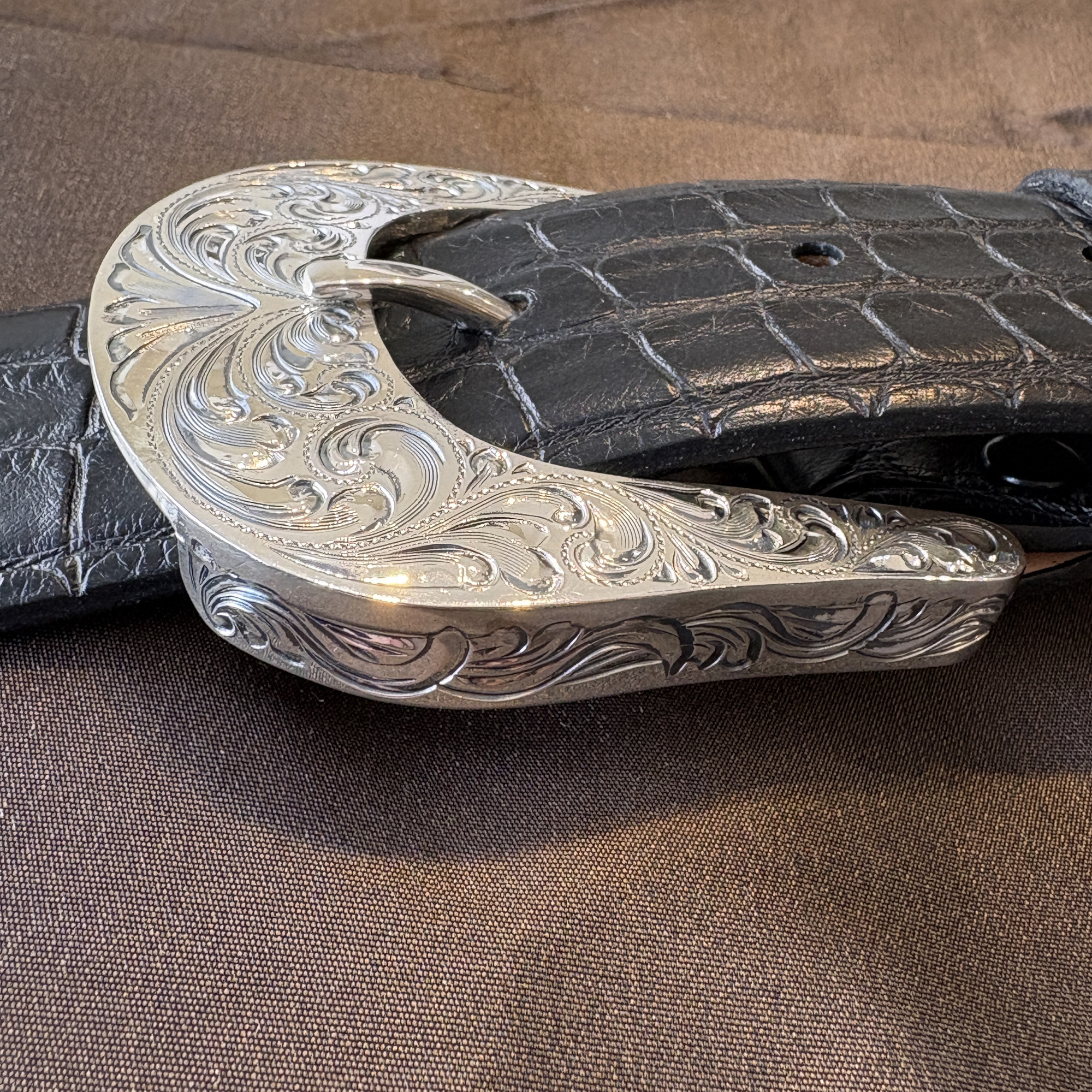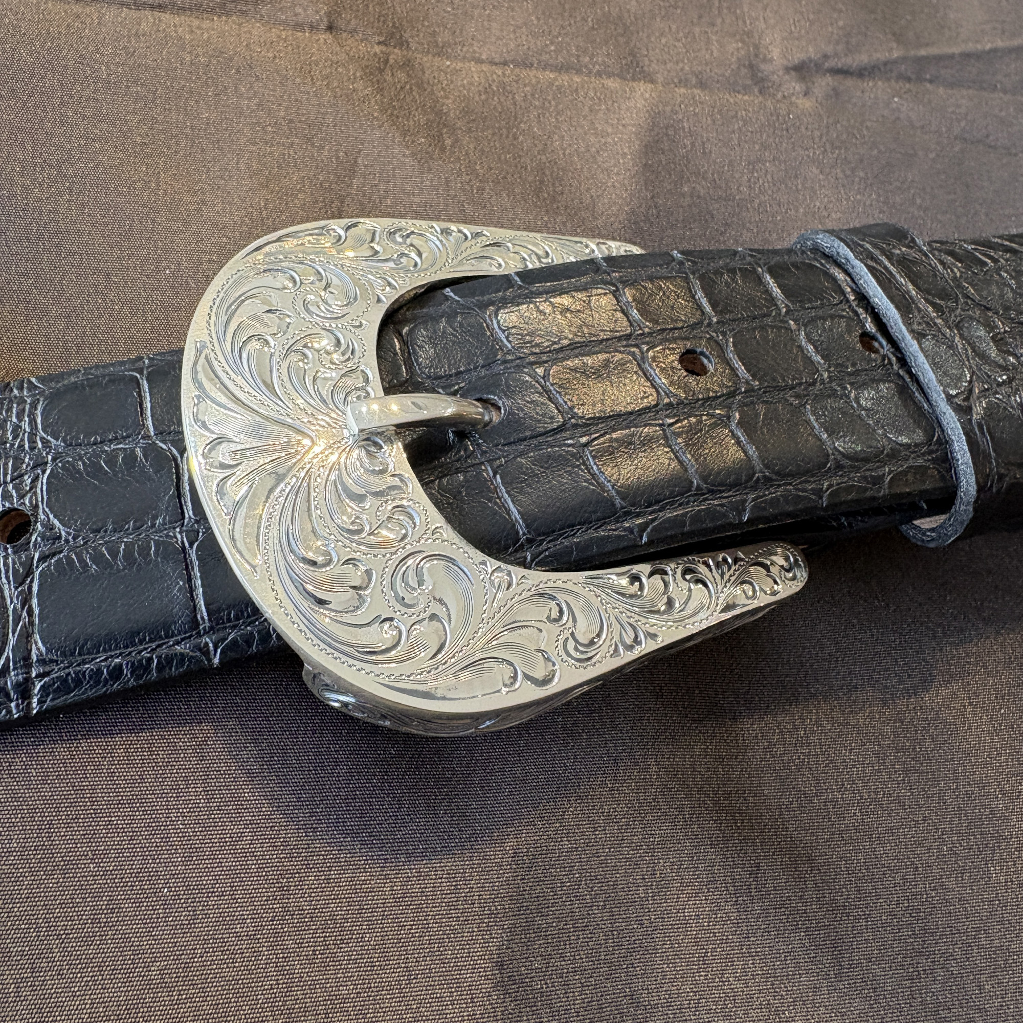 A new look to an old style. The Plumas is crafted in solid sterling silver and features engraved side plates that create a channel for your 1½” belt. An antique finish adds depth, while the domed profile provides a bold presence.