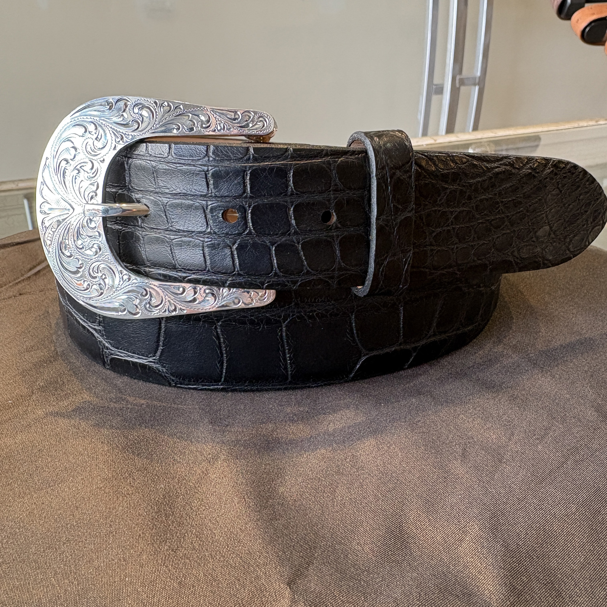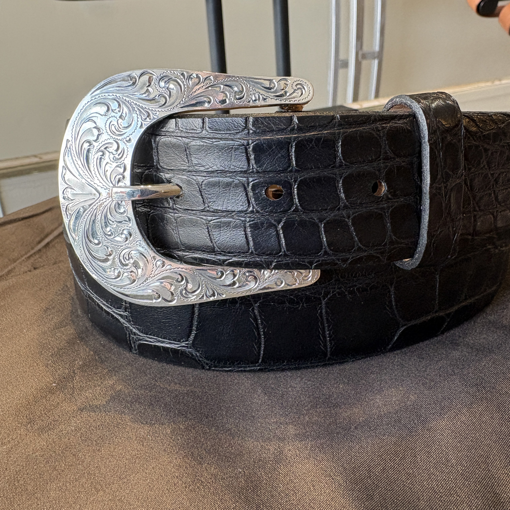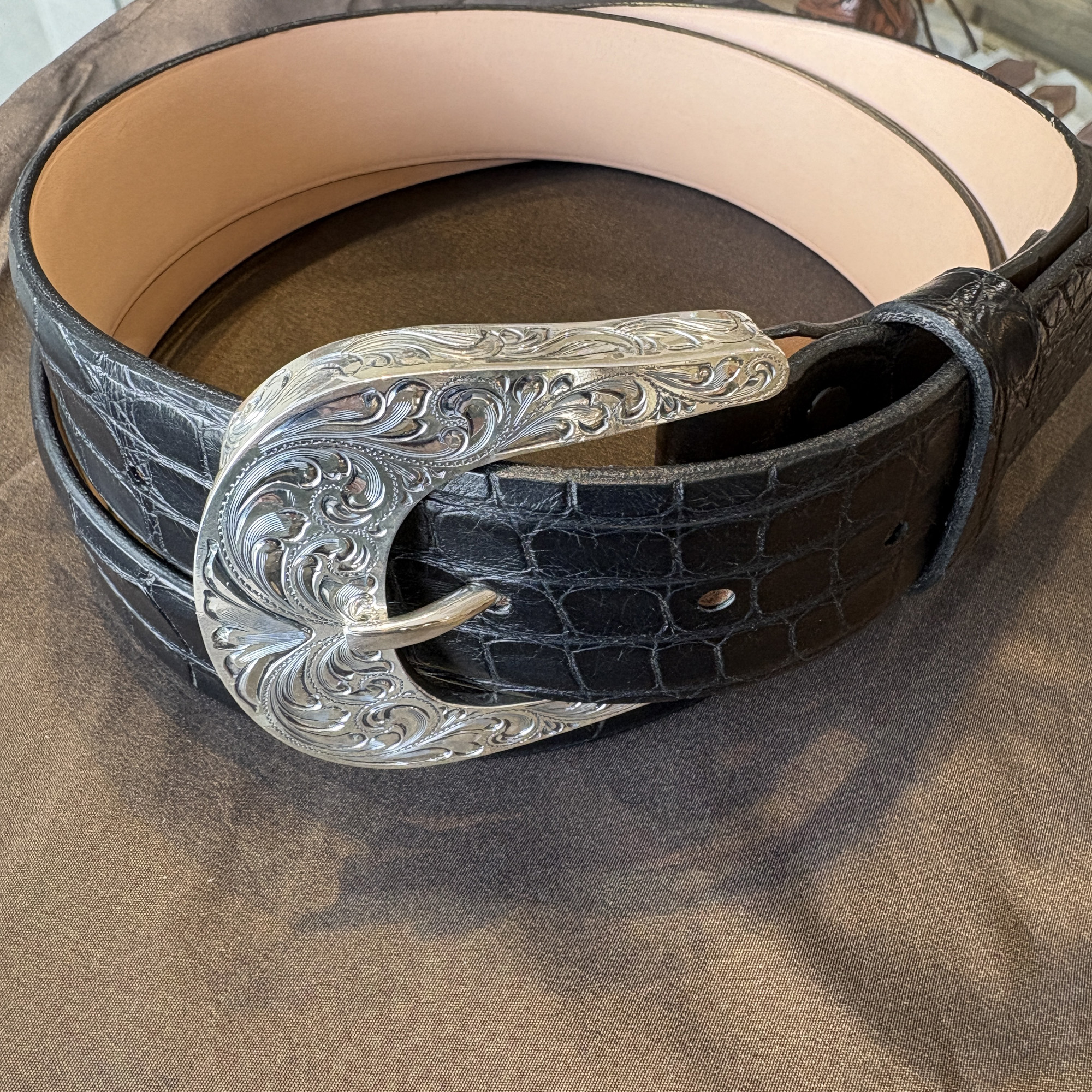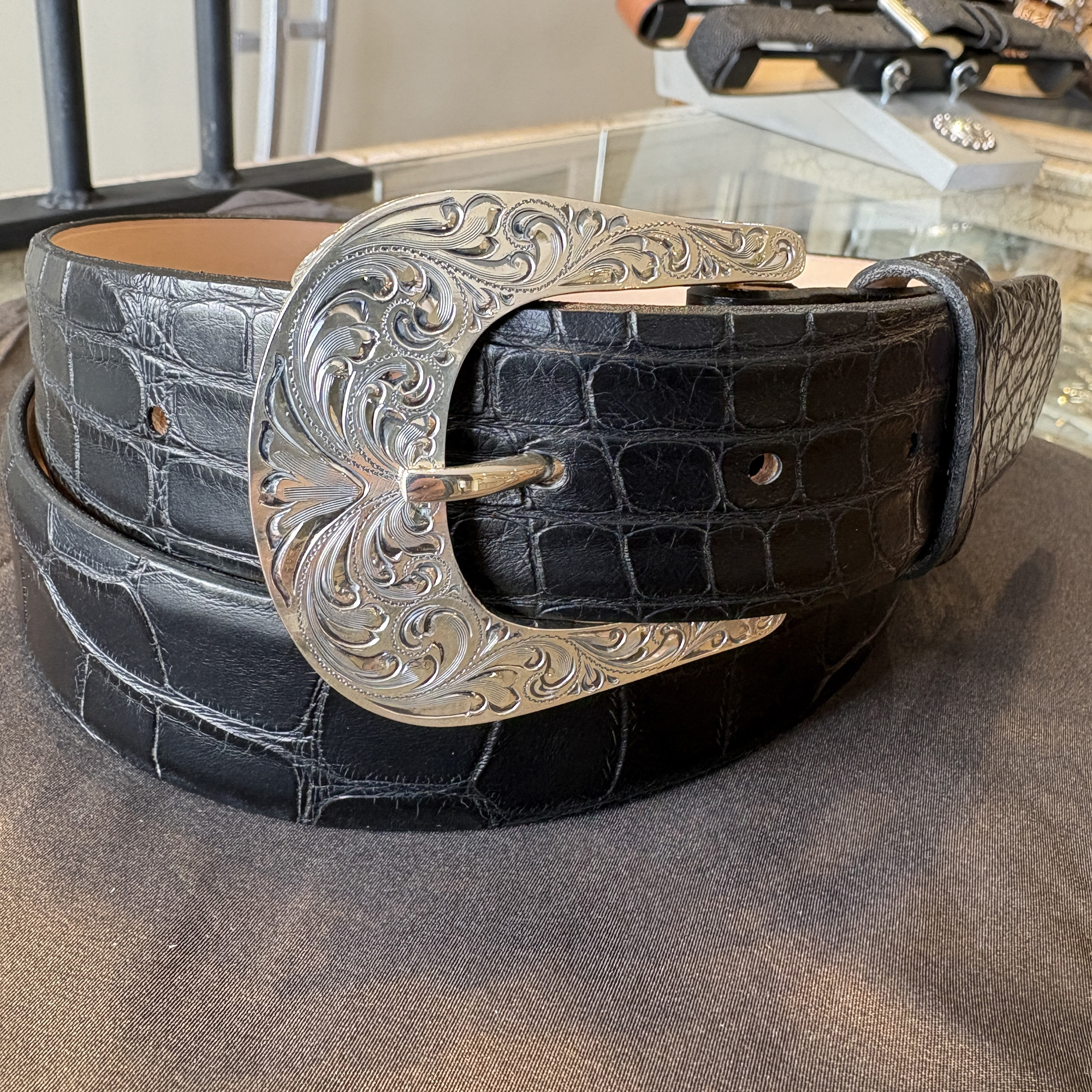 A new look to an old style. The Plumas is crafted in solid sterling silver and features engraved side plates that create a channel for your 1½” belt. An antique finish adds depth, while the domed profile provides a bold presence.