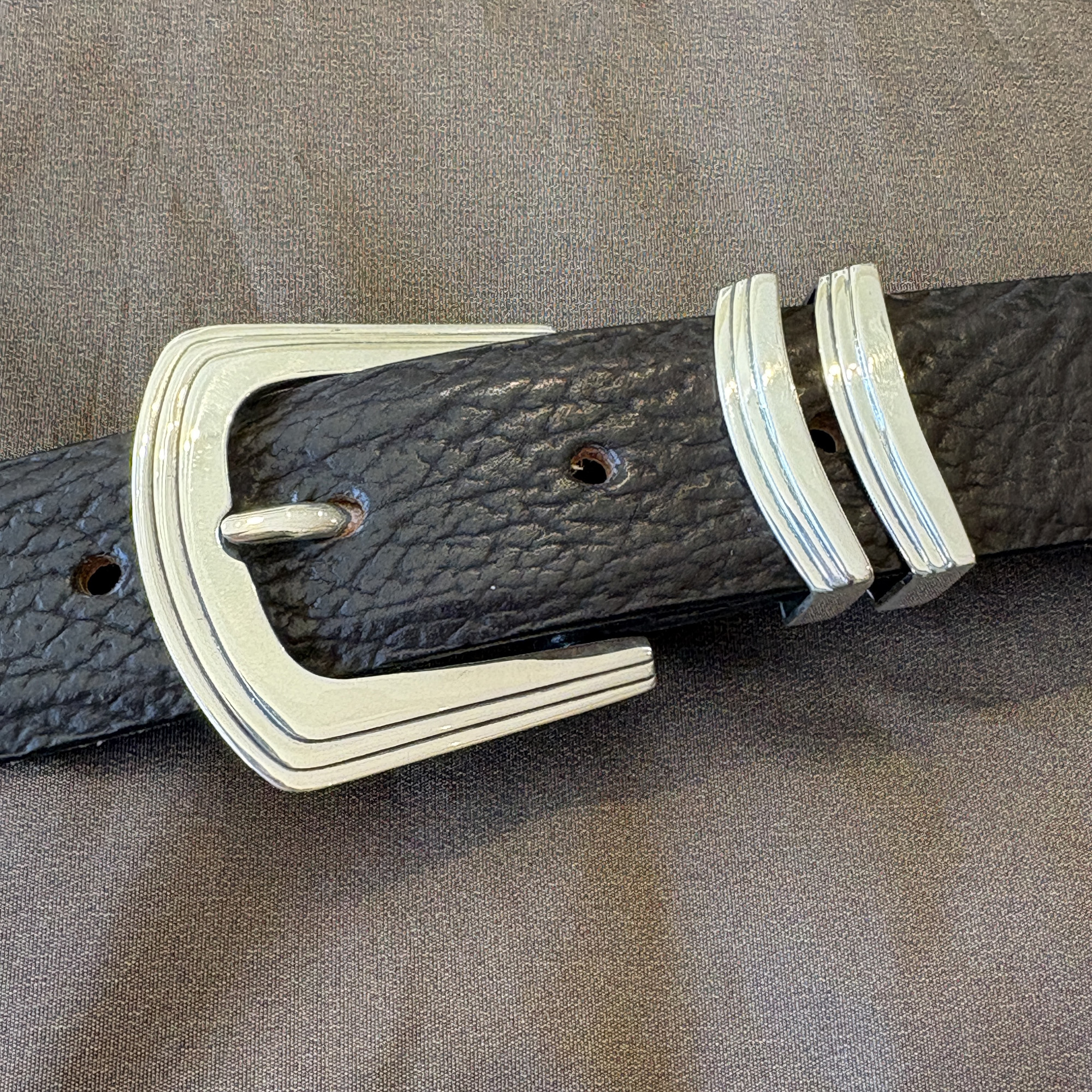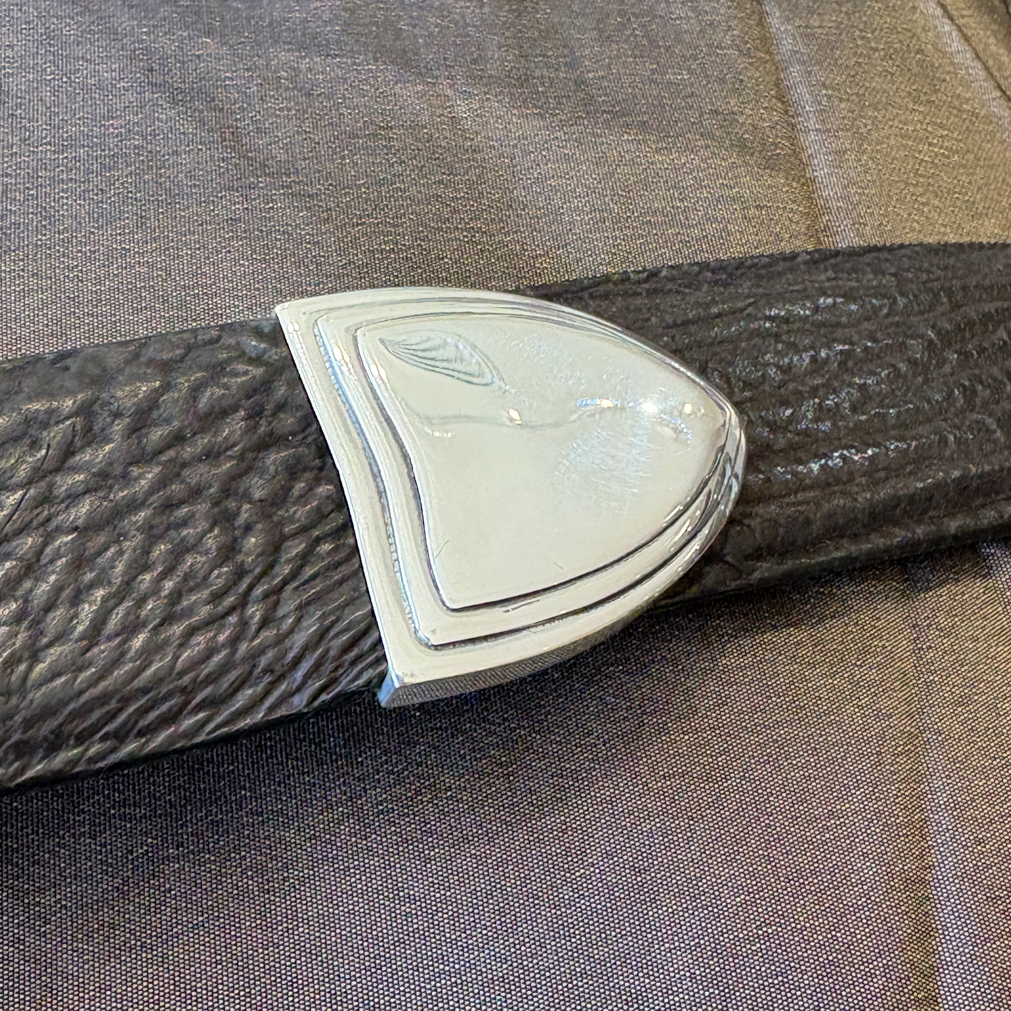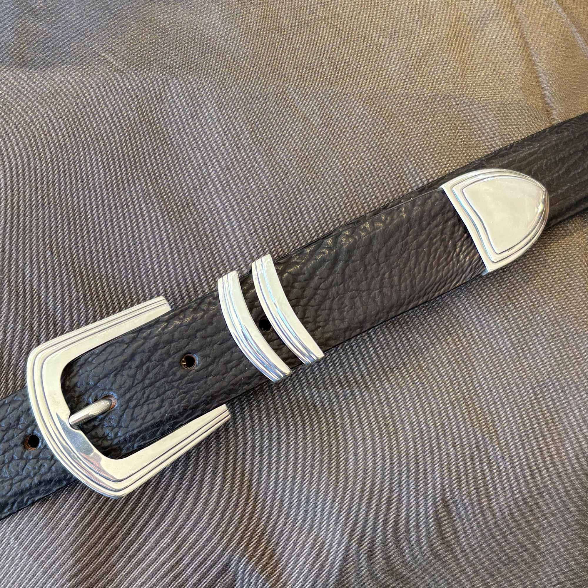 This is a pre-owned James Reid buckle set called the Utah. It is a three piece set, that fits the 1-1/4″ width belt. It can be considered a dress buckle, but is also versatile enough to put with jeans and worn casually. It has been professionally polished up and looks like new. It is pictured here on a black shark belt strap.