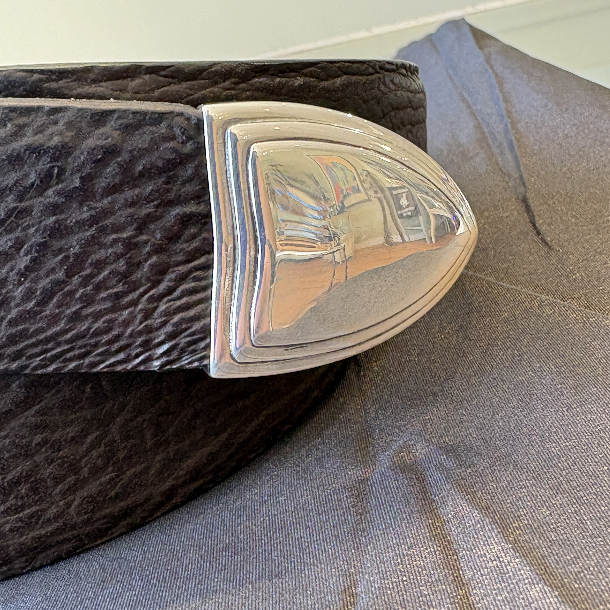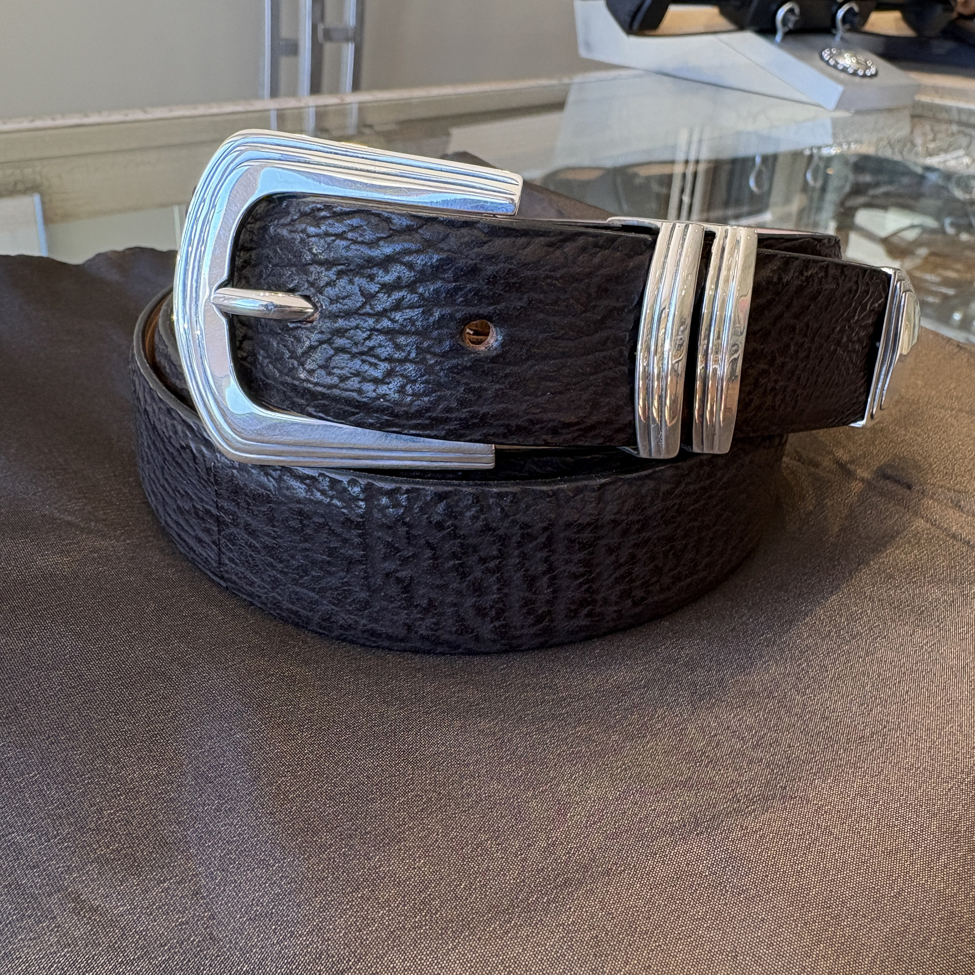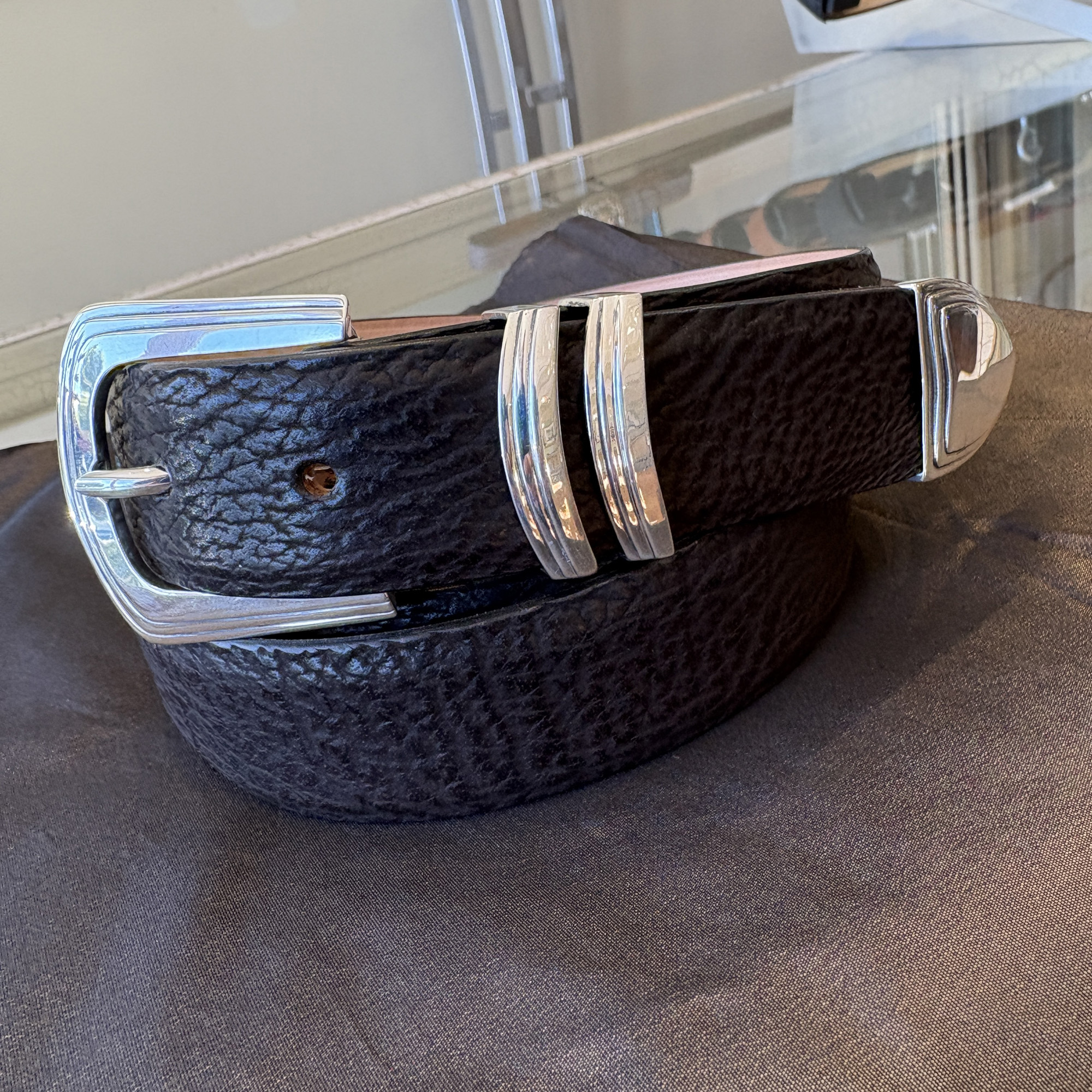 This is a pre-owned James Reid buckle set called the Utah. It is a three piece set, that fits the 1-1/4″ width belt. It can be considered a dress buckle, but is also versatile enough to put with jeans and worn casually. It has been professionally polished up and looks like new. It is pictured here on a black shark belt strap.