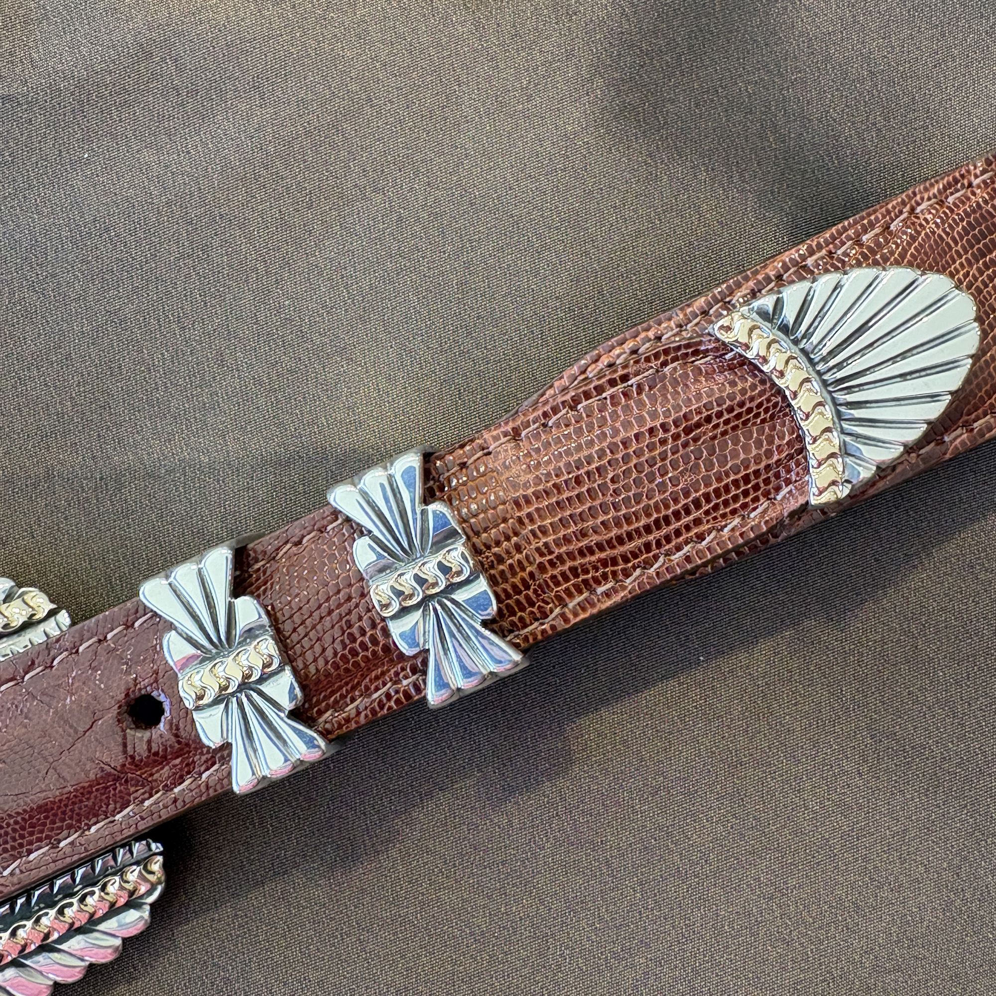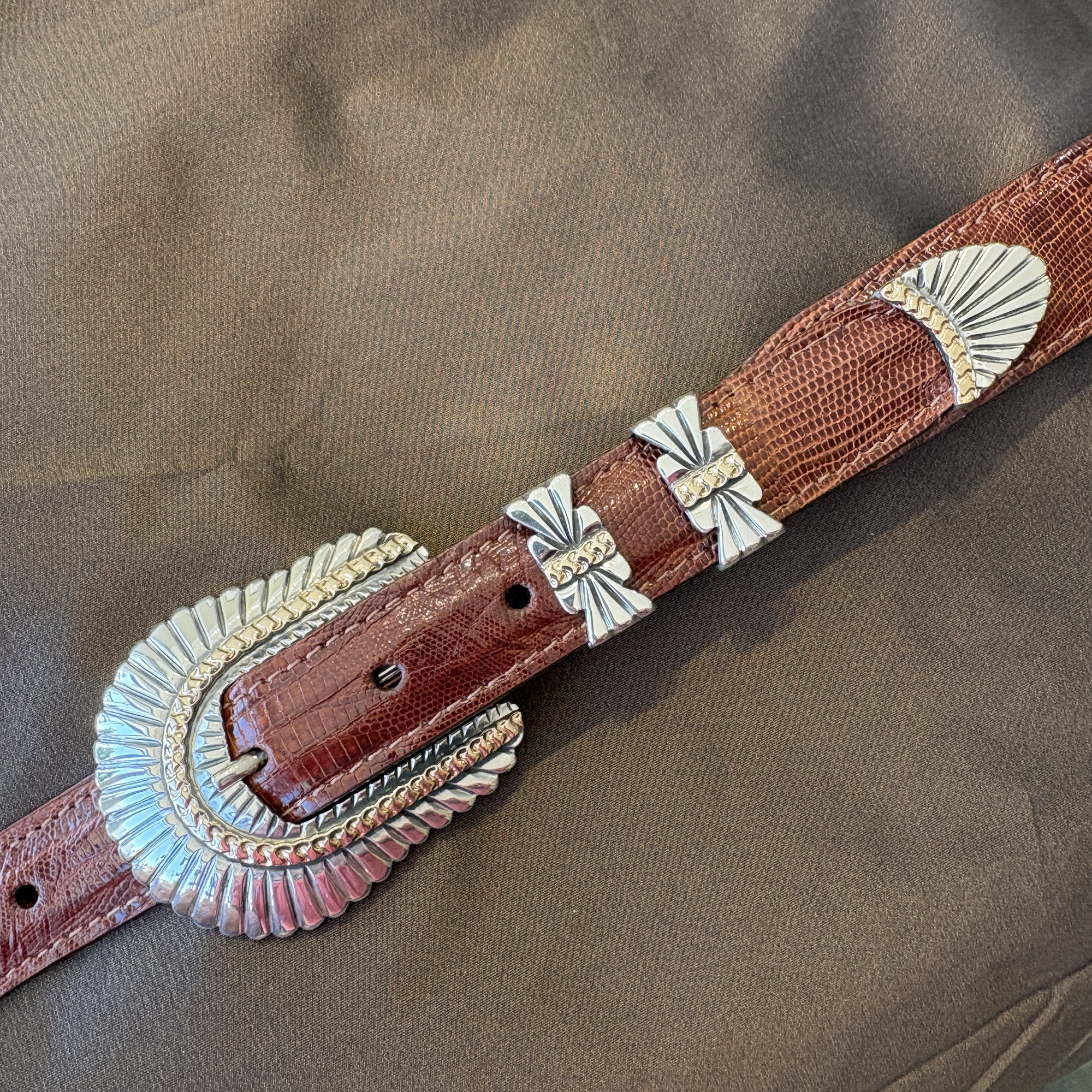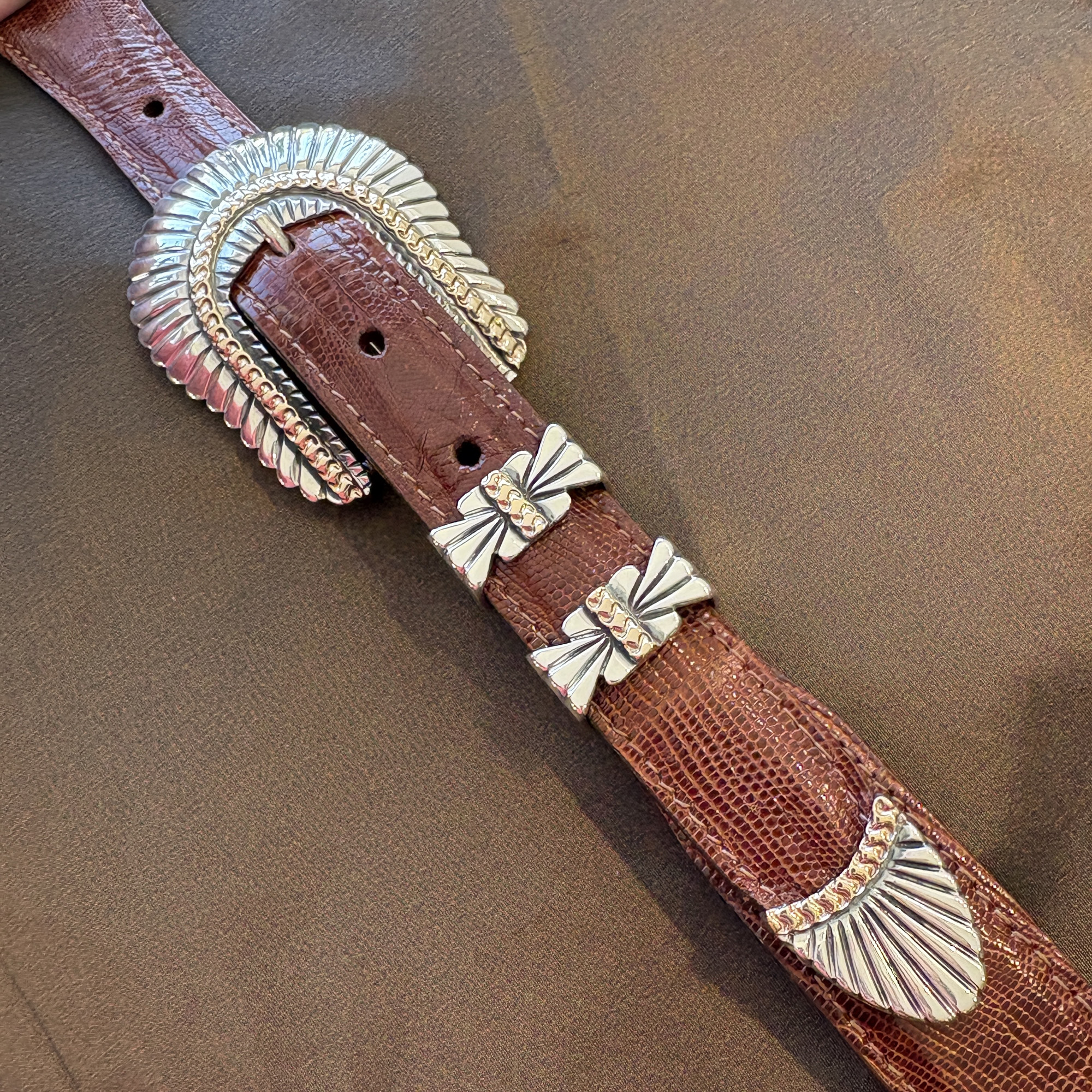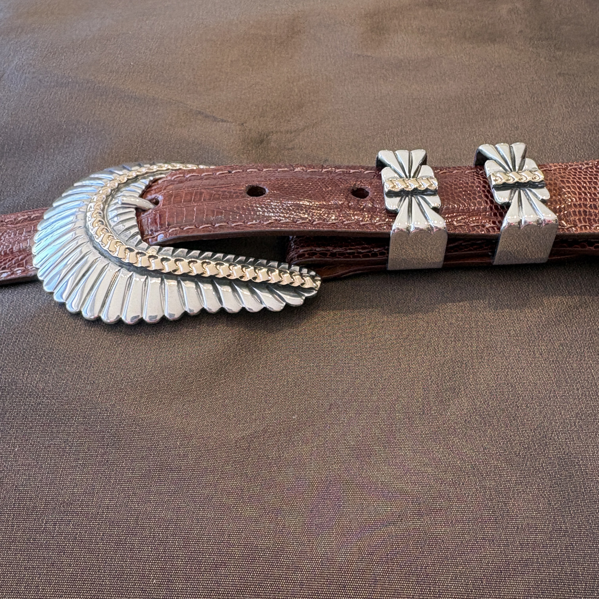 Here is a pre-owned vintage James Reid Ltd. Headdress buckle set. It is pre-owned, however it has been professionally polished up and looks in excellent condition. 14K gold details makes this buckle set an absolute classic. It fits a 1″ strap and is shown here on a cognac lizard belt. There is only one of these so when it is gone, it is gone. A classic piece of Saddlebags history. Good Luck!
