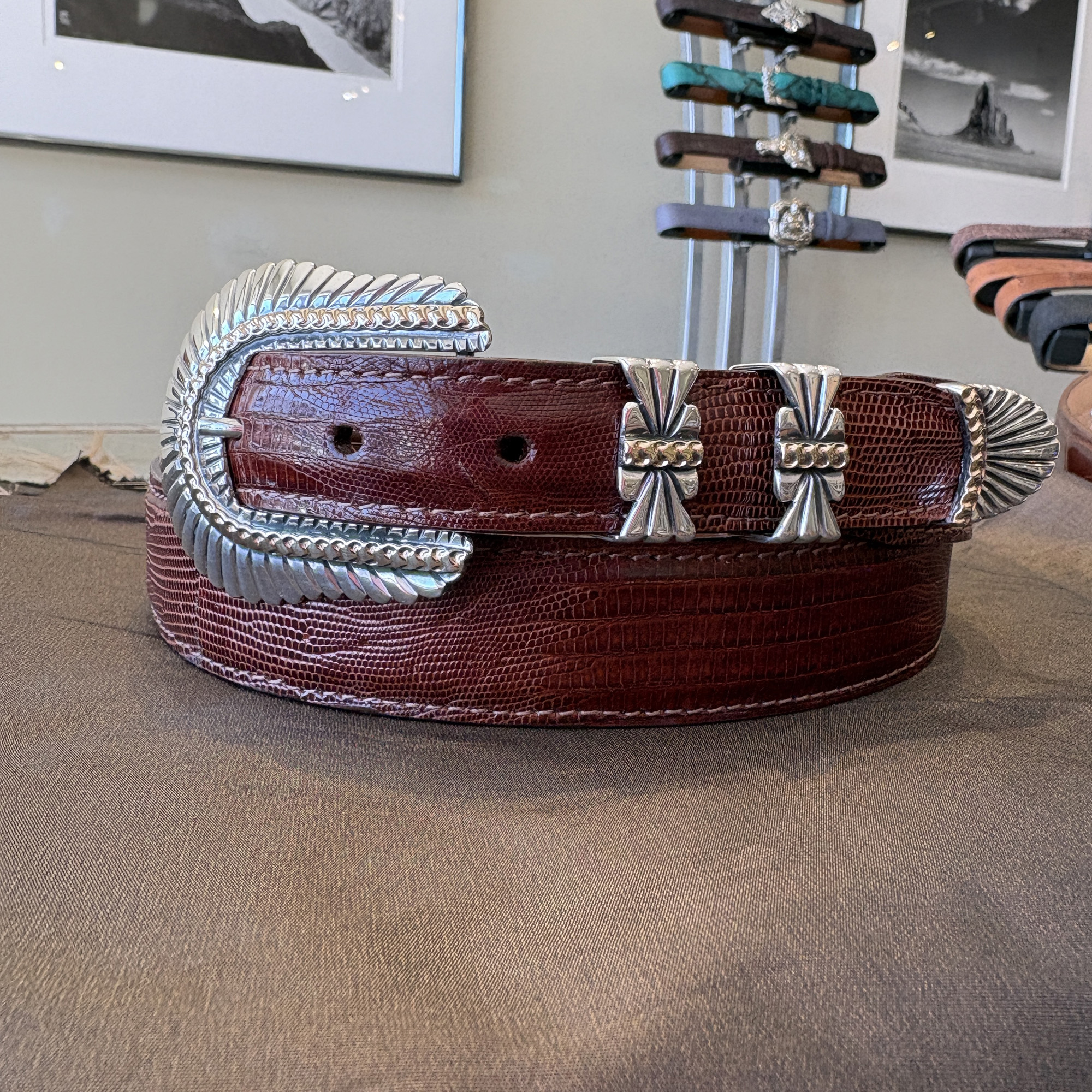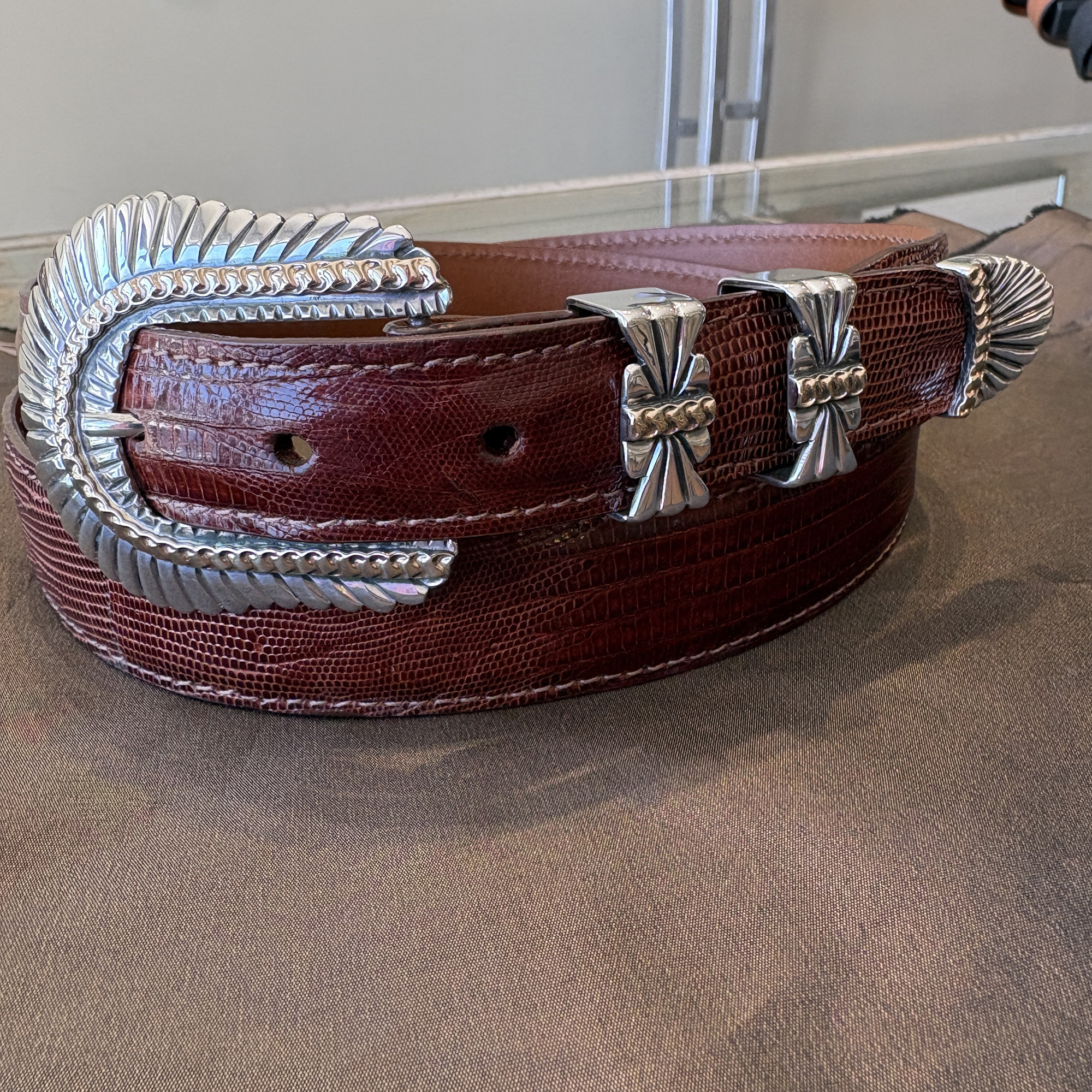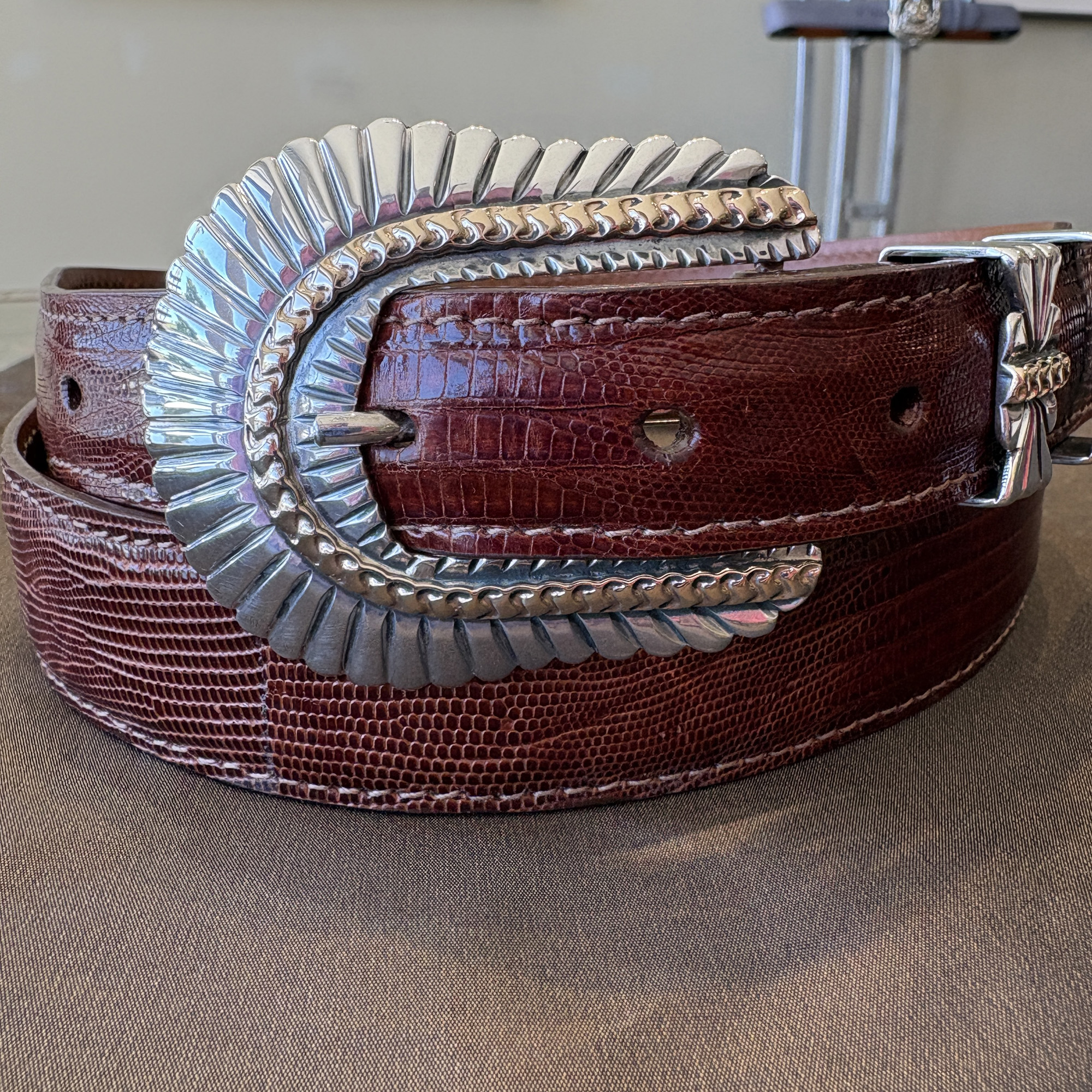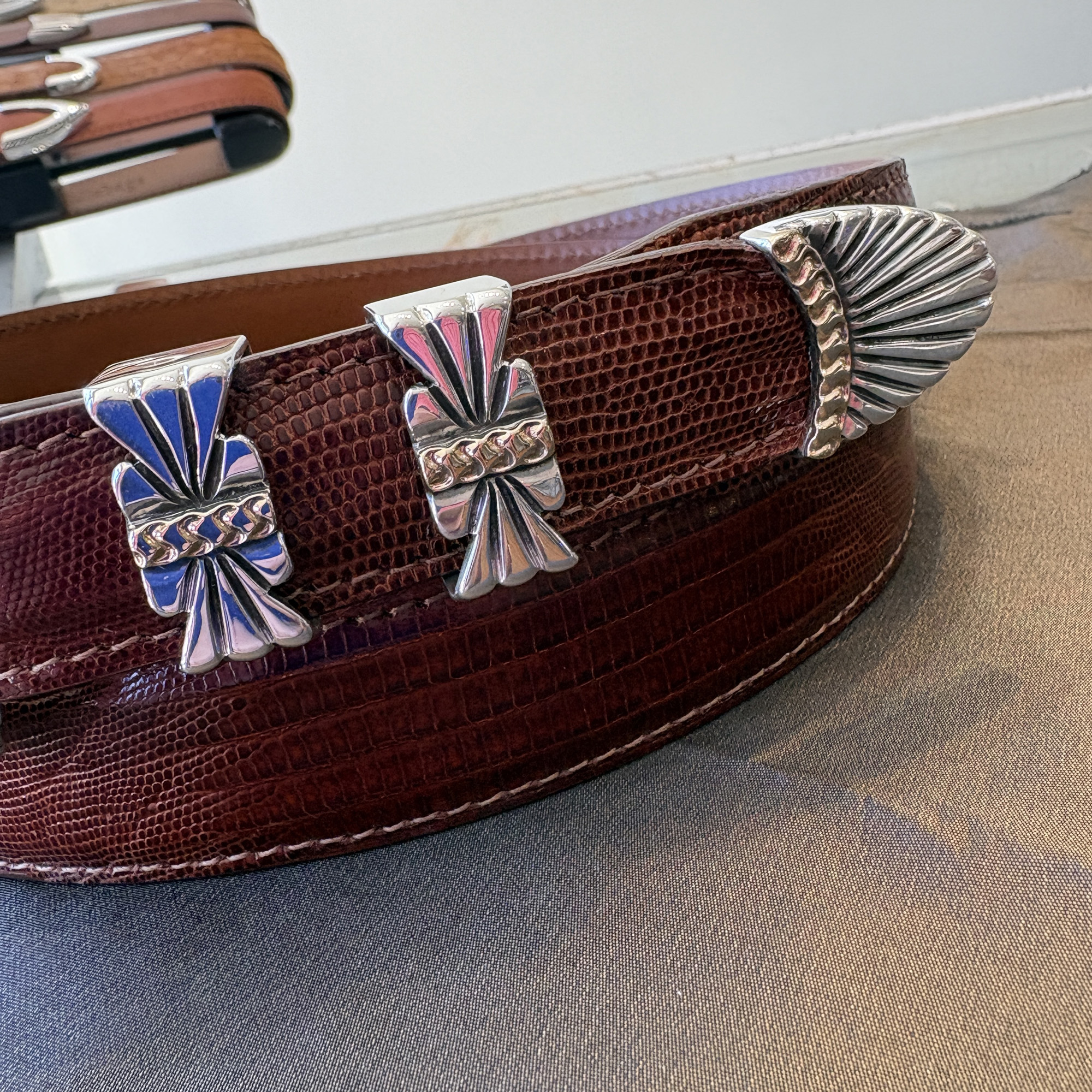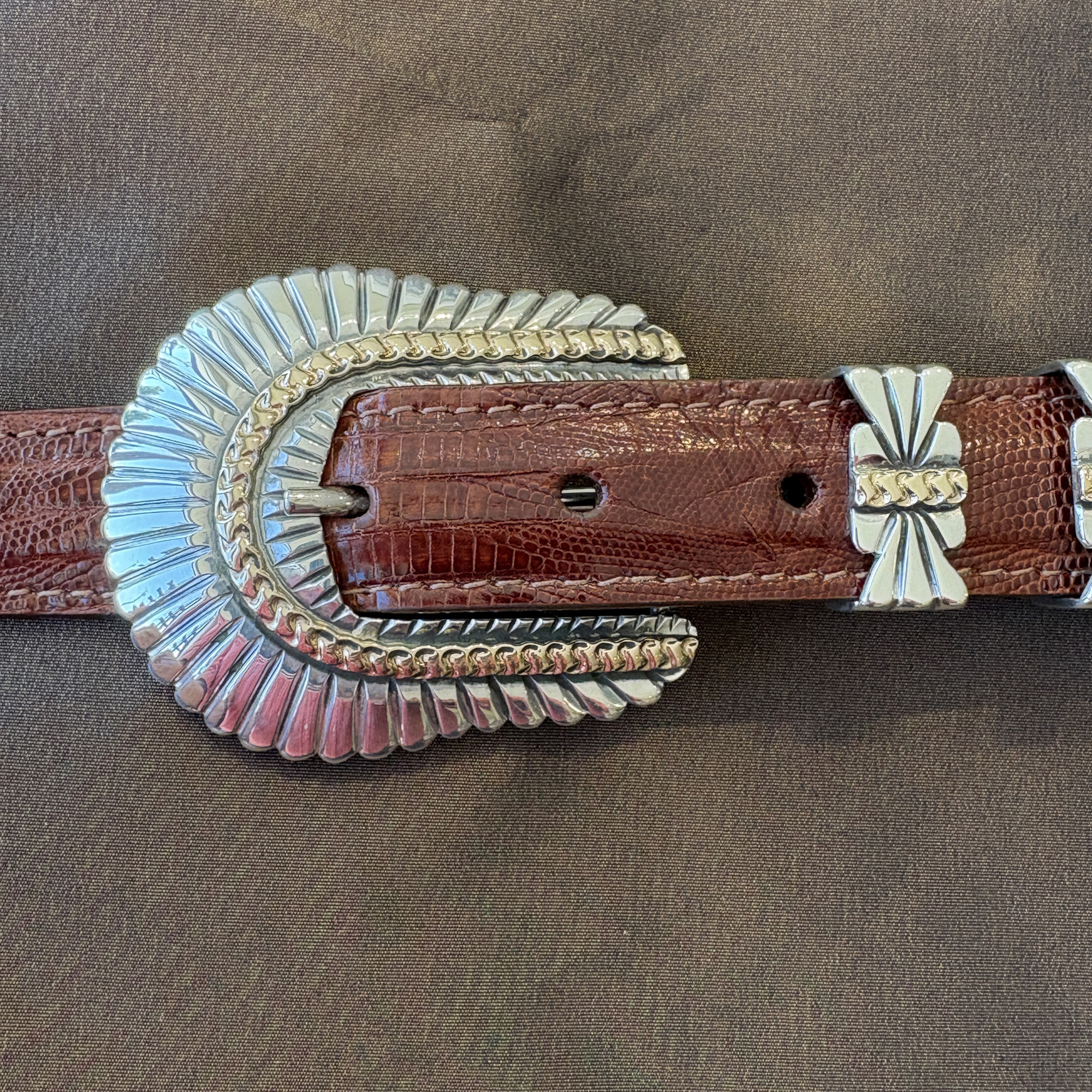 Here is a pre-owned vintage James Reid Ltd. Headdress buckle set. It is pre-owned, however it has been professionally polished up and looks in excellent condition. 14K gold details makes this buckle set an absolute classic. It fits a 1″ strap and is shown here on a cognac lizard belt. There is only one of these so when it is gone, it is gone. A classic piece of Saddlebags history. Good Luck!